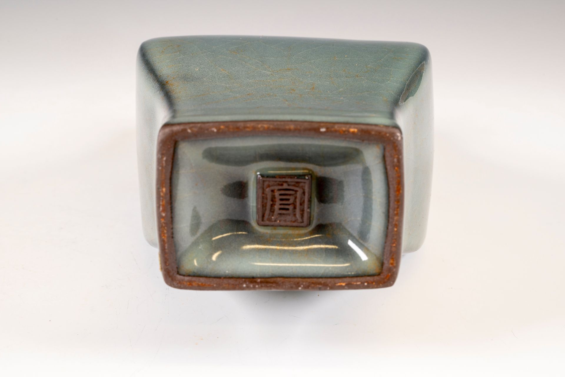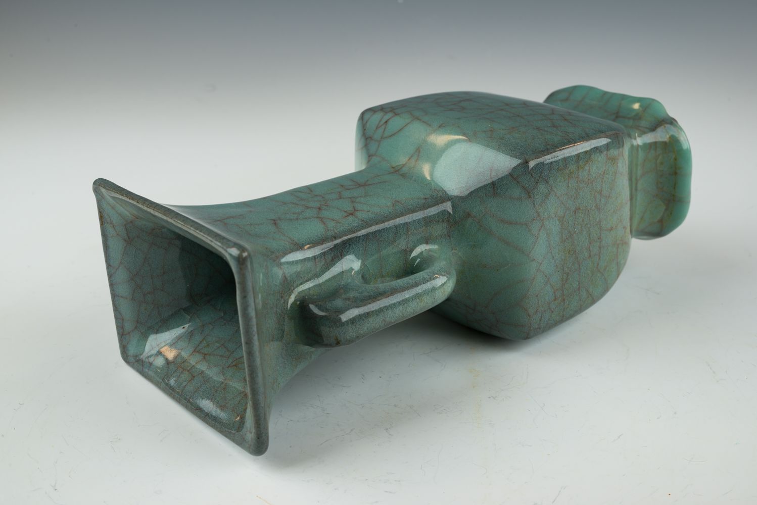 Ce vase exceptionnel à angles biseautés, chef-d'œuvre de la dynastie Song du Sud, est un exemple remarquable de la faïence Guan Yao produite dans le prestigieux four de Xiuneisi durant la période impériale. Façonné dans le four intérieur officiel de Xiuneisi, le vase présente plusieurs couches d'une riche glaçure bleuâtre, subtilement nuancée de vert. Sa texture délicate est rehaussée par une glaçure plus épaisse qui s'accumule à la base, créant un effet visuel saisissant. Caractérisée par une belle translucidité, la surface craquelée de ce vase est ornée de la marque officielle Guan, apposée sur sa base. De plus, la pièce repose sur un pied en fer formé lors de la cuisson et arbore une teinte brun ocre foncé, provenant de l'argile utilisée pour sa fabrication. D'une grande importance historique, ce vase date d'une période marquée par les bouleversements des armées Jin, qui contraignirent la Cour impériale à quitter la dynastie Song du Nord pour Hangzhou en 1127, instaurant ainsi la dynastie Song du Sud. Le vase mesure environ 21,5 cm de hauteur. ppjrs