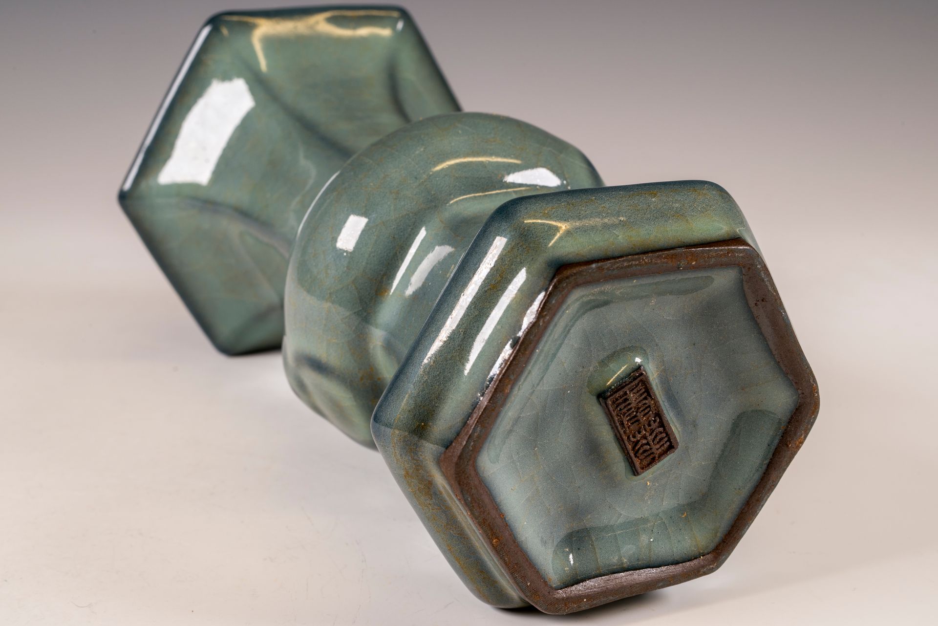 Vase hexagonal Guan à four intérieur, marque et datation officielles de la dynastie Song du Sud, période impériale de la céramique Guan.
