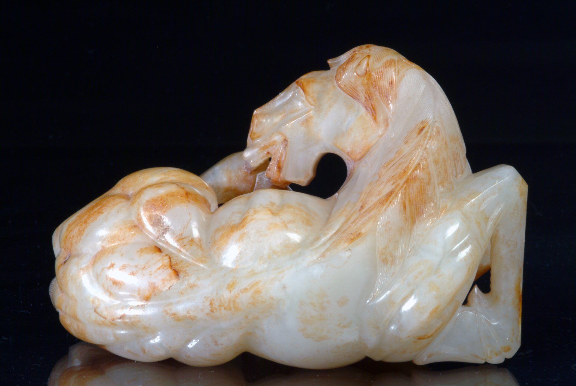 Cette statue exquise et très stylisée d'un cheval couché, taillée dans un jade blanc d'une finesse exceptionnelle, représente l'animal dans une pose dynamique, la tête tournée en arrière tandis qu'il se gratte la patte. Le dessin du cheval se caractérise par des contours anguleux et précis, une musculature prononcée et des plis de peau détaillés qui accentuent son réalisme. Cette pièce unique date de la dynastie Han (206 av. J.-C. à 220 apr. J.-C.). Le jade présente une remarquable translucidité, évoquant un oignon, avec de nombreuses inclusions rousses qui, associées au style de la sculpture, attestent de son importance historique. Le jade étant considéré comme plus précieux que l'or à cette époque, cette statue appartenait probablement à des personnes fortunées. Ses dimensions sont d'environ 10,5 cm de long.