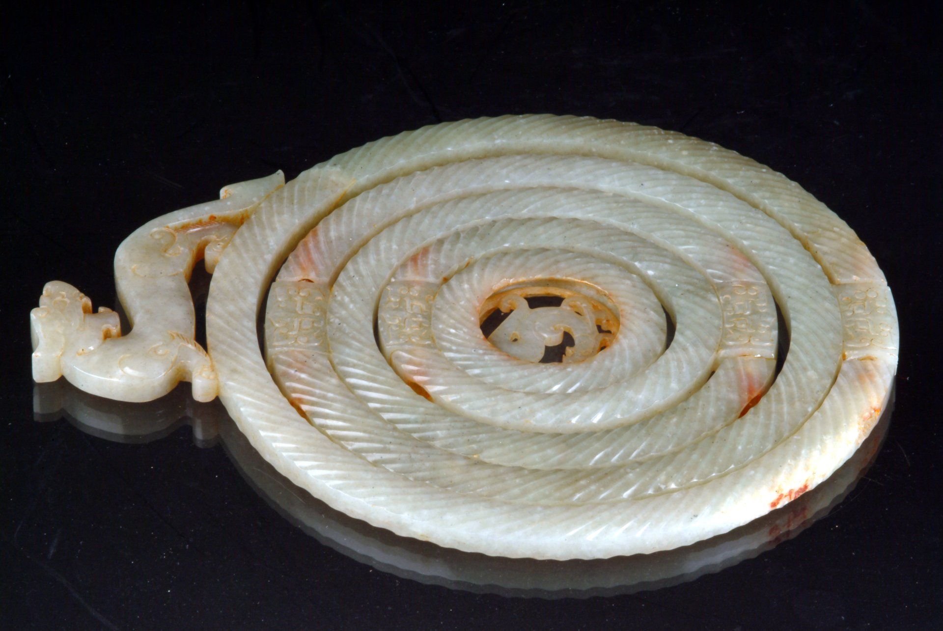 Pendentif cinq anneaux en jade blanc stylisé, représentant un dragon et un phénix, datant de la dynastie Han. Il présente des inclusions rousses et un style de sculpture témoignant de son ancienneté. Le pendentif mesure environ 19 cm fermé et 53 cm ouvert.