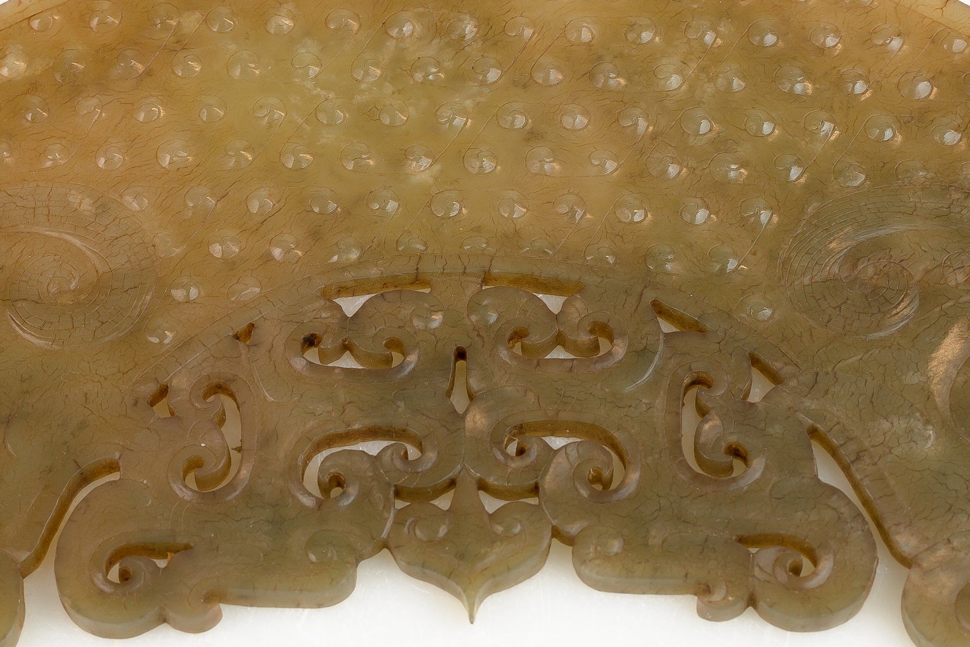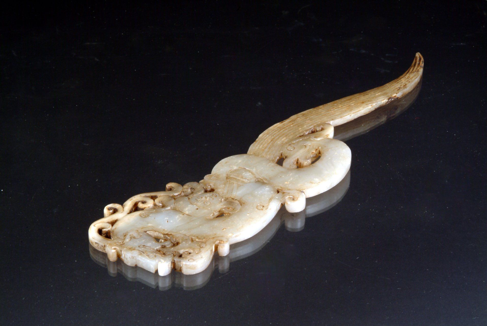 Ce pendentif en jade blanc de la dynastie Han, finement ouvragé et orné d'un motif de dragon et de phénix, se distingue par un style artistique très recherché. Il présente d'importantes inclusions brunâtres calcifiées, ainsi que des teintes verdâtres dues à son enfouissement aux côtés d'objets en bronze. Le style de la sculpture témoigne de son importance historique. Le pendentif mesure environ 16,8 cm fermé et 44,5 cm ouvert.