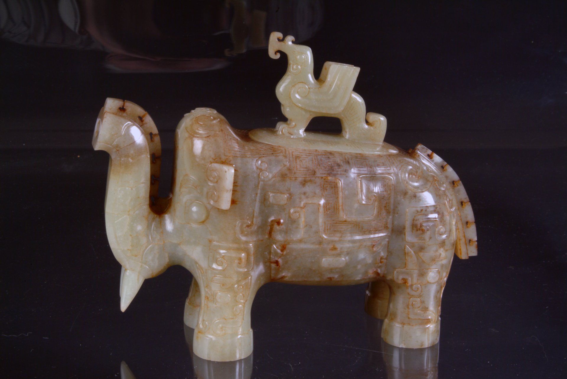 Vase en céladon pâle de jade, datant de la dynastie Zhou orientale (époque des Royaumes combattants), représentant un éléphant stylisé.