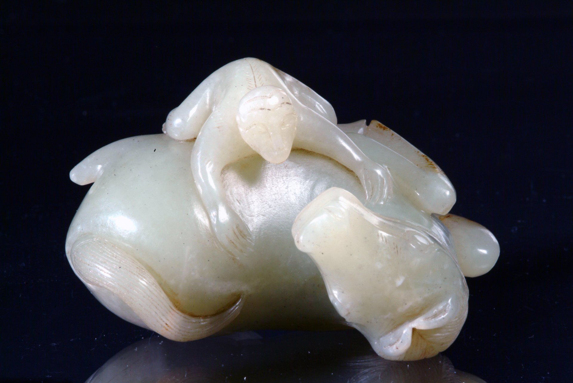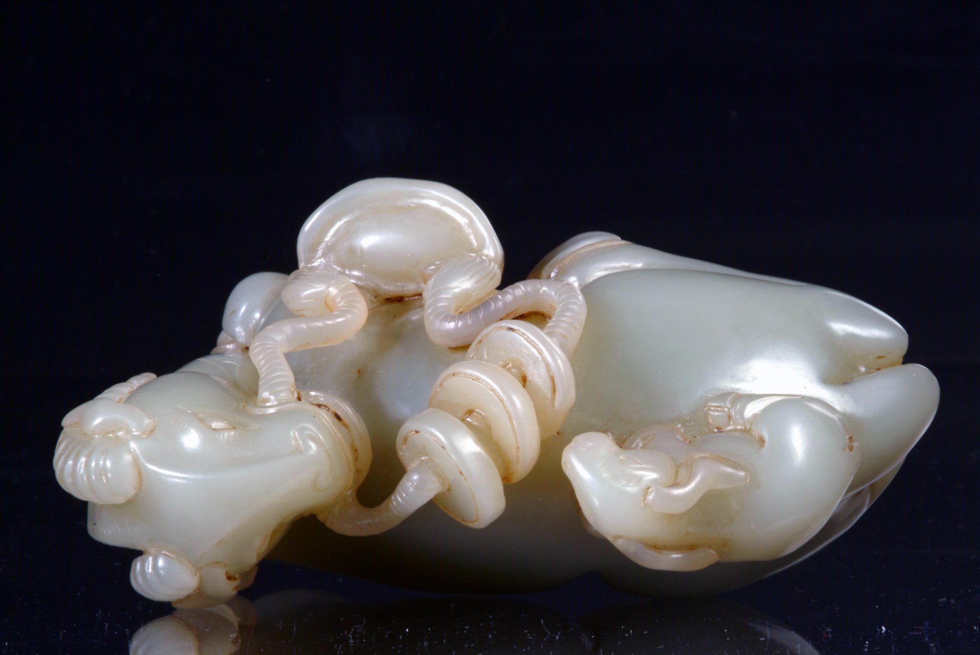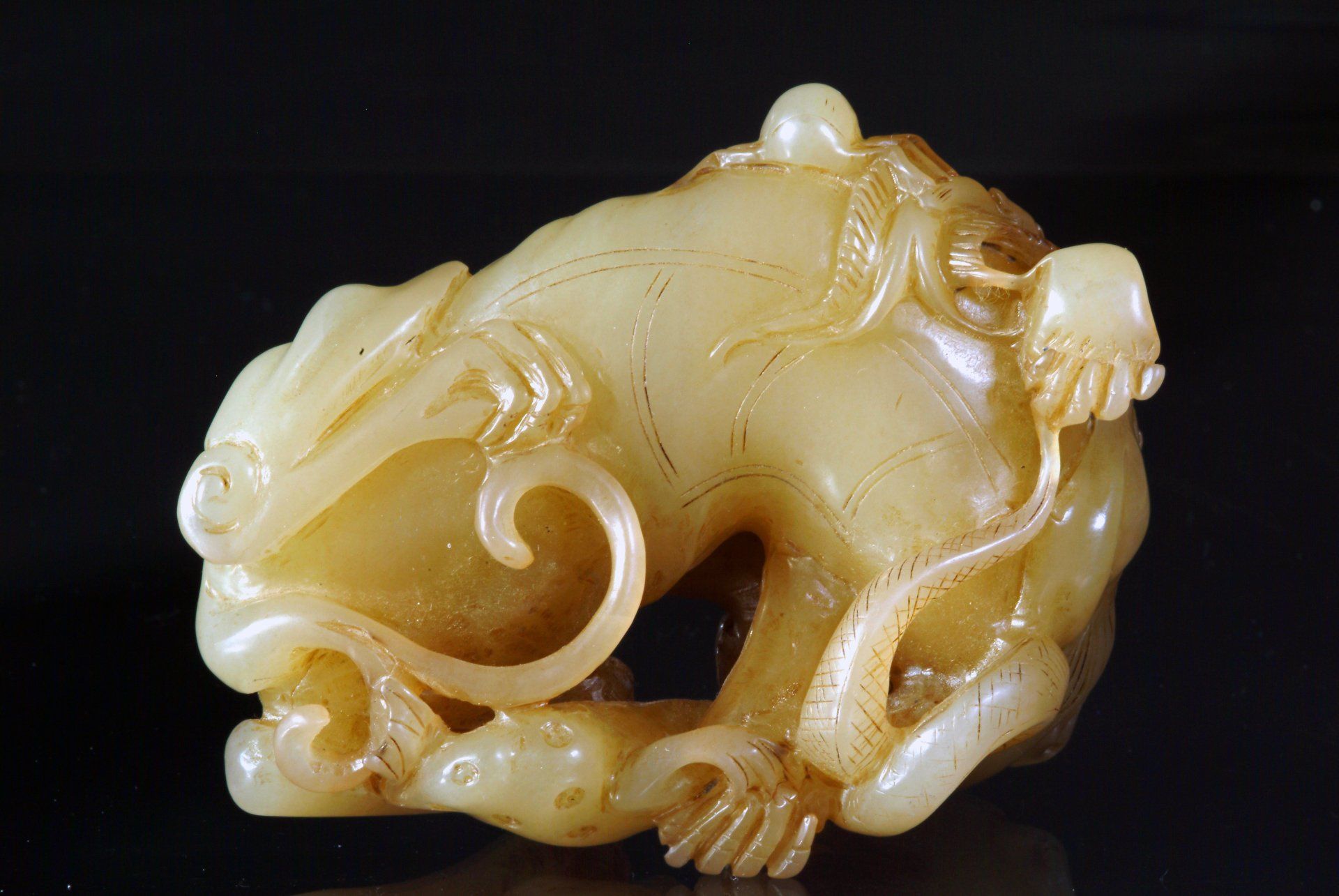 Céladon de jade pâle de la dynastie Ming représentant une créature mythique allongée et les cinq créatures venimeuses