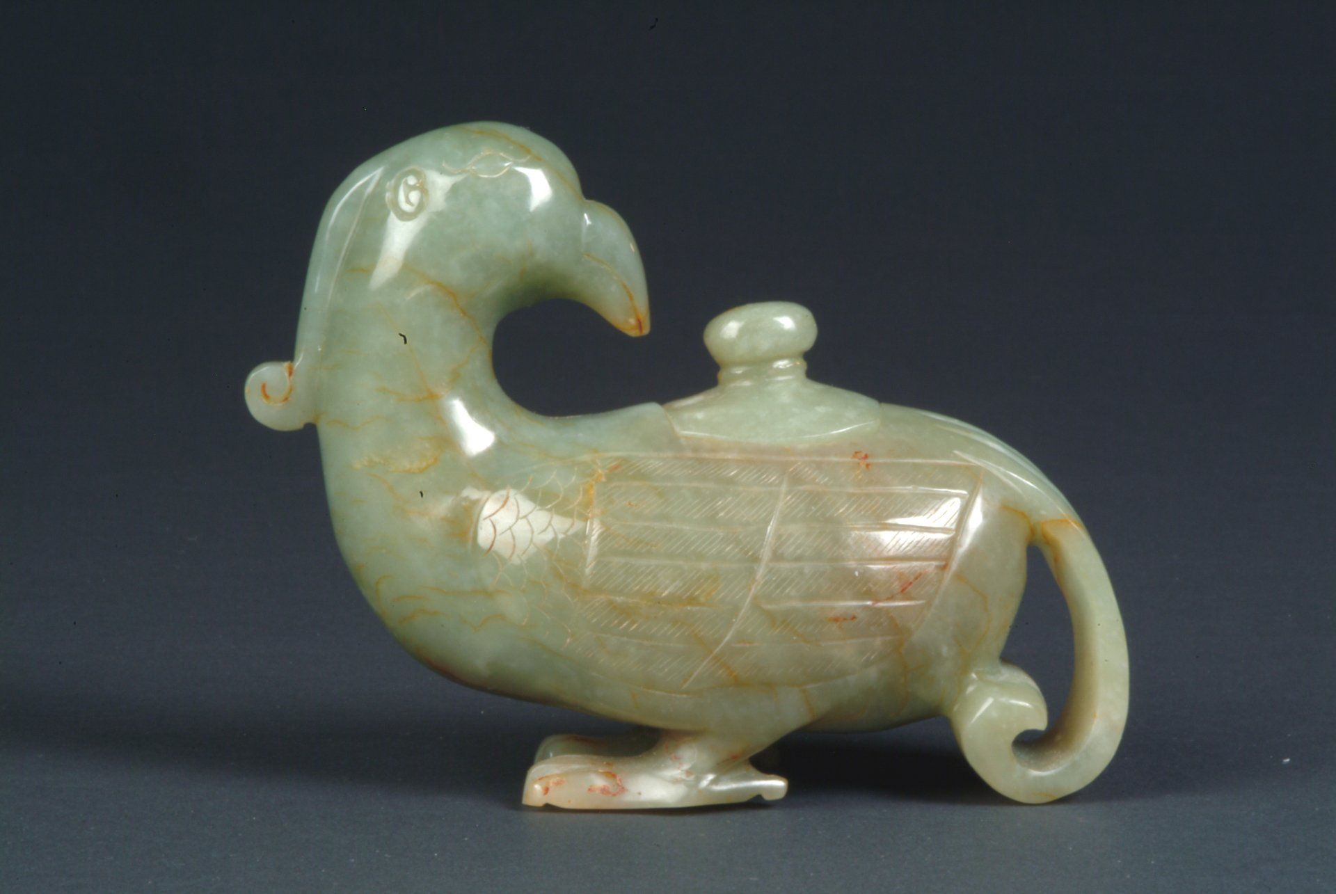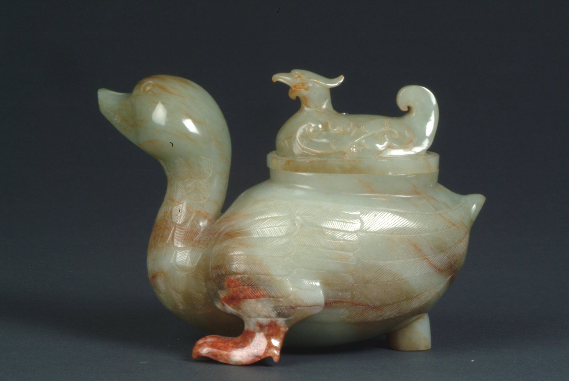 Cette statuette de canard en jade céladon finement sculptée, datant de la dynastie Ming, présente un décor à tête de dragon. Elle révèle des inclusions brunâtres et des veines rousses caractéristiques, confirmant son importance historique. La statuette mesure environ 11,5 cm de haut.