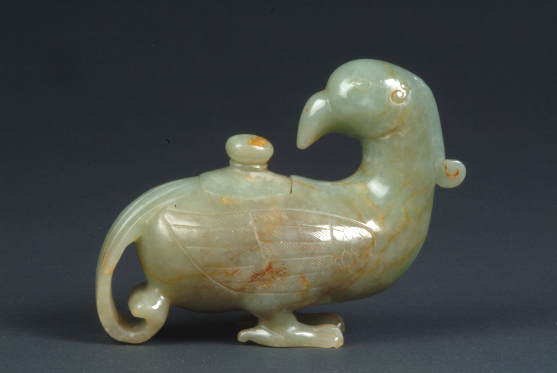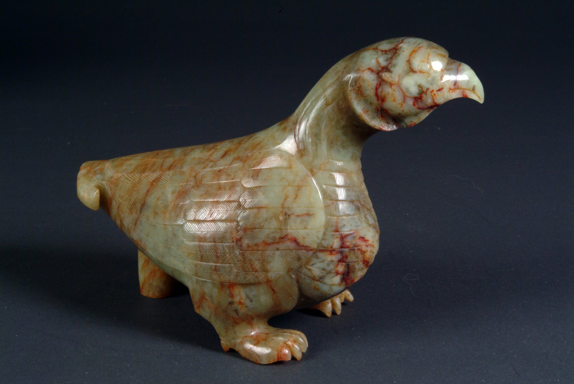 Statue d'oiseau en jade céladon de la dynastie Ming, présentant un orteil ébréché. La pièce révèle d'importantes inclusions brunes et rousses, tandis que la finesse de sa sculpture atteste de son ancienneté. La statue mesure [dimensions manquantes].