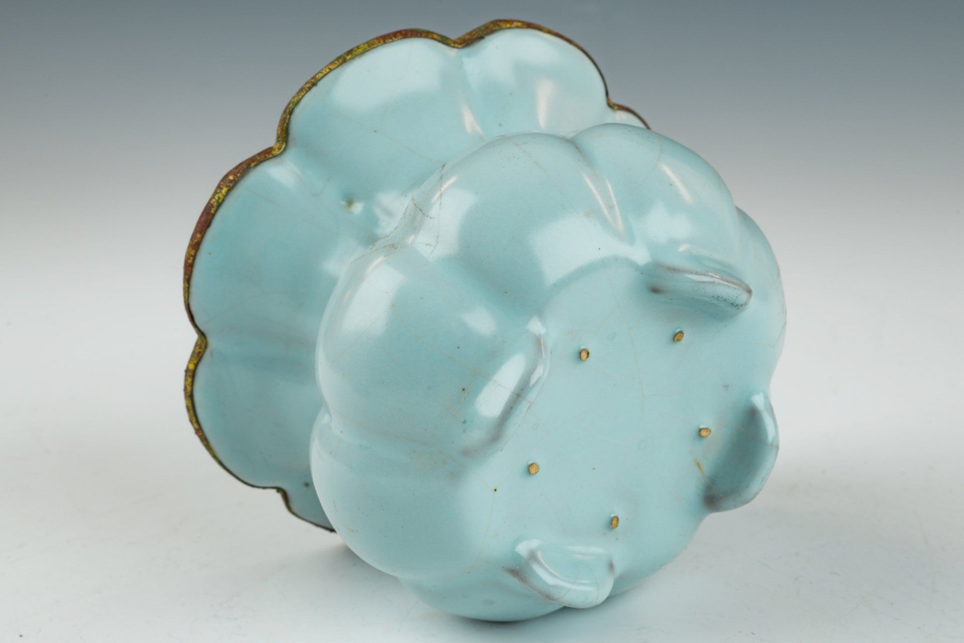 Ce vase d'une finesse exceptionnelle, datant de la dynastie Song du Nord, présente un décor raffiné et une glaçure évoquant le ciel après la pluie. Il illustre parfaitement la forme lobée, caractéristique des vases impériaux en céramique Ru, offerts en tribut à l'Empereur et à sa Cour. Réalisé spécialement en hommage à l'Empereur et à sa Cour, ce vase est orné de bandes de cuivre doré à la feuille, tant sur le bord que sur la base. On y observe notamment une corrosion stratifiée de cuprite rougeâtre et de malachite botryoïde verte, soulignant son importance historique. L'analyse microscopique a confirmé l'absence d'agate dans la glaçure, tandis que la bande de cuivre doré révèle une détérioration visible de la cuprite et de la malachite botryoïde, attestant ainsi de son ancienneté. Ces preuves sont considérées comme plus fiables qu'un test de thermoluminescence (TL) et sont couramment utilisées par les experts pour authentifier les objets ; leur fiabilité surpasse celle des tentatives de fabrication. Le vase est orné d'une glaçure gris-bleu aux reflets verdâtres, présentant un fin craquelé. La texture de la glaçure est remarquablement lisse, confirmant l'absence d'agate. La base présente des marques en forme d'éperon de cinq minutes, chacune de la taille d'une graine de sésame. Cette pièce remarquable mesure environ 17 cm de hauteur et provient du trésor de l'empereur Huizong. Elle témoigne de la grandeur de l'art de la céramique impériale Ru de la dynastie Song du Nord.