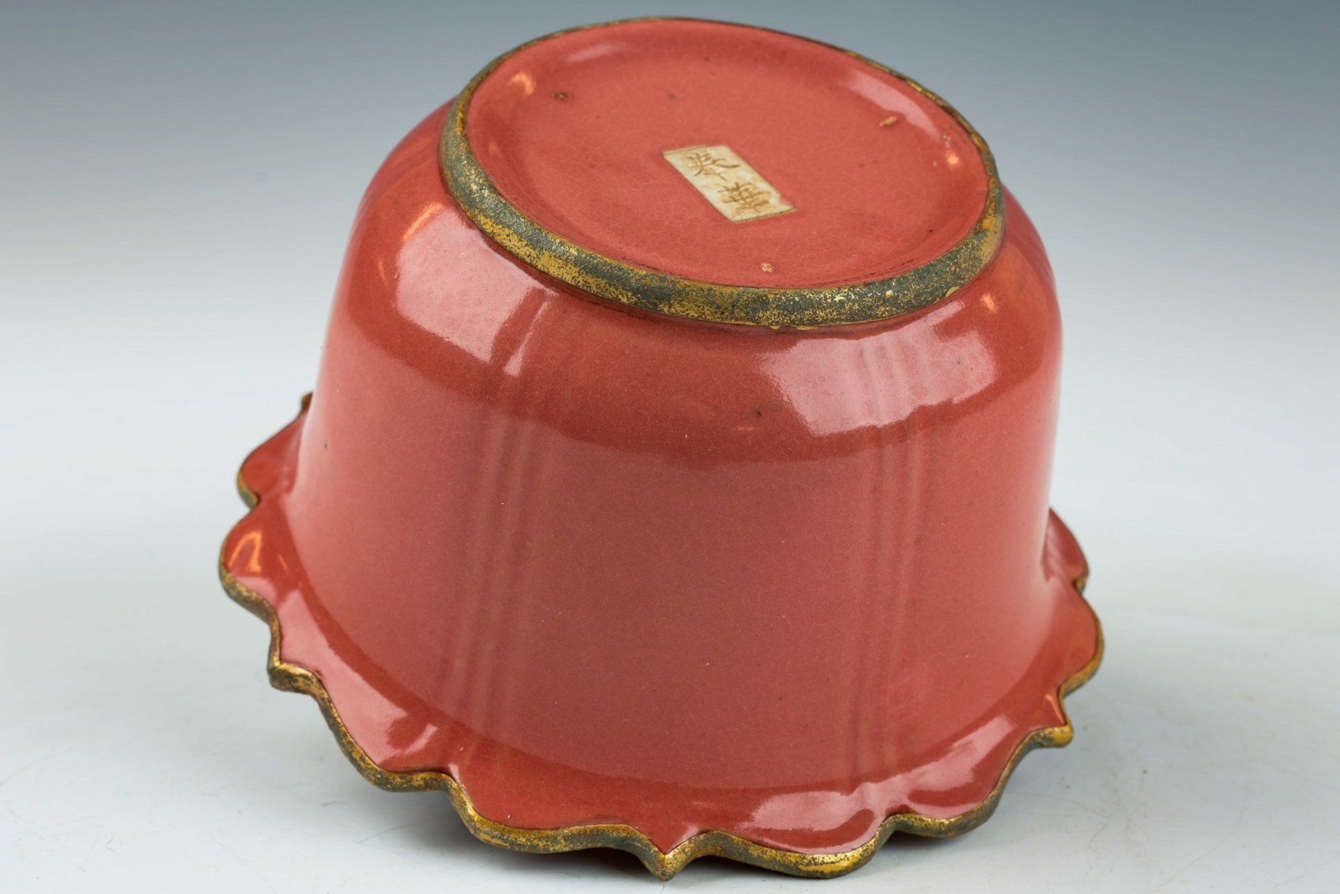 Ce bol en faïence rouge à glaçure Ru, datant de la dynastie Song du Nord, est un exemple exceptionnel de savoir-faire et d'importance historique. Conçu comme bol d'offrande pour l'empereur et sa cour, il présente des bandes de cuivre doré au feu, appliquées avec minutie sur le bord et le fond. Ces bandes révèlent une corrosion stratifiée de cuprite rougeâtre et de malachite botryoïde verte, témoignant de l'ancienneté et de l'authenticité du bol. L'absence d'agate dans la glaçure, confirmée par des photographies microscopiques, atteste de son authenticité – une méthode jugée par les experts plus fiable et moins susceptible d'être contrefaite que le test de thermoluminescence (TL). La glaçure rouge du bol présente un craquelé fin visible à la loupe, associé à une texture lisse exempte d'inclusions d'agate. Le fond du bol est marqué de trois petites marques en forme d'éperon, de la taille de graines de sésame, et porte une inscription gravée indiquant qu'il s'agissait d'un hommage. Ce remarquable bol mesure environ 14 cm de diamètre. Cet artefact est un vestige remarquable de la précieuse collection de céramiques Ru impériales de la dynastie Song du Nord ayant appartenu à l'empereur Huizong.