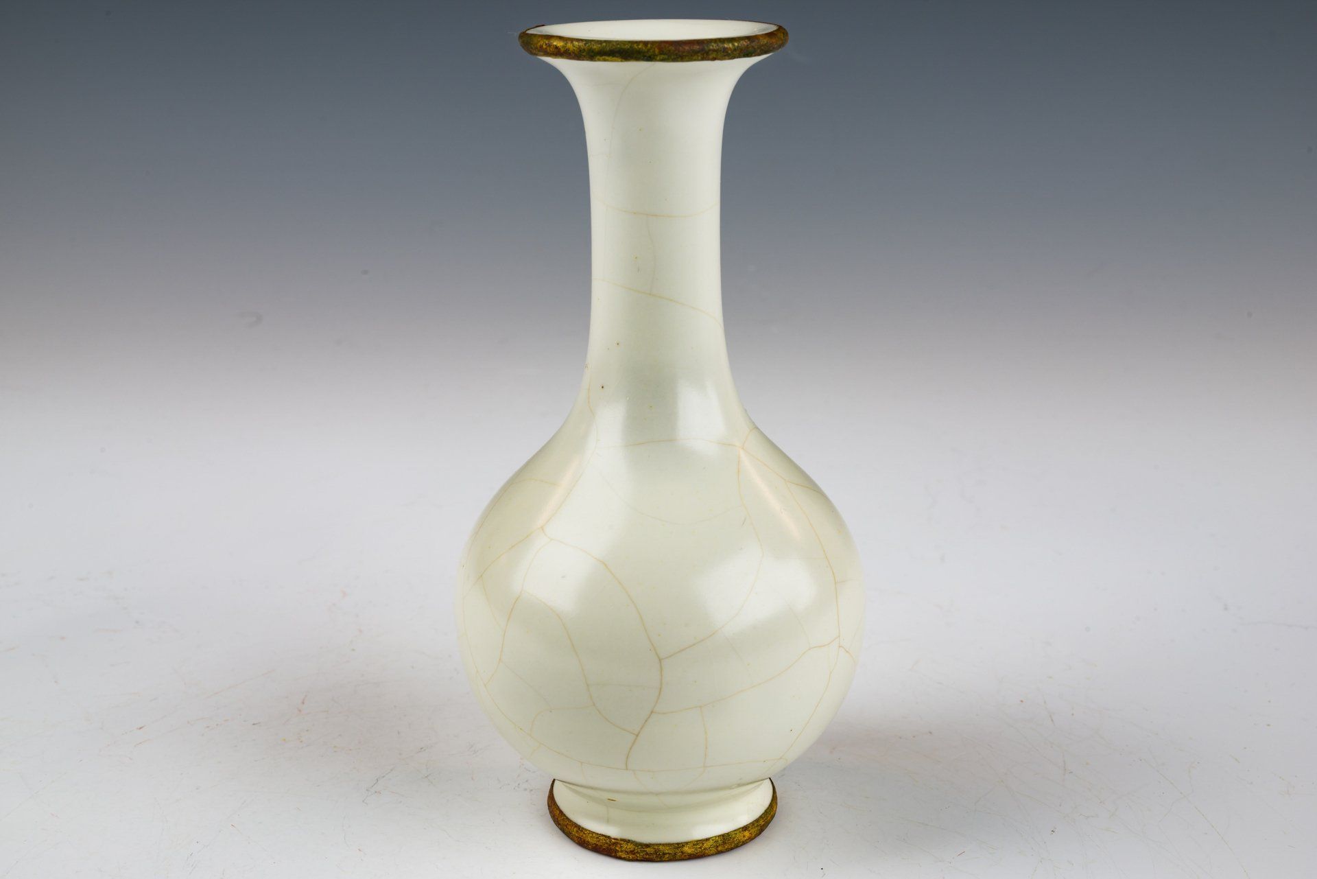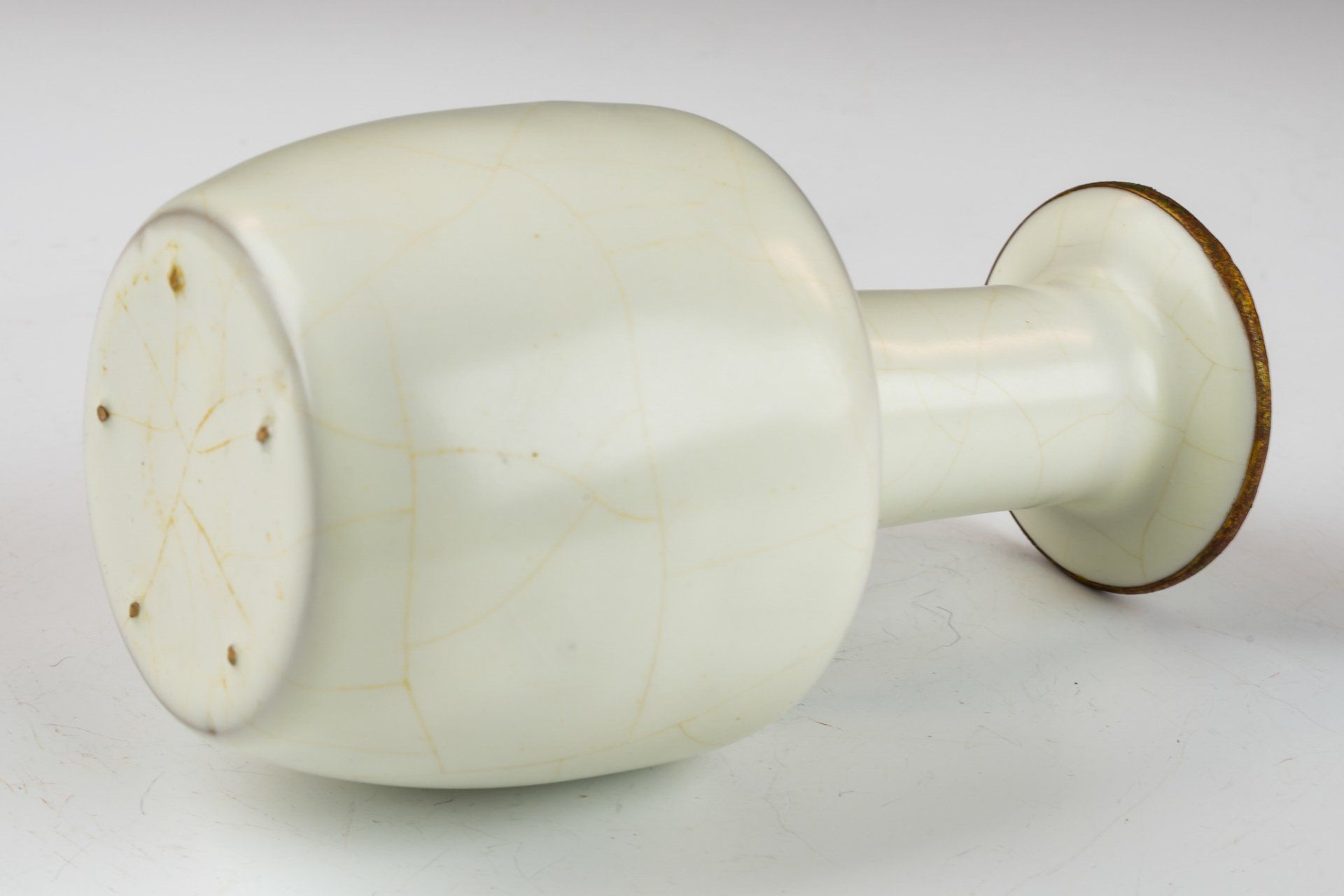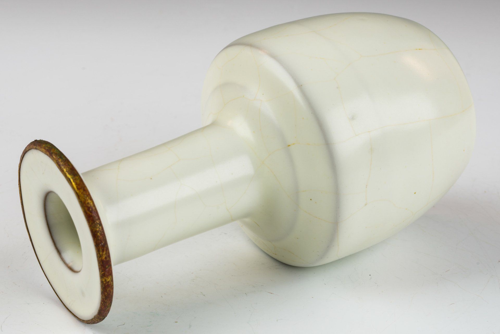 Ce vase Ru-ware d'une finesse exceptionnelle, façonné en forme de maillet, présente une glaçure d'un blanc lunaire remarquablement doux et lisse, exempte de toute agate. Il est élégamment orné d'une fine bande de cuivre doré à la feuille qui encercle le bord. Il est important de noter que toutes les pièces Ru-ware ornées de bandes dorées à la feuille sont considérées comme des pièces de tribut, historiquement offertes à l'Empereur et à sa cour. La bande dorée présente de légères traces de nettoyage, révélant une corrosion stratifiée de cuprite rougeâtre et de malachite verte, témoignant de l'ancienneté de la pièce. Les photographies microscopiques jointes confirment l'absence d'agate dans la glaçure, tandis que la corrosion visible sur la bande dorée constitue un gage d'authenticité fiable, considéré comme supérieur aux tests de thermoluminescence (TL) par les experts. Cette authenticité est inimitable. De plus, le vase porte des marques d'éperon de cinq minutes, de forme et de taille régulières, semblables à des graines de sésame. Mesurant environ 18 cm de haut, cette pièce est une relique remarquable de la collection survivante de céramiques impériales Ru de la dynastie Song du Nord ayant appartenu à l'empereur Huizong. ppjrs