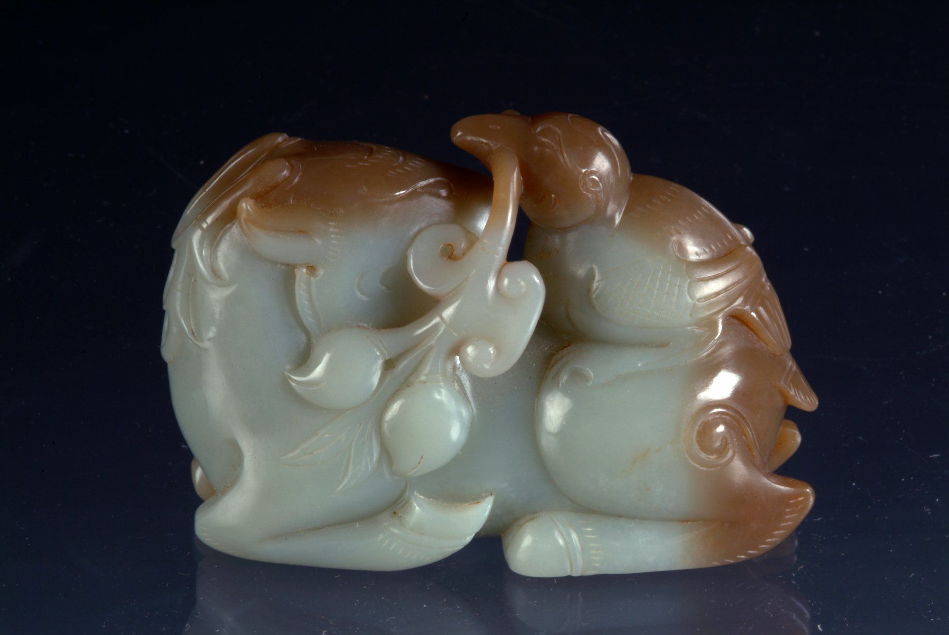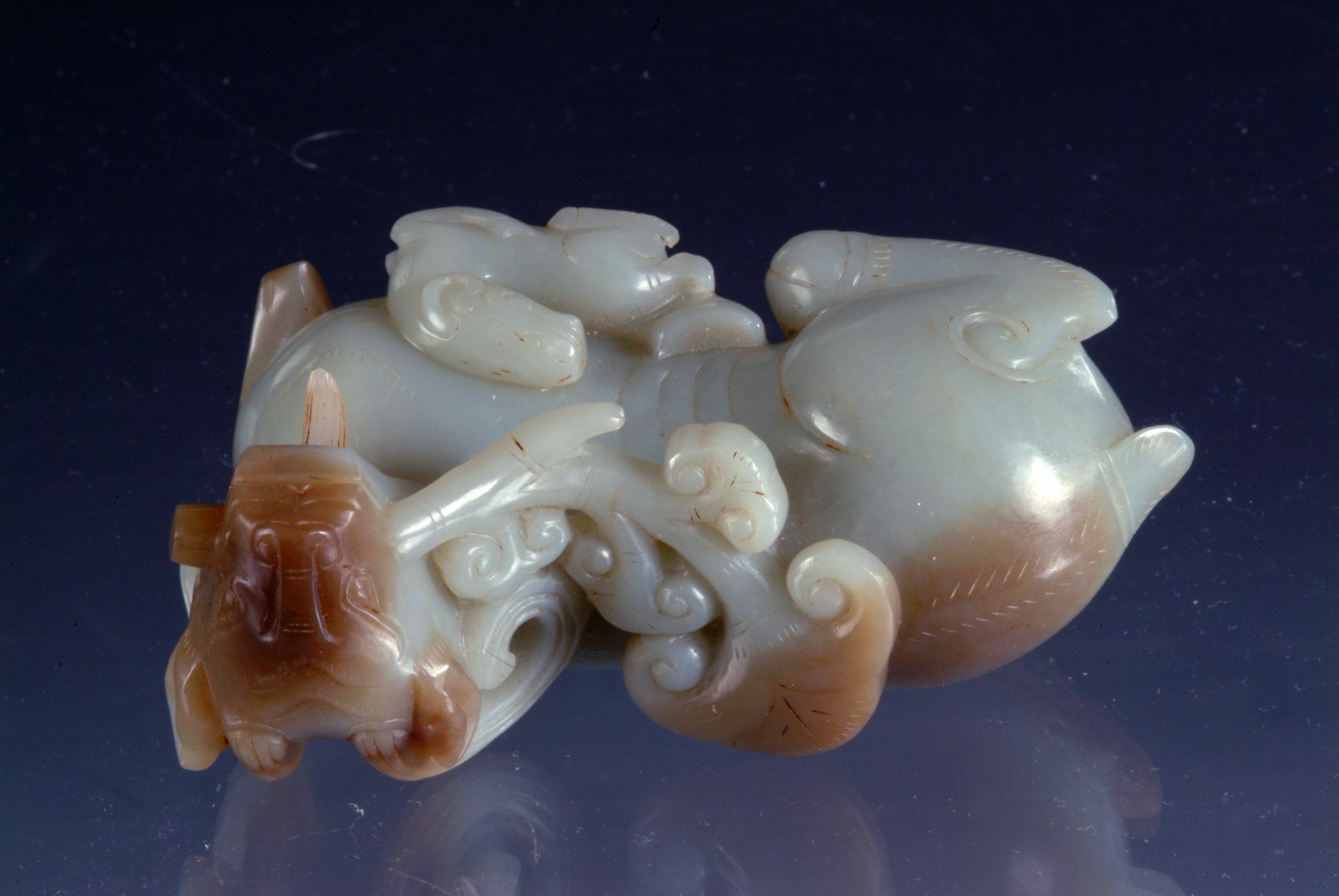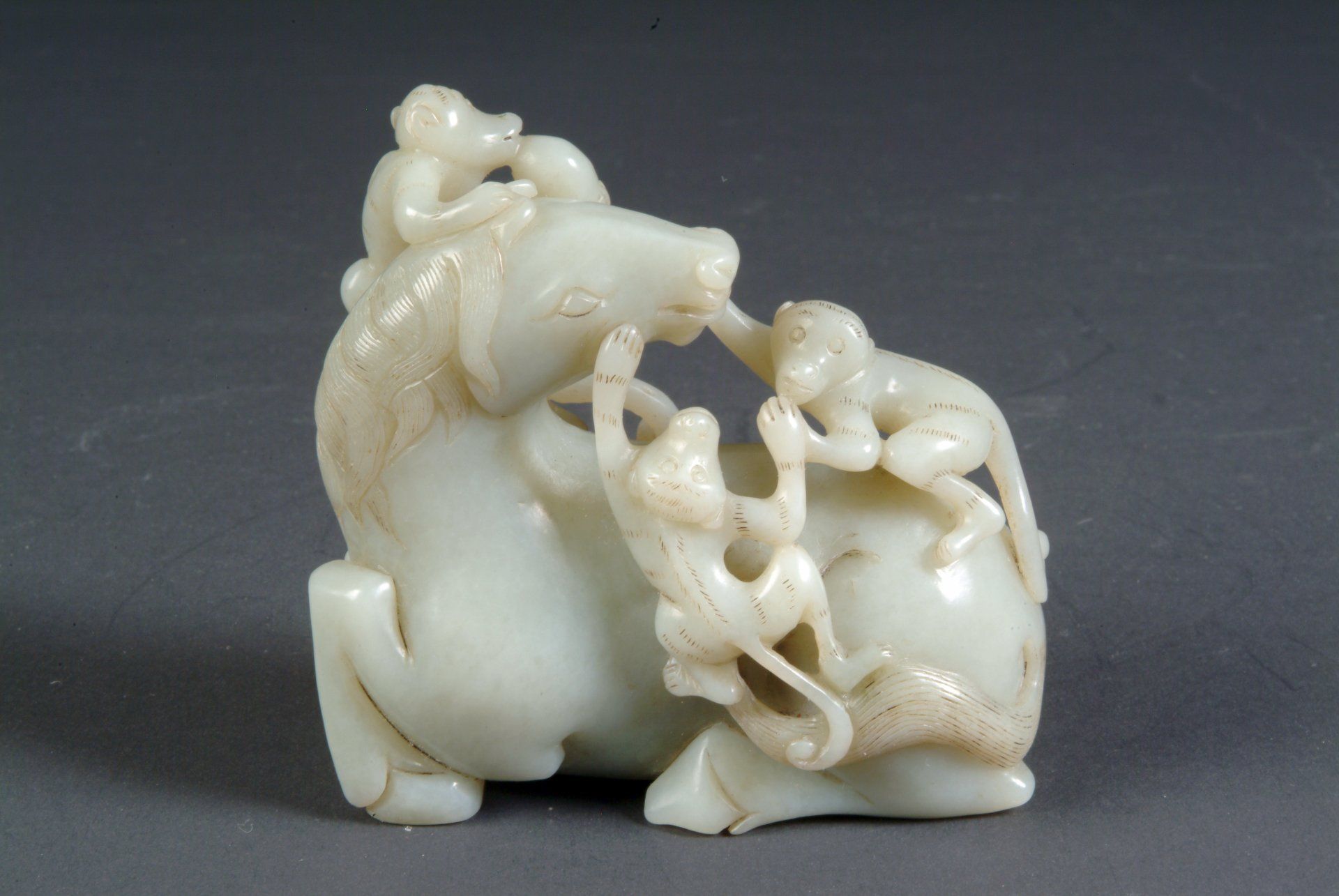 Sculpture en jade blanc grisâtre représentant un cheval accompagné d'un singe, datant des Six Dynasties.
