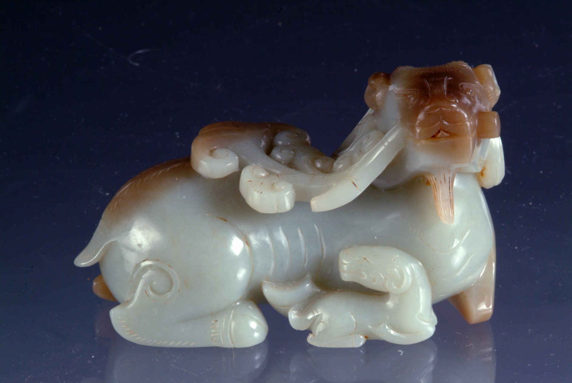 Statue d'un bélier couché avec ses petits, en jade gris-verdâtre, datant de la période des Six Dynasties.