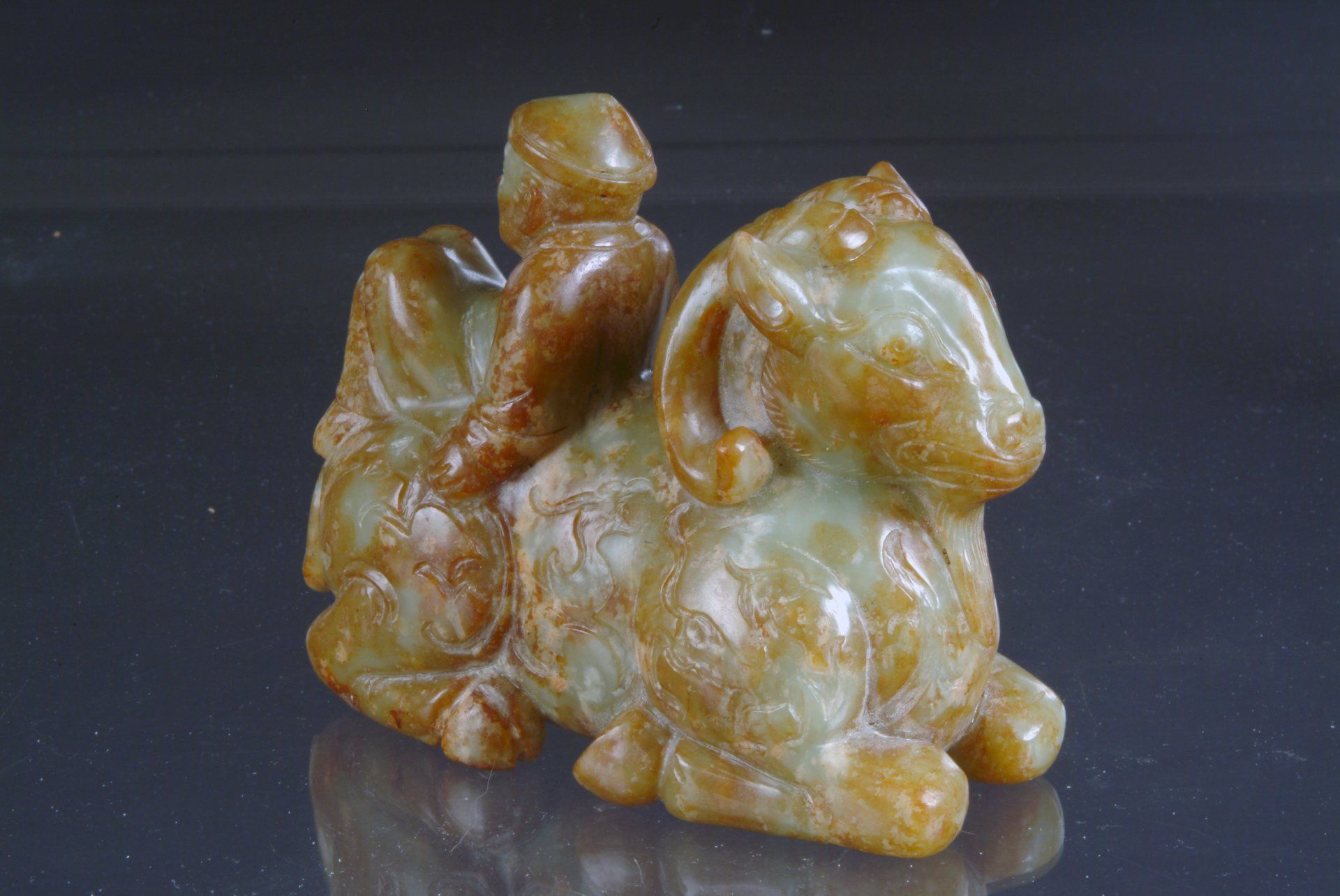 Cette statue en céladon de jade, datant de la période des Six Dynasties et finement ouvragée, représente un bélier au repos avec un cavalier et présente d'importantes inclusions rousses. La finesse de sa sculpture atteste de son ancienneté. La statue mesure [dimensions manquantes].