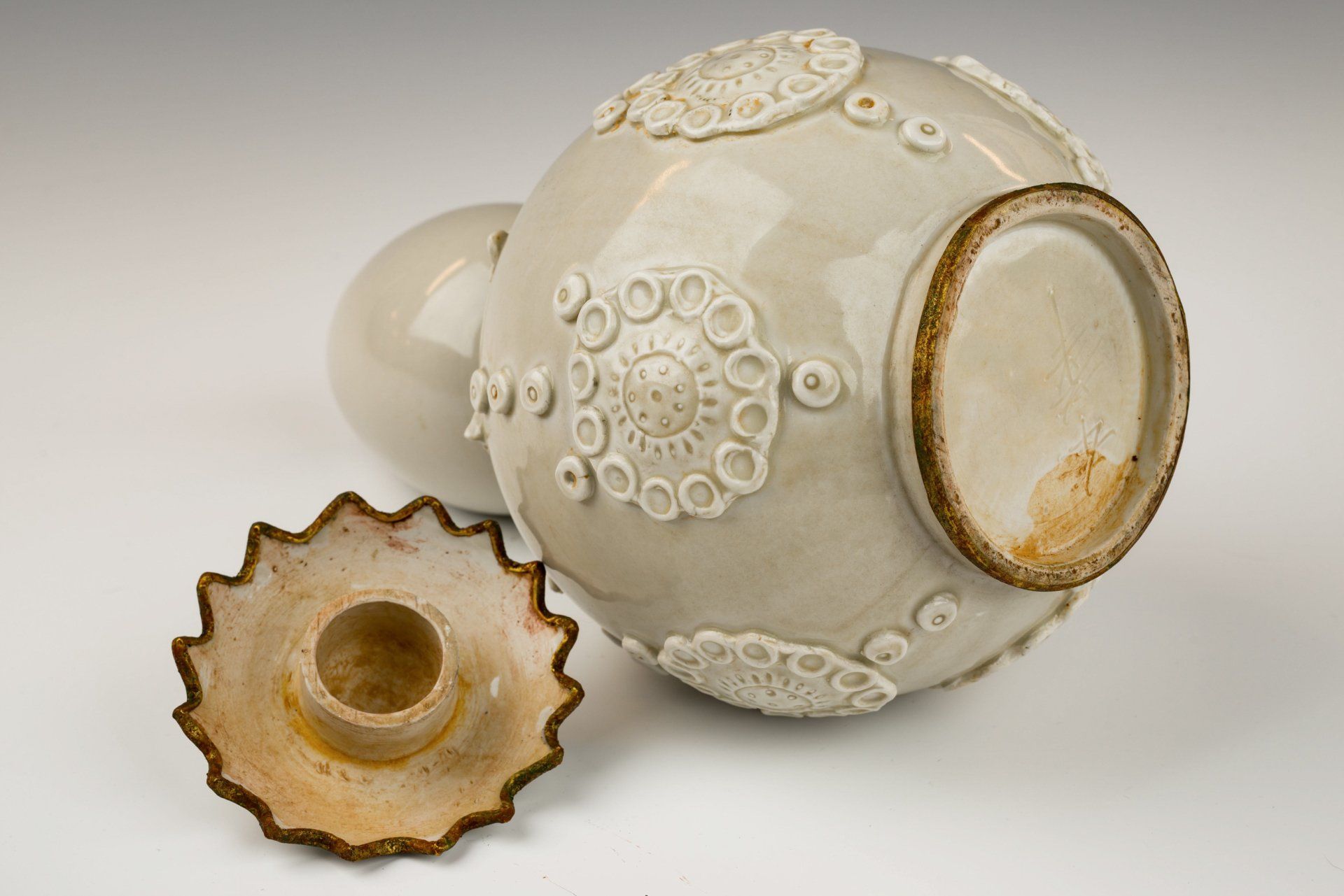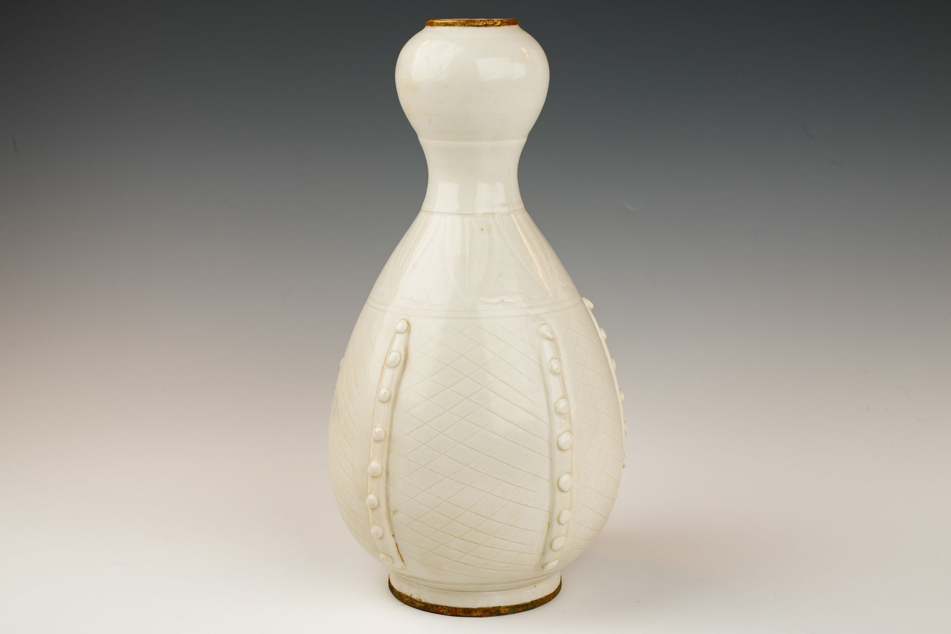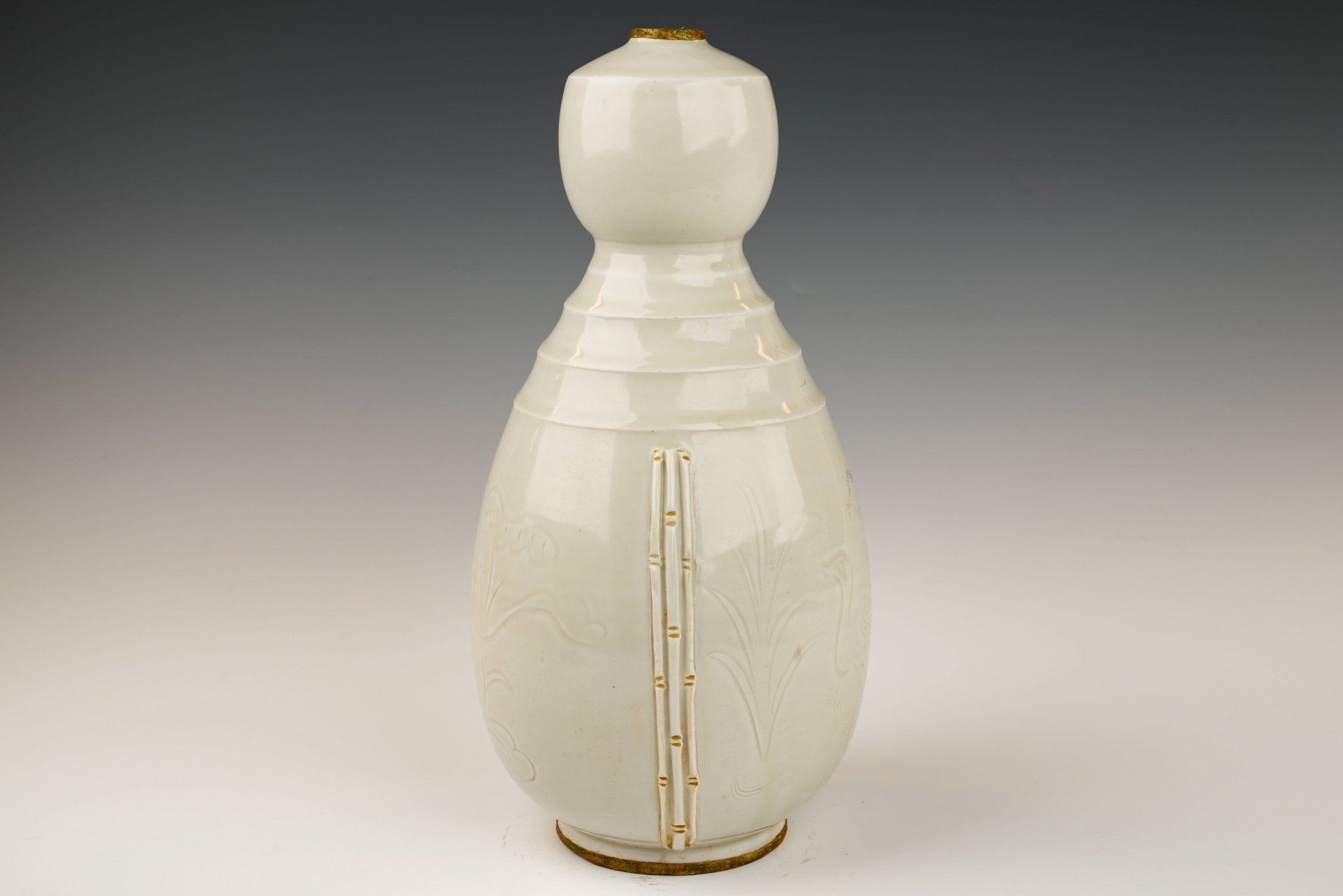 Bouteille impériale double en forme de gourde, en céramique blanche de type Ding Kiln, datant de la dynastie Song. Son corps est orné de feuilles, de fleurs et de bourgeons finement ciselés, et son couvercle est également en forme de feuille. La bouteille est recouverte d'une glaçure transparente couleur ivoire sur un fond blanc cassé, présentant des stries distinctes. Les bandes dorées au feu qui entourent le couvercle et la base sont poreuses et présentent une corrosion stratifiée de cuprite rougeâtre et de malachite botryoïde verdâtre, témoignant de son ancienneté. Cette corrosion constitue une méthode d'authentification plus fiable que la thermoluminescence (TL), ce qui lui vaut la confiance des experts pour la vérification des artefacts. De plus, la présence de la bande dorée au feu atteste qu'il s'agit d'une pièce de tribut. La bouteille mesure environ 28 cm de haut.