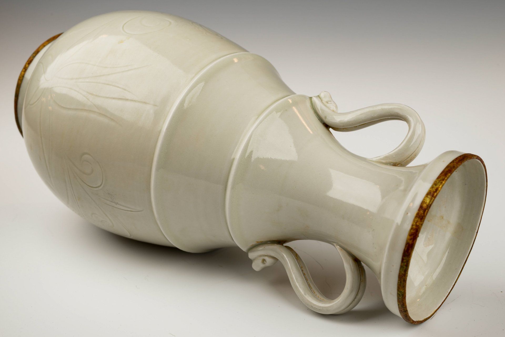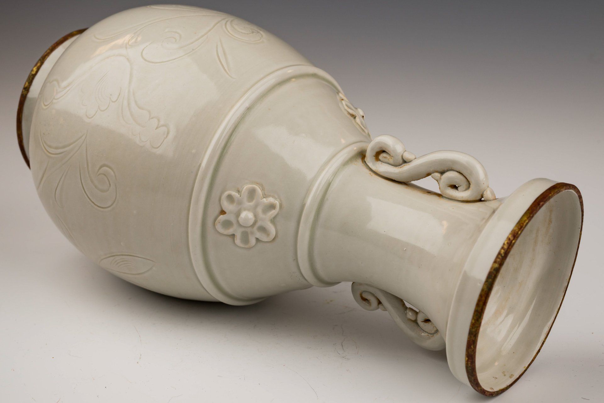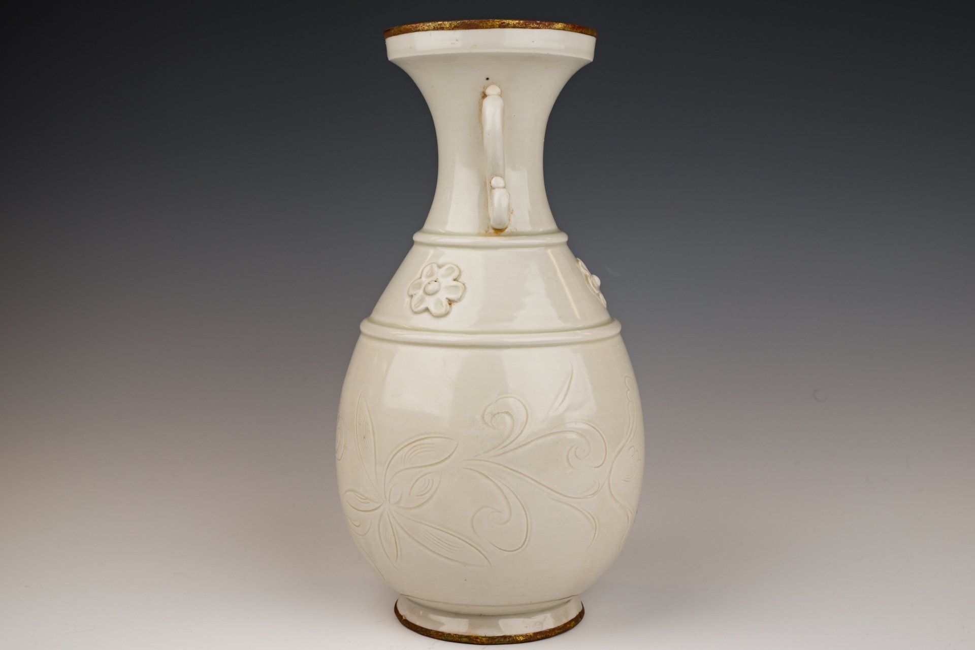 Vase impérial en céramique blanche de la dynastie Song du Nord, cuit au four Ding. Ce vase présente des fleurs élégamment fixées et des anses ornées de motifs floraux finement incisés. Sa glaçure transparente ivoire recouvre un fond blanc cassé, révélant des traces de coulures témoignant de sa qualité artisanale. Les bandes dorées au feu qui encerclent le bord et la base sont poreuses et présentent de subtiles couches de cuprite rougeâtre et de malachite botryoïde verdâtre, attestant de son ancienneté. Ce type de corrosion constitue un indicateur d'authenticité plus fiable que les tests de thermoluminescence, un fait reconnu par les experts en authentification d'objets anciens. Ce vase porte une marque distinctive et sert non seulement de récipient fonctionnel, mais aussi de pièce de mémoire, comme en témoignent ses bandes dorées raffinées. Il mesure environ 27,3 cm de hauteur.