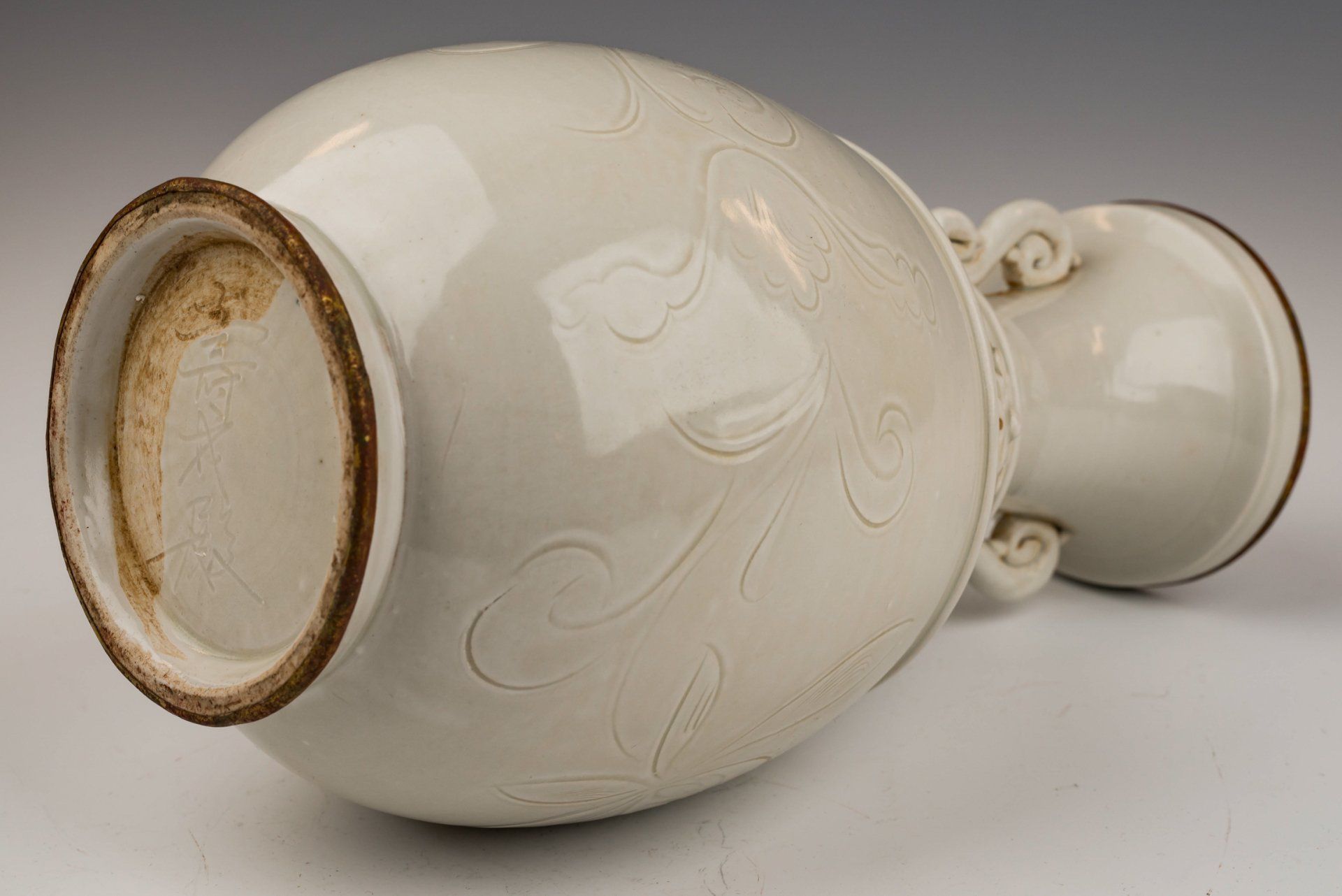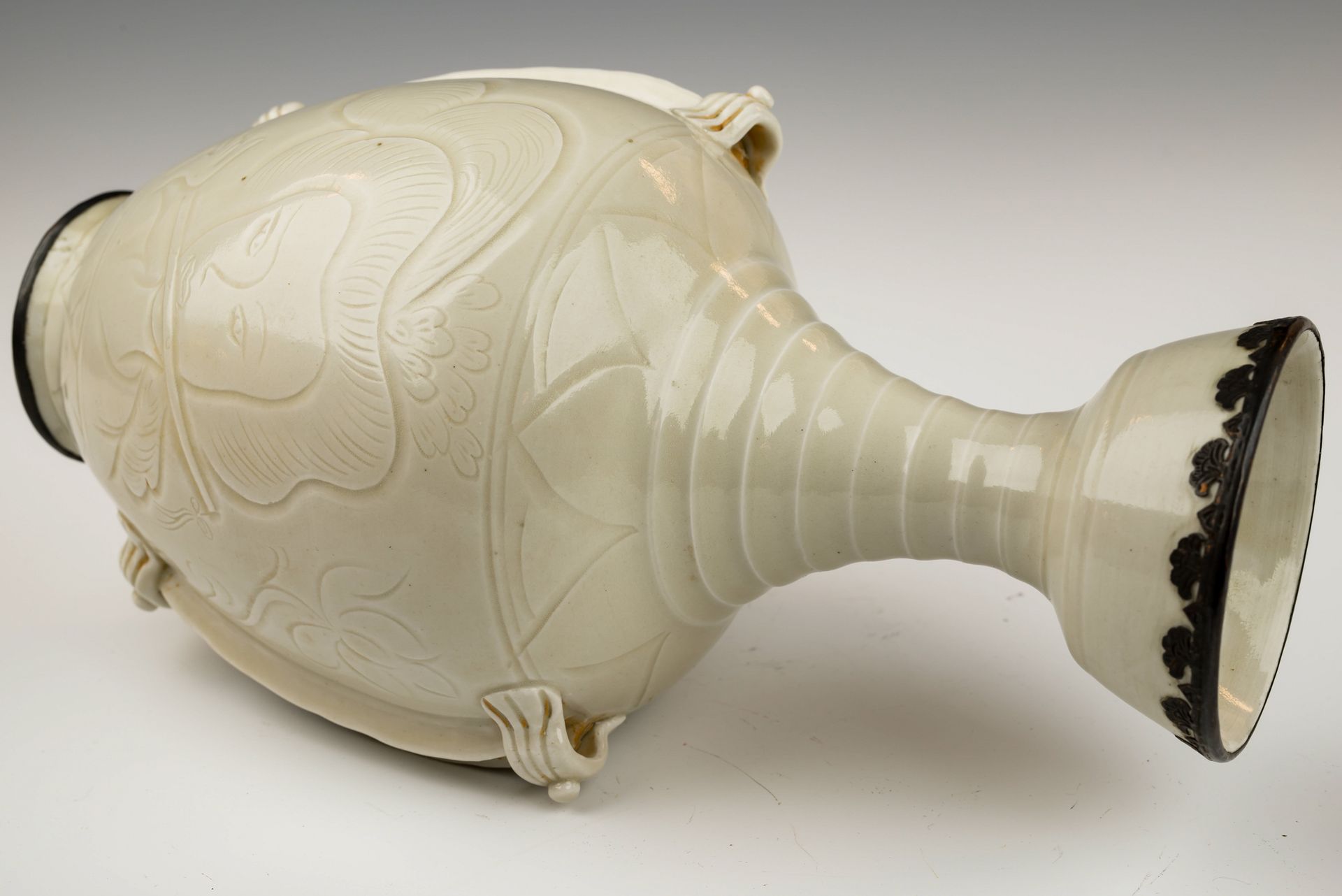 Vase impérial en céramique blanche, fabriqué au four Ding sous la dynastie Song du Nord. Ce vase se distingue par son élégant décor de visages féminins et de fleurs de lotus incisés, ainsi que par ses deux anses. Il est orné d'une glaçure ivoire translucide appliquée sur un fond blanc cassé présentant de subtiles stries, gage d'authenticité. Deux bandes d'argent, à la patine noire caractéristique, soulignent le bord et la base. Ce vase, probablement une pièce de tribut, porte le caractère incisé « guan » à sa base, attestant de son origine officielle. Ses dimensions sont d'environ 28,3 cm de hauteur.