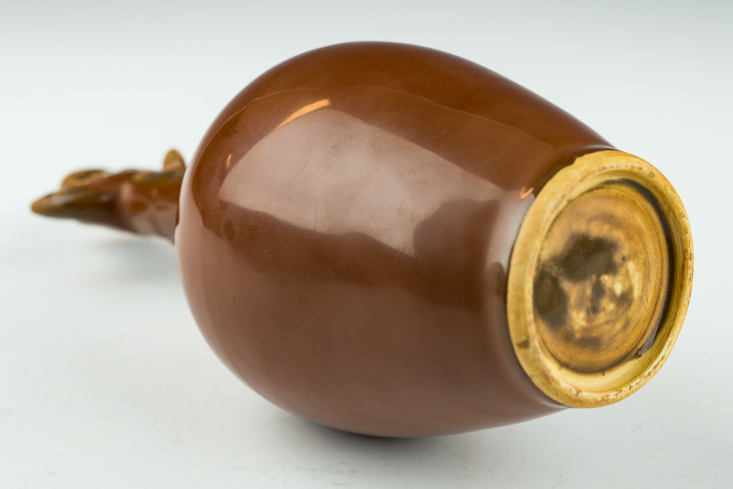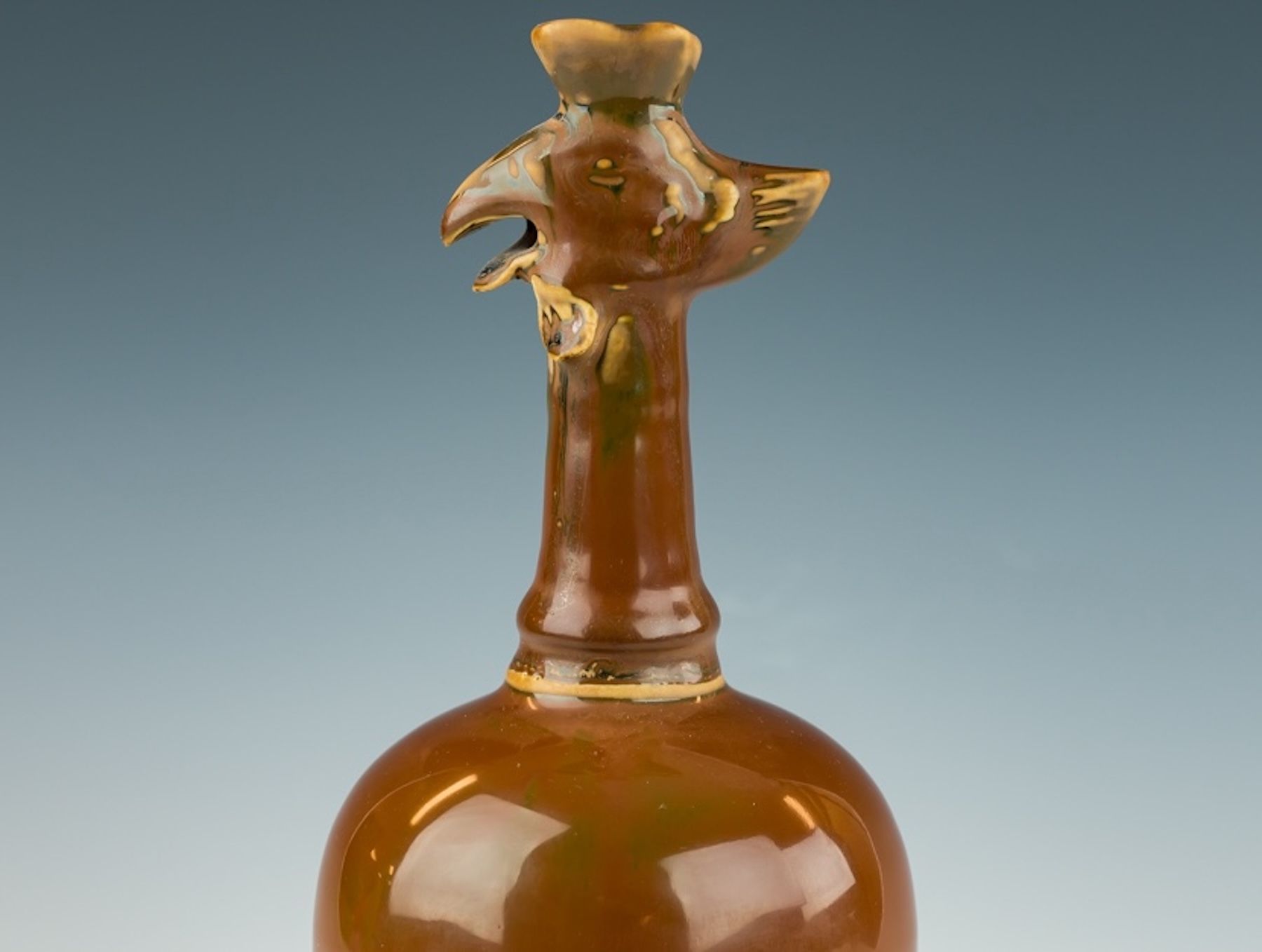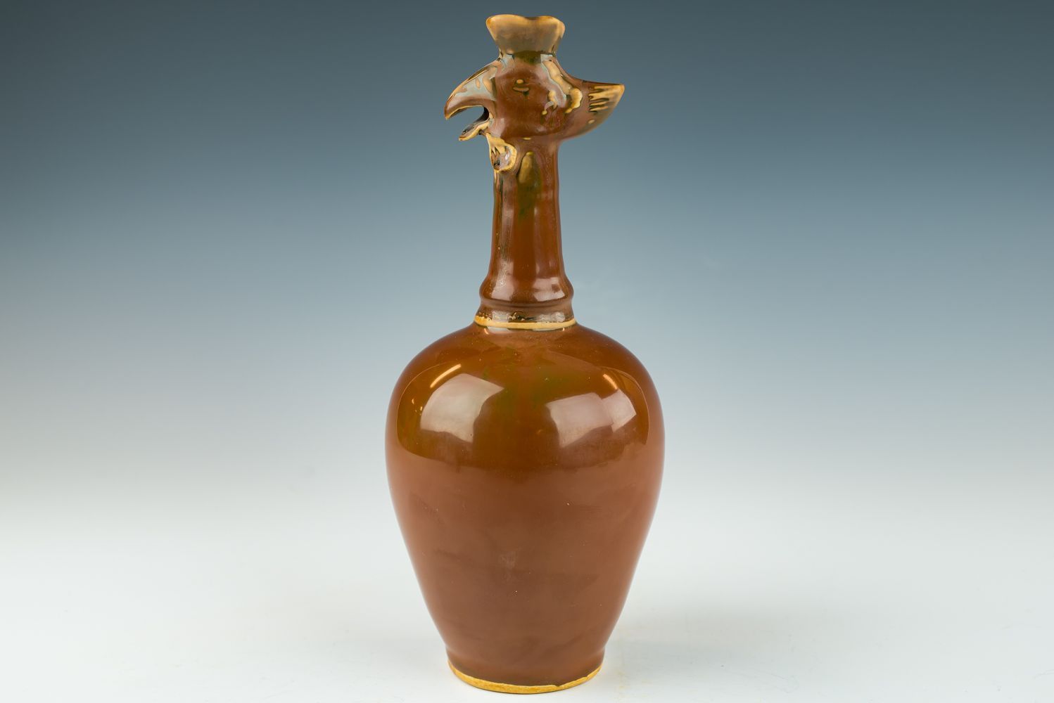 Aiguière de Ding, dynastie Song du Nord, à glaçure kaki et tête de phénix. Cette aiguière remarquable, produite sous la dynastie Song du Nord, présente une glaçure kaki exceptionnelle, parfois qualifiée de rouge ou de pourpre. La glaçure offre un éclat métallique et une texture d'une douceur remarquable. Le corps de l'aiguière est blanc cassé, les bases étant dépourvues de glaçure, laissant apparaître le blanc de la matière, notamment à l'intérieur, où l'application de la glaçure était parfois imparfaite. Cette aiguière a été fabriquée au prestigieux four de Ding, situé dans le comté de Quyang, province du Hebei, réputé pour sa production de céramiques à glaçure kaki d'une grande finesse. Ces céramiques étaient étroitement liées à la traditionnelle cérémonie du thé, témoignant du savoir-faire et de l'art exceptionnels des potiers Song. L'aiguière mesure environ 24 cm de hauteur.