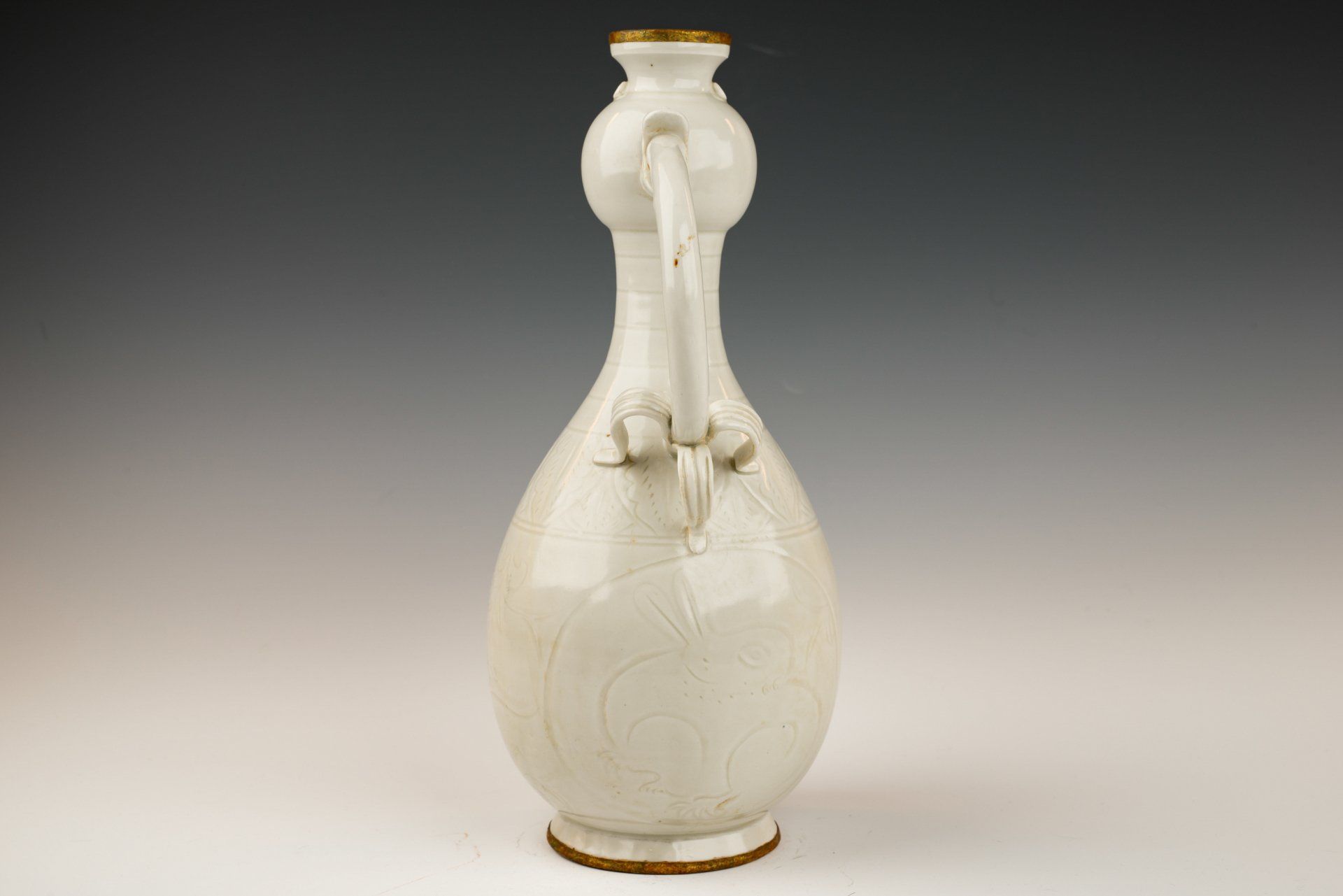 Vase en céramique blanche de la dynastie Song du Nord, cuit au four Ding, à côtes en forme de corde d'arc. Ce vase exquis de la dynastie Song du Nord présente un design unique, caractérisé par des côtes en forme de corde d'arc le long du col et de la tête. Il est orné de deux anses et de deux bandes ondulées sur le corps, mettant en valeur des motifs floraux de lotus finement incisés. Le vase présente une glaçure transparente couleur ivoire sur un fond blanc doux, rehaussée de fines veines d'émail. De plus, deux bandes d'argent ornent le bord et la base, toutes deux présentant une patine noire prononcée, témoignant de son ancienneté. La présence des caractères incisés « guan » à la base suggère que ce vase a probablement été réalisé comme une pièce de tribut. Le vase mesure environ 29 cm de hauteur.