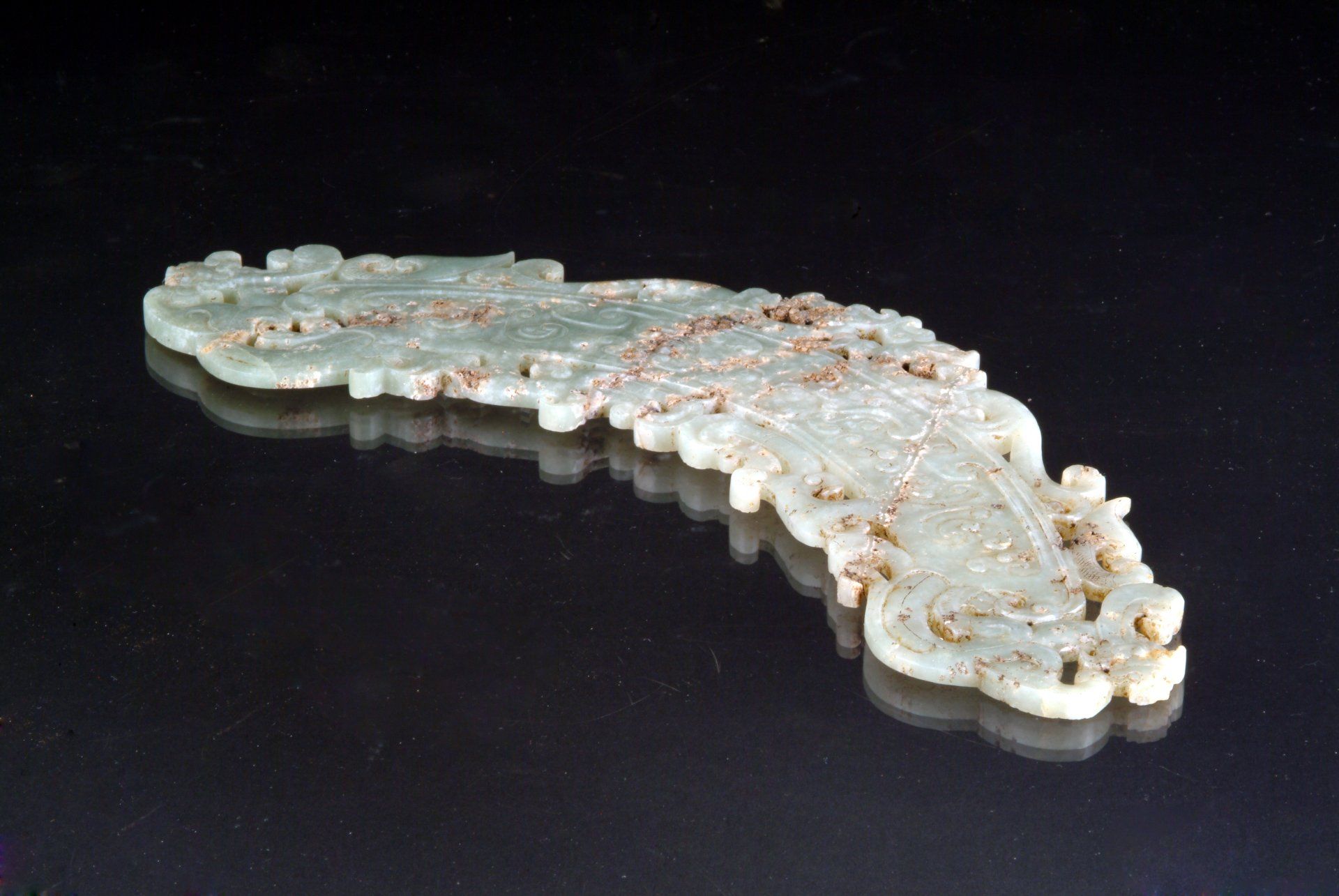 This pendant, crafted during the Han Dynasty, features an intricately stylized design depicting a dragon and phoenix in celadon jade, characterized by distinct brown inclusions. The carving techniques utilized in its creation further substantiate its historical provenance. The dimensions of the piece are approximately 5 1/2 inches in length.