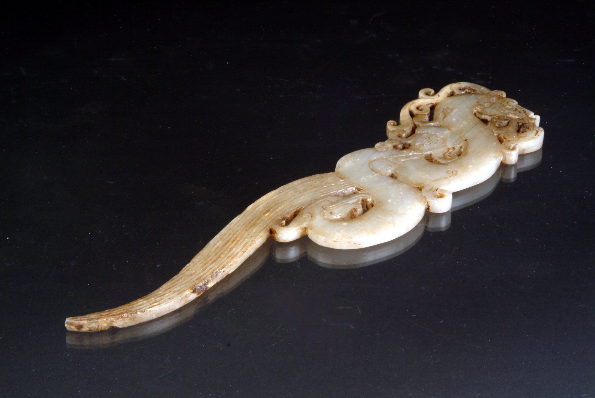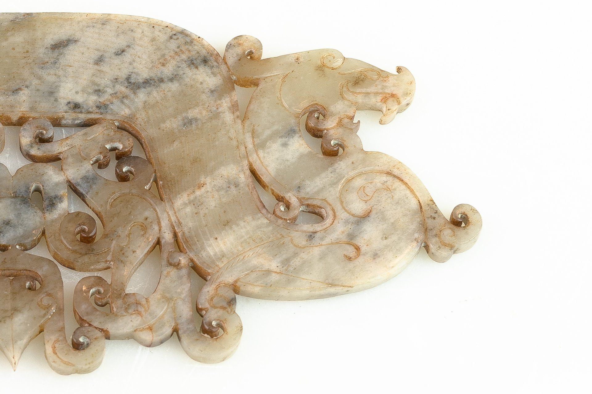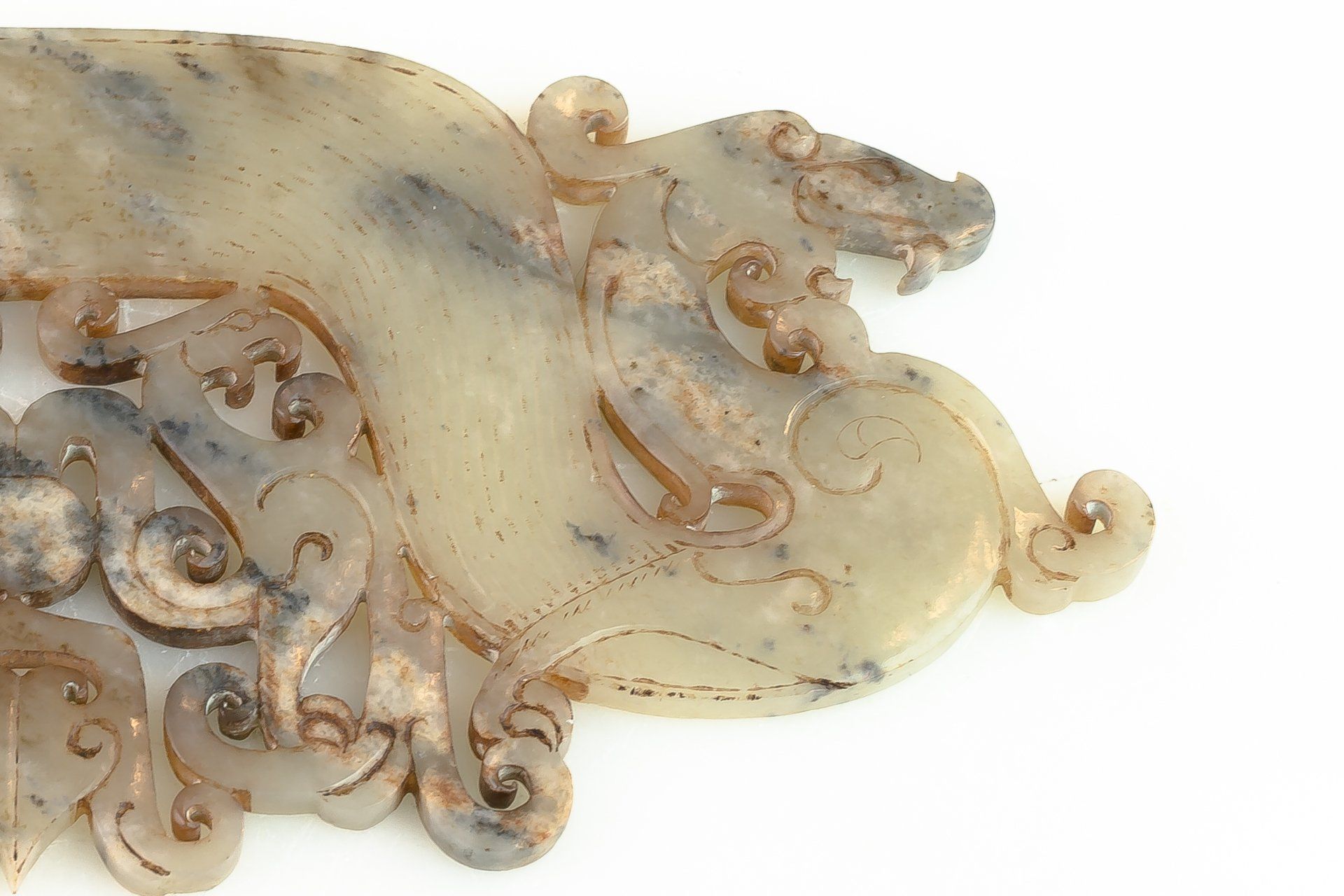 The Han Dynasty presents an intricately designed white jade pendant featuring a dragon and phoenix motif, characterized by heavily stylized artistry. This piece exhibits notable calcified brownish inclusions, along with greenish hues resulting from its burial alongside bronze artifacts. The carving style further attests to its historical significance. The pendant measures approximately 6 5/8 inches when closed and 17 1/2 inches when fully opened.