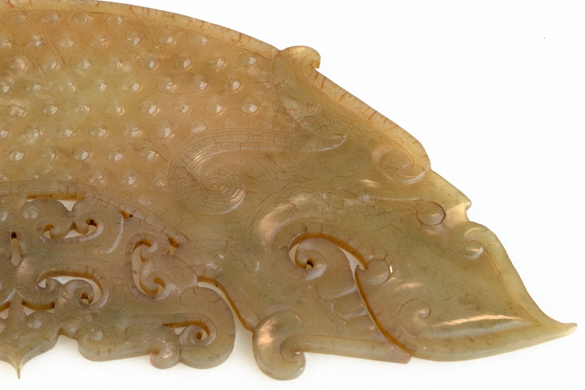 This remarkable piece of archaic jade from the Warring States period, situated within the Eastern Zhou Dynasty, exemplifies exceptional craftsmanship. The jade pendant, known as a Huang, is artistically shaped in an arc and features two intricately carved dragon heads, adorned with a textured grain pattern interspersed with openwork clouds. The material is a translucent celadon jade exhibiting inclusions that have imparted a brownish hue to much of the pendant, alongside localized areas of calcification. The carvings showcase unparalleled finesse, unmistakably marking it as an authentic artifact from this historical era. The delicate lines appear as though meticulously excavated in minute sections—an intricate technique observable only in the finest jade pieces of the Eastern Zhou Dynasty. Such precision necessitates the use of a quality loupe for proper examination. The precise nature of the tools employed in the creation of this piece remains unknown, leading to ongoing speculation; some theorize the use of diamond-tipped instruments akin to knives. Given that jade possesses a hardness comparable to steel, achieving such intricate detail without risking chipping, cracking, or fracturing the stone presents a conundrum that has intrigued scholars dedicated to the study of jade carvings. It is noteworthy that such craftsmanship is not reflected in any other periods throughout China's historical timeline. The Huang, crafted during the Warring States period (approximately 476 BC to 221 BC), measures approximately 9.25 inches in length and is equipped with a small conical pierced hole for suspension.
