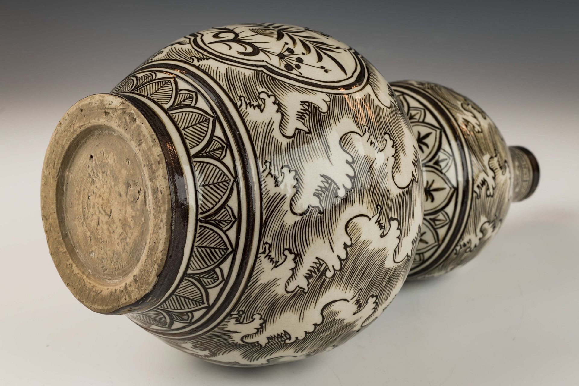 כבשן ג'יג'ואו משושלת יואן - אגרטל דלעת כפול כולל קופסה בצבע לבן-שבור מעוטרת בעיטורים שחורים מורכבים. הוא מעוצב באלגנטיות עם ארבעה פאנלים נפרדים, שבכל אחד מהם ניצנים וגבעולים. הביסקוויט מציג צבע בהיר, מלווה בקילוף ניכר, המעיד על חשיבותו ההיסטורית. האגרטל עומד בגובה משוער של 11 1/2 אינץ'. ppjrs
