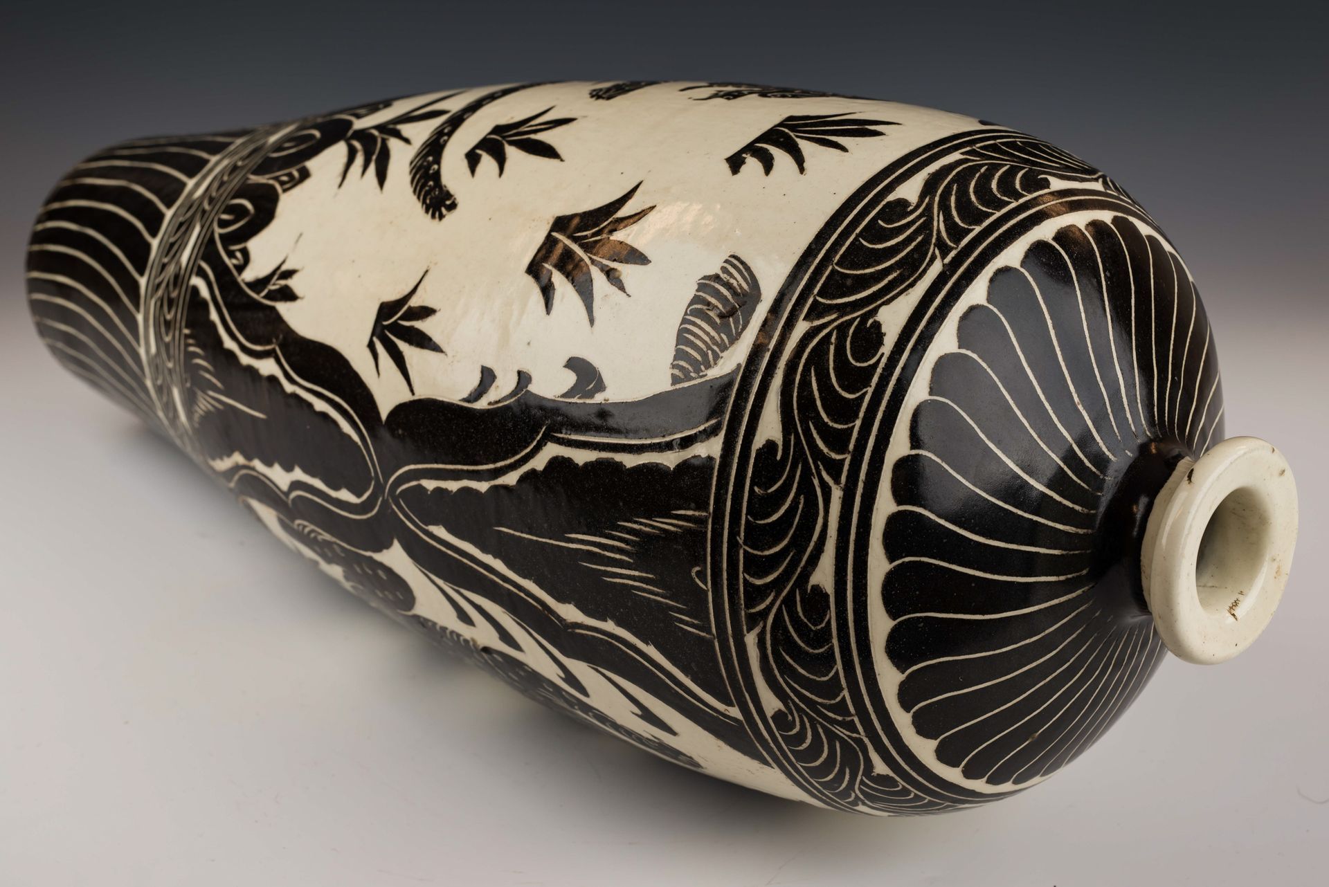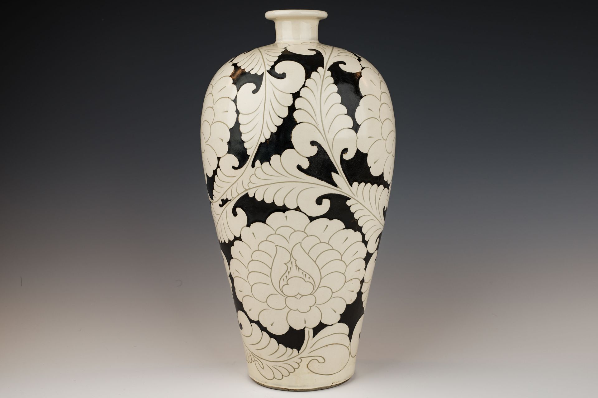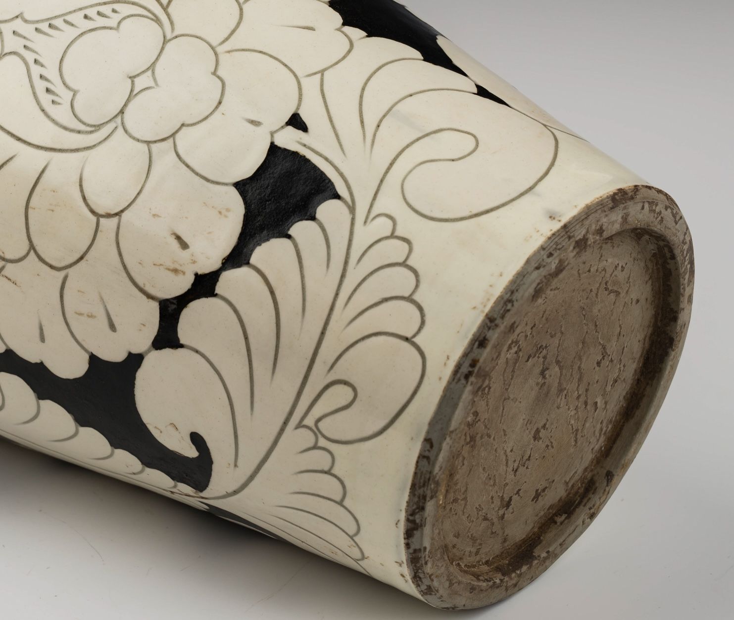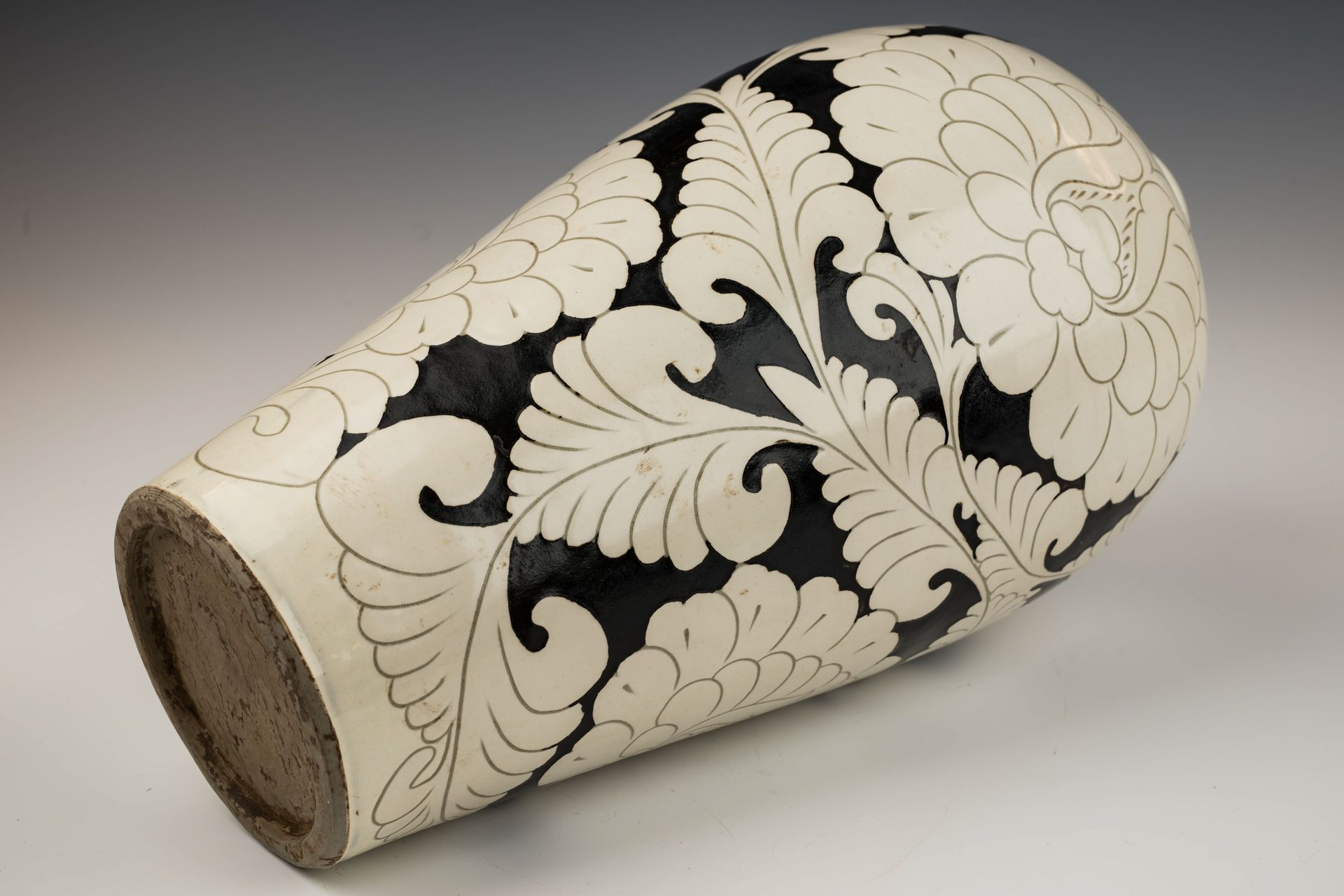 כלי פרחוני בתנור משושלת סונג הצפונית, צ'יג'ואו, עם ידיות. כלי זה כולל חיפוי לבן מעוטר במוטיבים פרחוניים שחורים בזיגוג חתוך אלגנטי, כולל עלי לוטוס. הביסקוויט מציג גוון אפרפר-צהבהב ומתקלף, עדות לאופיו המיושן. גובהו של הכלי כ-14.5 אינץ'. ppjrs