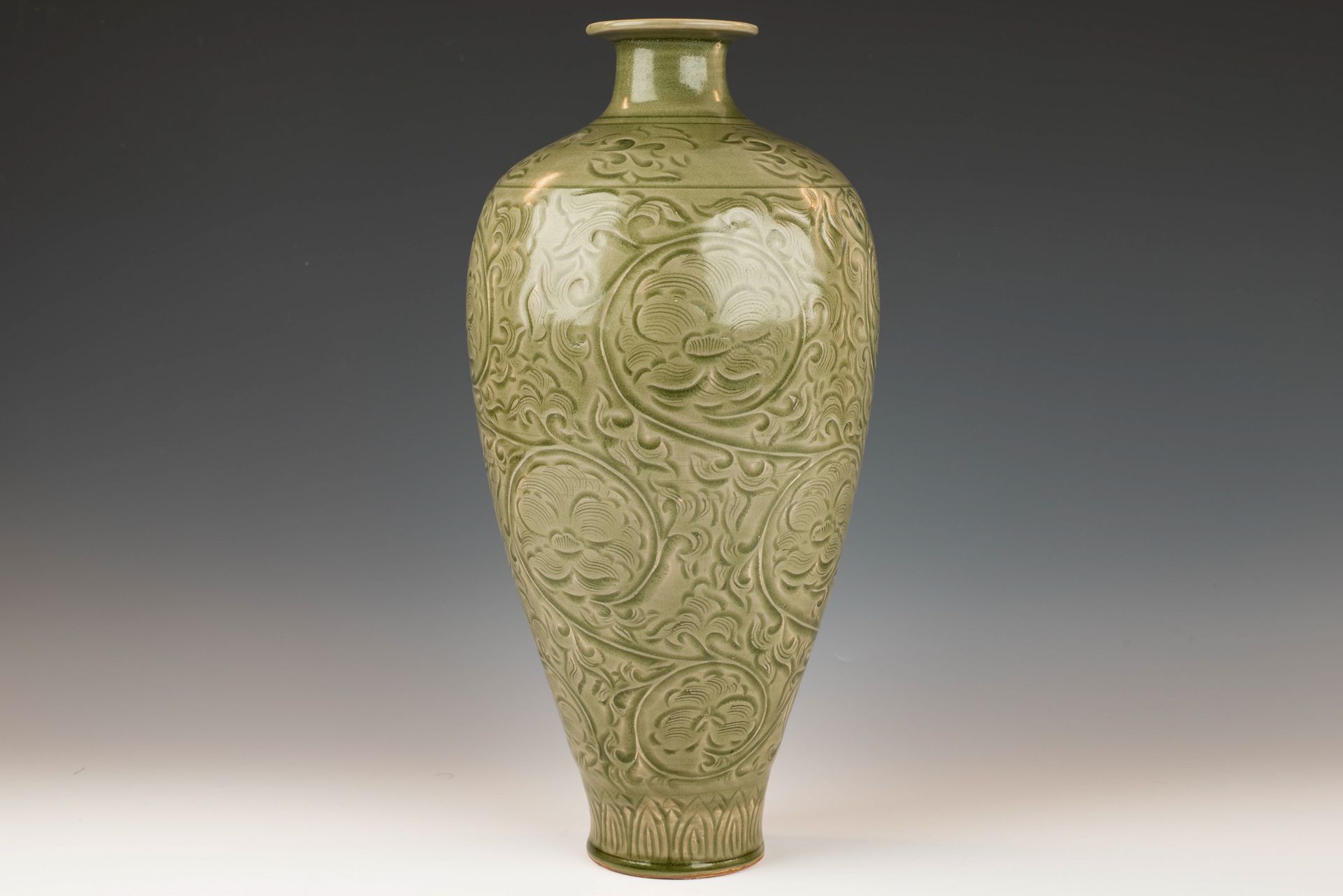 אגרטל יאוג'ואו מייפינג המעודן משושלת סונג הצפונית כולל גוף כלי חרס אפורים מעוצב להפליא, מעוטר במוטיבים מגולפים להפליא של אדמוניות נגללות, ראשי פרחים ועלי לוטוס המקיפים את הבסיס. אגרטל זה גמור בזיגוג ירוק זית שקוף ומשמעותי, המציג שלל בועות המצטברות סביב הפרטים המגולפים, ויוצרות אפקט הדרגתי בגוון. מאפיינים אלה מסמלים את קרמיקת יאוג'ואו שיוצרה במחוז שאאנשי במאות ה-11 וה-12. הגילוף הדקורטיבי מתבצע בזווית כדי לשפר את אפקט ההצטברות של הזיגוג. בעוד שתחתית האגרטל יש מריחה קלה של זיגוג, רוב הבסיס נותר ללא זיגוג, ומציג צבע חום כתוצאה מתהליך השריפה, לצד עדויות להתקלפות הביסקוויט, המעידות על גילו. גובה האגרטל הוא כ-15 אינץ'.