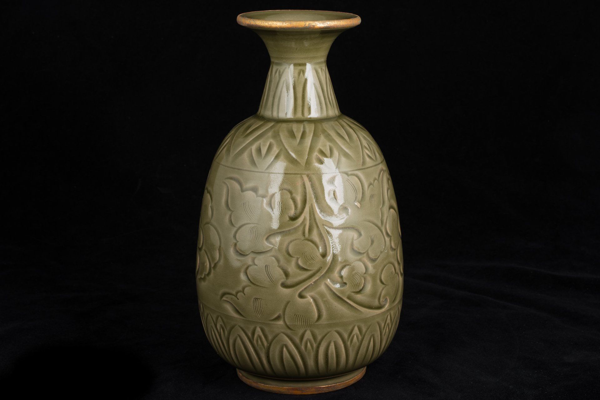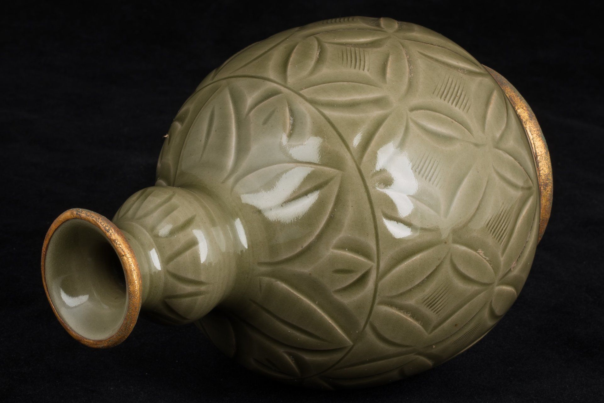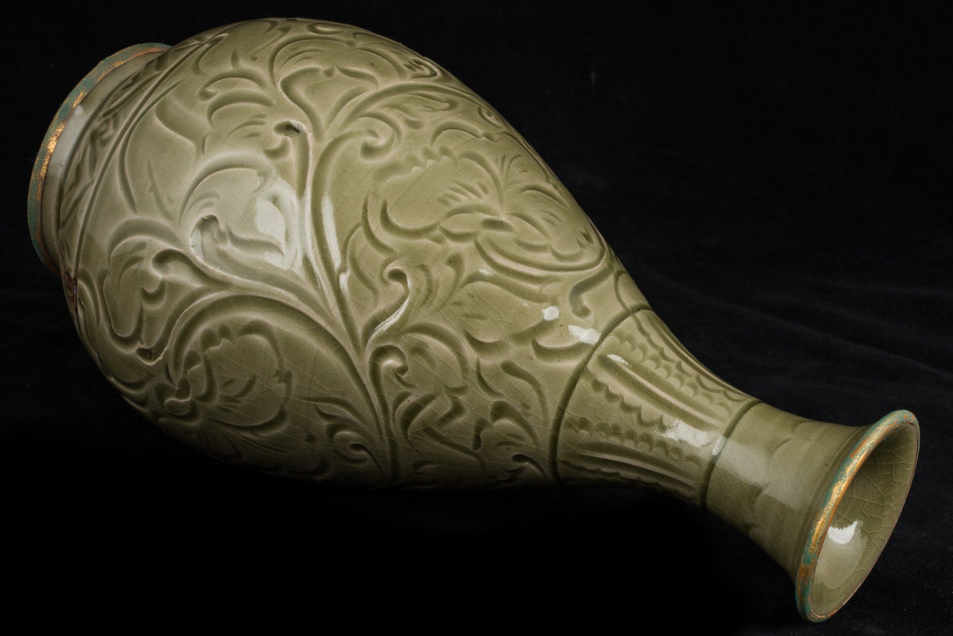 אגרטל מעודן זה משושלת סונג הצפונית, שיוצר ככל הנראה בכבשן יאו-ג'ואו היוקרתי, מאופיין בצורתו האגסית הקיסרית. הוא כולל פסים מוזהבים באש מורכבים המקיפים את הרגל והשוליים, המודגשים על ידי ציפוי ייחודי של קופרט אדמדם ומלכיט בוטריואידי ירקרק, המאשר ביעילות את עתיקותו, ומציע אמינות רבה יותר מבדיקת תרמולומינסנציה (TL). תכונות אלו מוכרות על ידי חוקרים כאינדיקטורים מוחלטים לאותנטיות, ואינן מאפשרות אפשרות לזיוף. הכלי מורכב מגוף כלי חרס אפורים עדינים, מעוטר באלגנטיות בגילופים המתארים ראשי פרחי לוטוס ועלי פרחים, מלווים במוטיבים מסולסלים המקיפים את הצוואר והבסיס. פני השטח שלו עטופים בזיגוג עבה ושקוף של ירוק זית סדוק דק, עם בועות המצטברות סביב קווי מתאר מגולפים עמוקים, ויוצרות את הווריאציות הגווניות האופייניות לסחורות יאו-ג'ואו ממחוז שאאנשי, המתוארכות למאות ה-11 וה-12. החריטות הדקורטיביות מבוצעות בזווית, בחירה עיצובית מכוונת המדגישה את אפקט האגירה של הזיגוג. רגל האגרטל מפגינה מעט זיגוג, אם כי חלק משמעותי נותר ללא זיגוג, ומציג גוון חום עשיר שפותח במהלך תהליך השריפה. פריט יוצא דופן זה מתנשא לגובה של כ-17 ס"מ. ppjrs