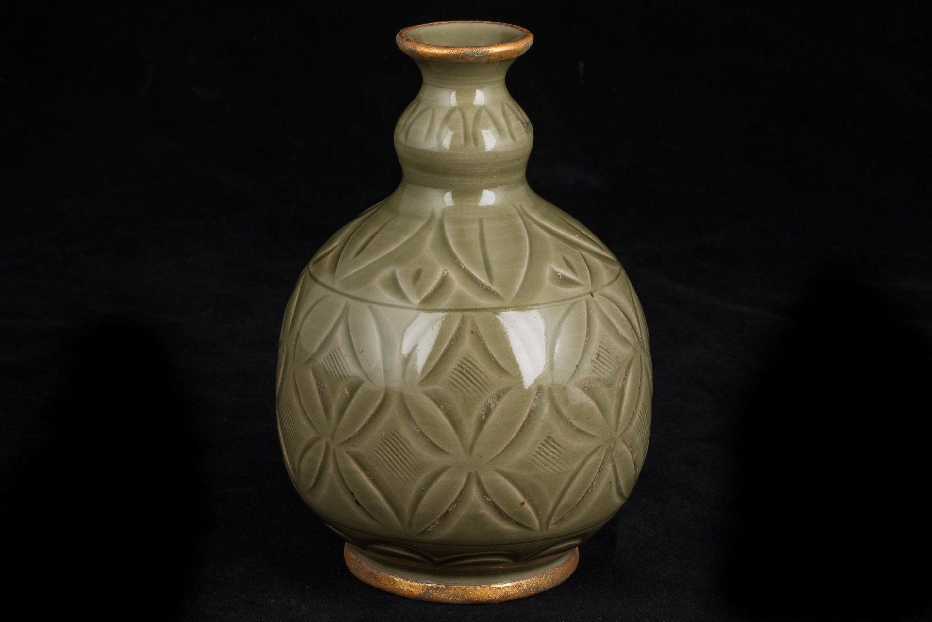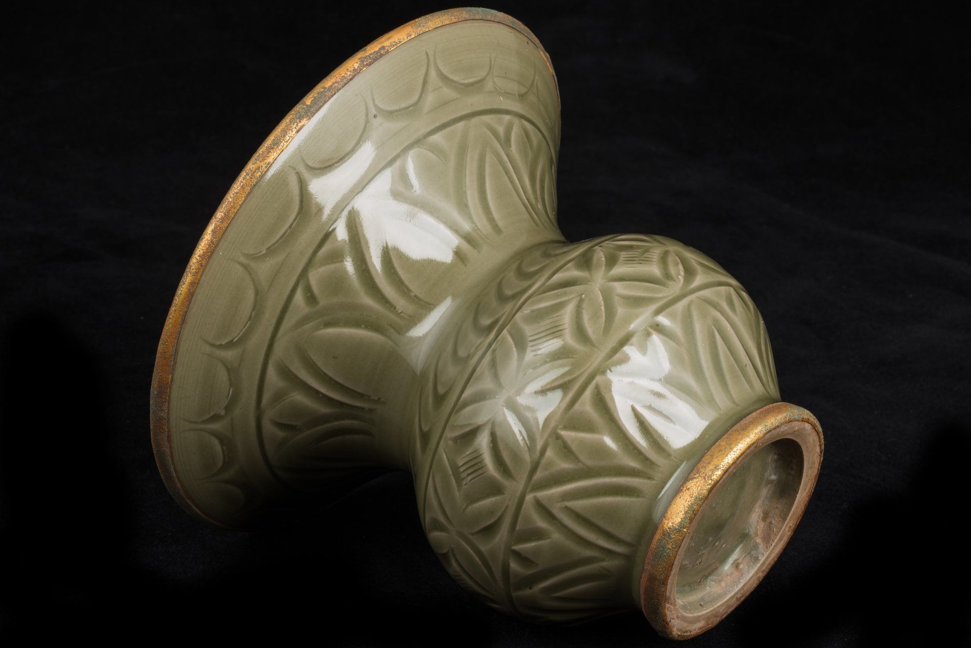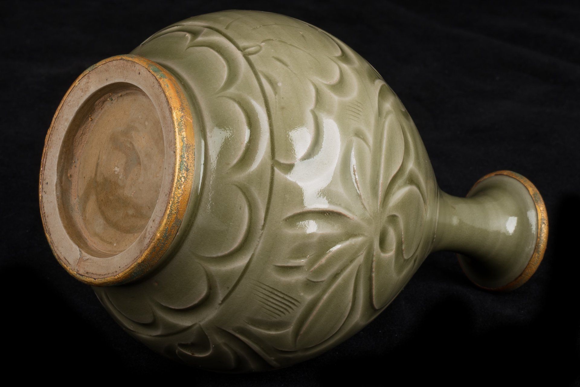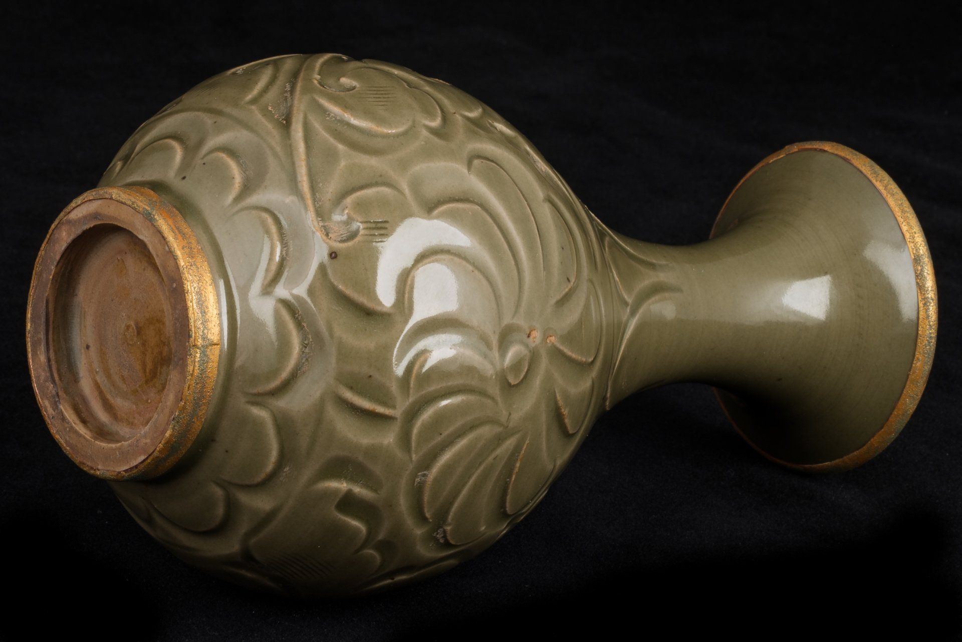 אגרטל מעודן זה משושלת סונג הצפונית, שיוצר ככל הנראה בכבשן יאו-ג'ואו היוקרתי, מאופיין בצורתו האגסית הקיסרית. הוא כולל פסים מוזהבים באש מורכבים המקיפים את הרגל והשוליים, המודגשים על ידי ציפוי ייחודי של קופרט אדמדם ומלכיט בוטריואידי ירקרק, המאשר ביעילות את עתיקותו, ומציע אמינות רבה יותר מבדיקת תרמולומינסנציה (TL). תכונות אלו מוכרות על ידי חוקרים כאינדיקטורים מוחלטים לאותנטיות, ואינן מאפשרות אפשרות לזיוף. הכלי מורכב מגוף כלי חרס אפורים עדינים, מעוטר באלגנטיות בגילופים המתארים ראשי פרחי לוטוס ועלי פרחים, מלווים במוטיבים מסולסלים המקיפים את הצוואר והבסיס. פני השטח שלו עטופים בזיגוג עבה ושקוף של ירוק זית סדוק דק, עם בועות המצטברות סביב קווי מתאר מגולפים עמוקים, ויוצרות את הווריאציות הגווניות האופייניות לסחורות יאו-ג'ואו ממחוז שאאנשי, המתוארכות למאות ה-11 וה-12. החריטות הדקורטיביות מבוצעות בזווית, בחירה עיצובית מכוונת המדגישה את אפקט האגירה של הזיגוג. רגל האגרטל מפגינה מעט זיגוג, אם כי חלק משמעותי נותר ללא זיגוג, ומציג גוון חום עשיר שפותח במהלך תהליך השריפה. פריט יוצא דופן זה מתנשא לגובה של כ-17 ס"מ. ppjrs