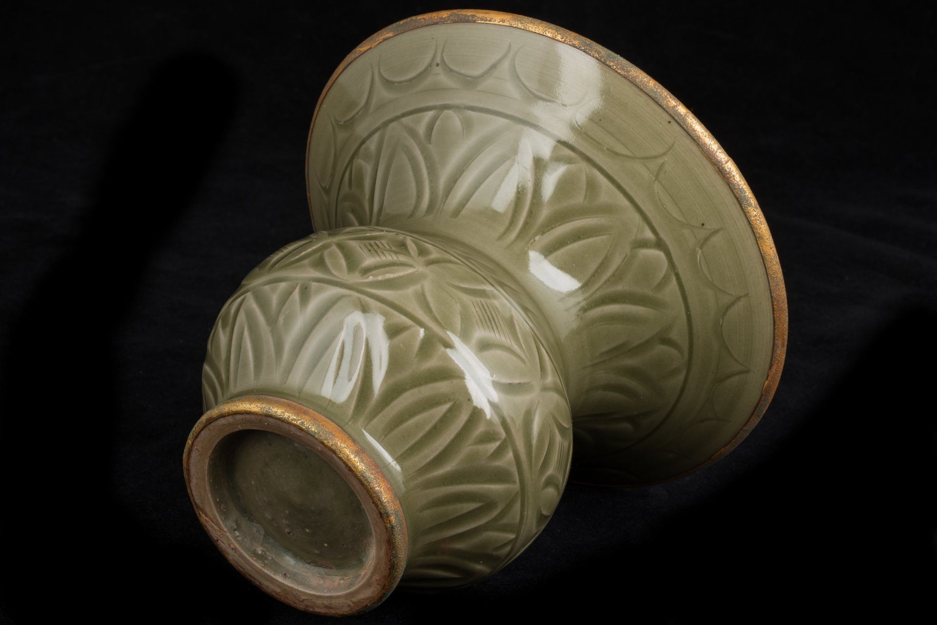 אגרטל מעודן זה, הנחשב לפריט מחווה משושלת סונג הצפונית, מדגים את אומנותו של כבשן יאו-ג'ואו המפורסם. הוא כולל פסים מצופים באש מוזהבים בקפידה המקיפים את הרגל ואת השפה, עם קרום של קופרט אדמדם ומלכיט בוטריואידי ירקרק, המשפרים את ערכו ההיסטורי ואת האותנטיות שלו. נוכחותם של חומרים אלה משמשת כאינדיקטור אמין יותר לגיל מאשר מבחן תרמולומינסנציה (TL), המוכר באופן נרחב על ידי מומחים להערכת מקוריותם של חפצים. האגרטל בנוי מגוף כלי חרס אפורים עדינים, מגולף בקפידה עם מוטיבים פרחוניים ועלי כותרת של לוטוס המעטרים את הצוואר, משלימים פרטים מסולסלים בבסיס. הוא גמור בזיגוג ירוק זית צפוף ושקוף, המאופיין בפצפוץ עדין ובבועות עדינות המדגישות את קווי המתאר המגולפים עמוק עם אפקט הדרגתי לכיוון גוונים כהים יותר. סגנון ספציפי זה מסמל את כלי יאו-ג'ואו שיוצרו במחוז שאאנשי במאות ה-11 וה-12. האלמנטים הדקורטיביים גולפו בקפידה בזווית, מה שמשפר את אפקט האיחוד החזותי. רגל האגרטל מפגינה ברק קל מהזיגוג שהוחל, בעוד שרובו נותר ללא זיגוג, לאחר שפיתח גוון חום אופייני עקב תהליך השריפה. גובה האגרטל הוא כ-6 3/8 אינץ'. ppjrs