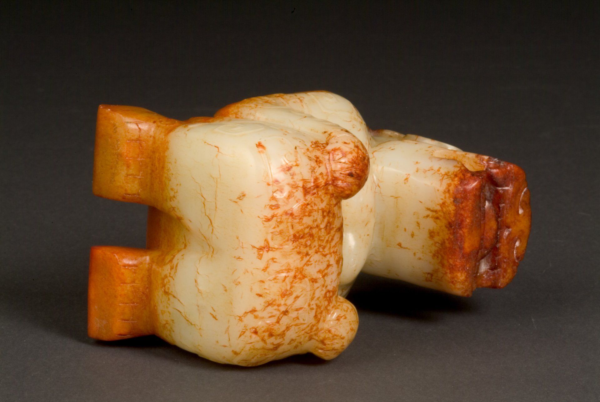 תליון ירקן כפול יוצא דופן זה, בצורת הואנג, שמקורו בתקופת המדינות הלוחמות של שושלת ג'ואו המזרחית, מדגים את האמנות של אותה תקופה. תליון זה, המאופיין בצורת הקשת שלו, כולל ראשי דרקון כפולים ומעוטר בצורה מורכבת בדוגמת גרגרים המכסה עננים פתוחים. החומר בו נעשה שימוש הוא ירקן סלדון שקוף המציג תכלילים חומים-אדמדמים, המעניקים גוון חום בעיקר לחלק ניכר מהפריט. האומנות המוצגת בגילוף זה יוצאת דופן, ומעידה על האותנטיות שלו כיצירה תקופתית. הקווים המפורטים להפליא נראים כאילו נחפרו בקפידה בקטעים זעירים, טכניקה שנצפית לעתים רחוקות מחוץ לממצאי הירקן המעודנים ביותר משושלת ג'ואו המזרחית. כדי להעריך באופן מלא את מורכבות העבודה, יש להשתמש בזכוכית מגדלת של תכשיטן, שכן הפרטים עדינים ומבוצעים בקפידה. השיטה שבה אומנים השיגו דיוק כזה נותרה אניגמטית; תיאוריות מציעות שימוש אפשרי בכלים בעלי חוד יהלום, בדומה לסכין. לירקן קשיות דומה לפלדה, מה שהופך את הסרת השברים הזעירים להישג מדהים ללא הסיכון של סדקים, שברים או שברים באבן גדולה ועדינה זו תחת הלחץ הנדרש. תעלומה זו בלבלה חוקרים לאורך חקר גילופי ירקן, במיוחד בהתחשב בהיעדר טכניקות דומות בתקופות היסטוריות אחרות בסין. תליון הואנג זה, המתוארך לתקופת המדינות הלוחמות (476 לפנה"ס - 221 לפנה"ס), הוא באורך של כ-9 1/8 אינץ' וכולל חור חרוטי קטן בקודקוד לתלייה.