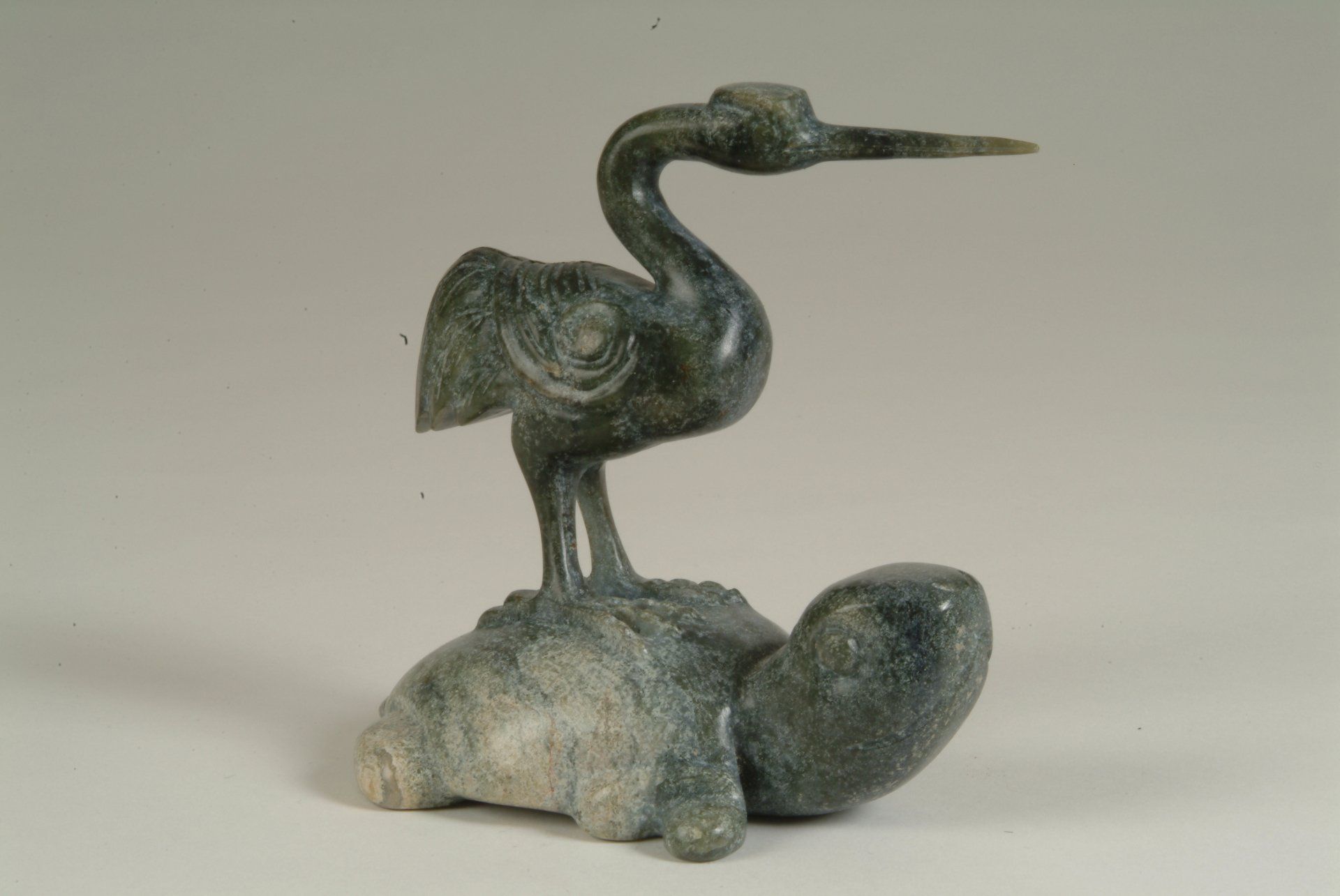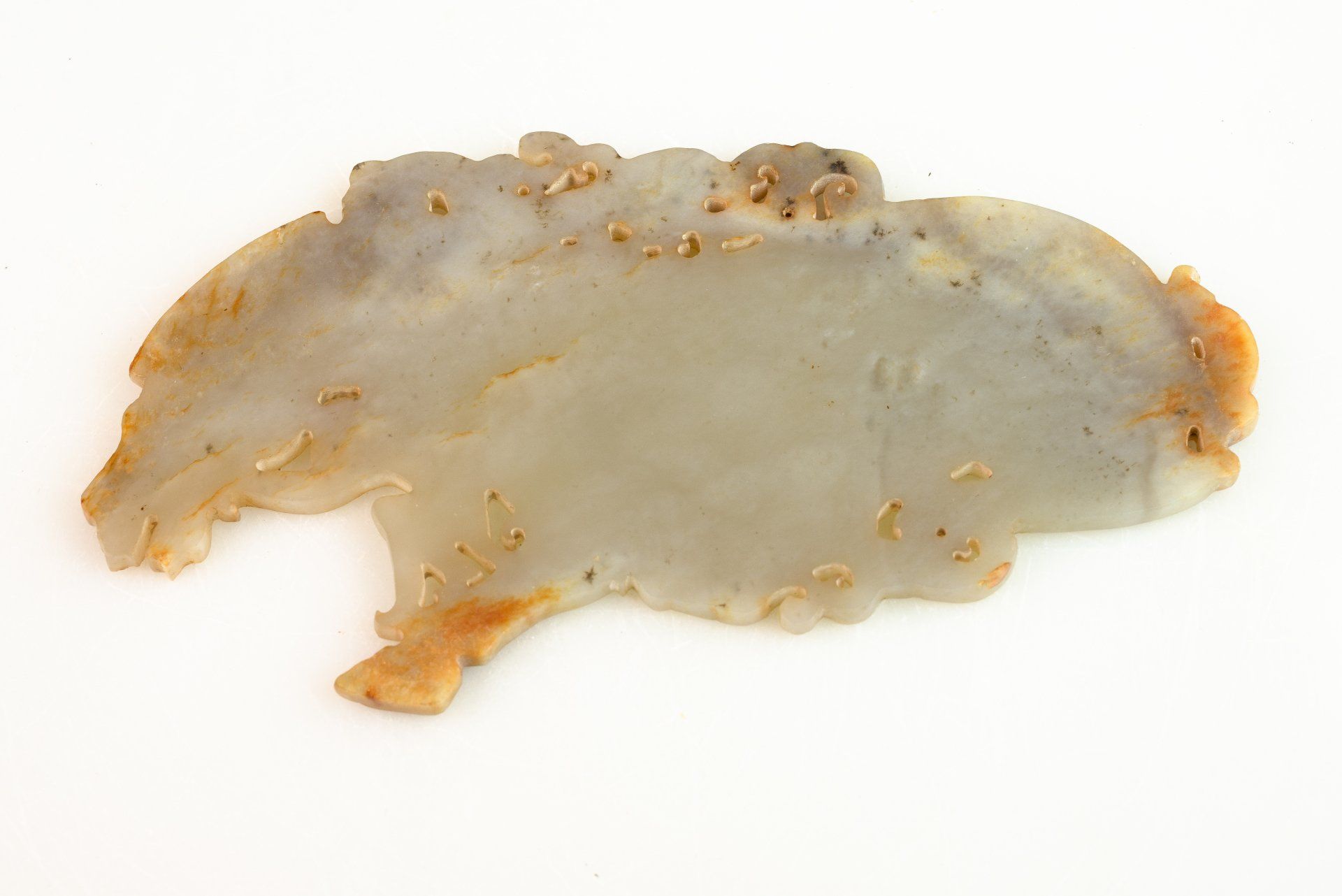 תליון גדול עשוי ירקן סיני לבן-אפרפר המתאר דרקון, עוף חול ורקדן מהמדינות הלוחמות