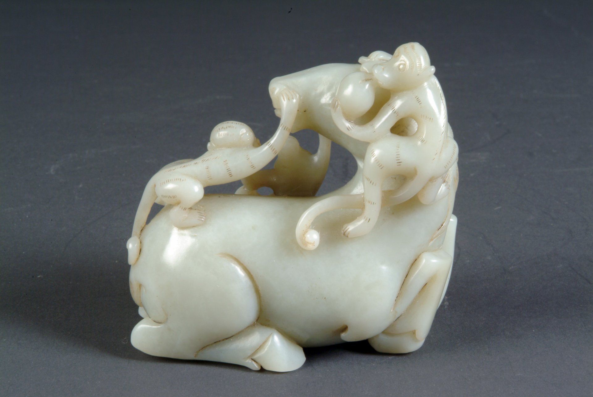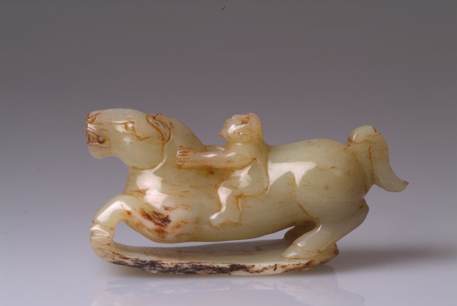 פסלון סוס ירקן לבן משש שושלות בליווי קופים