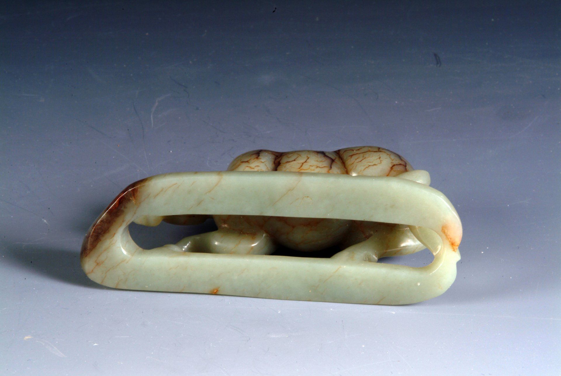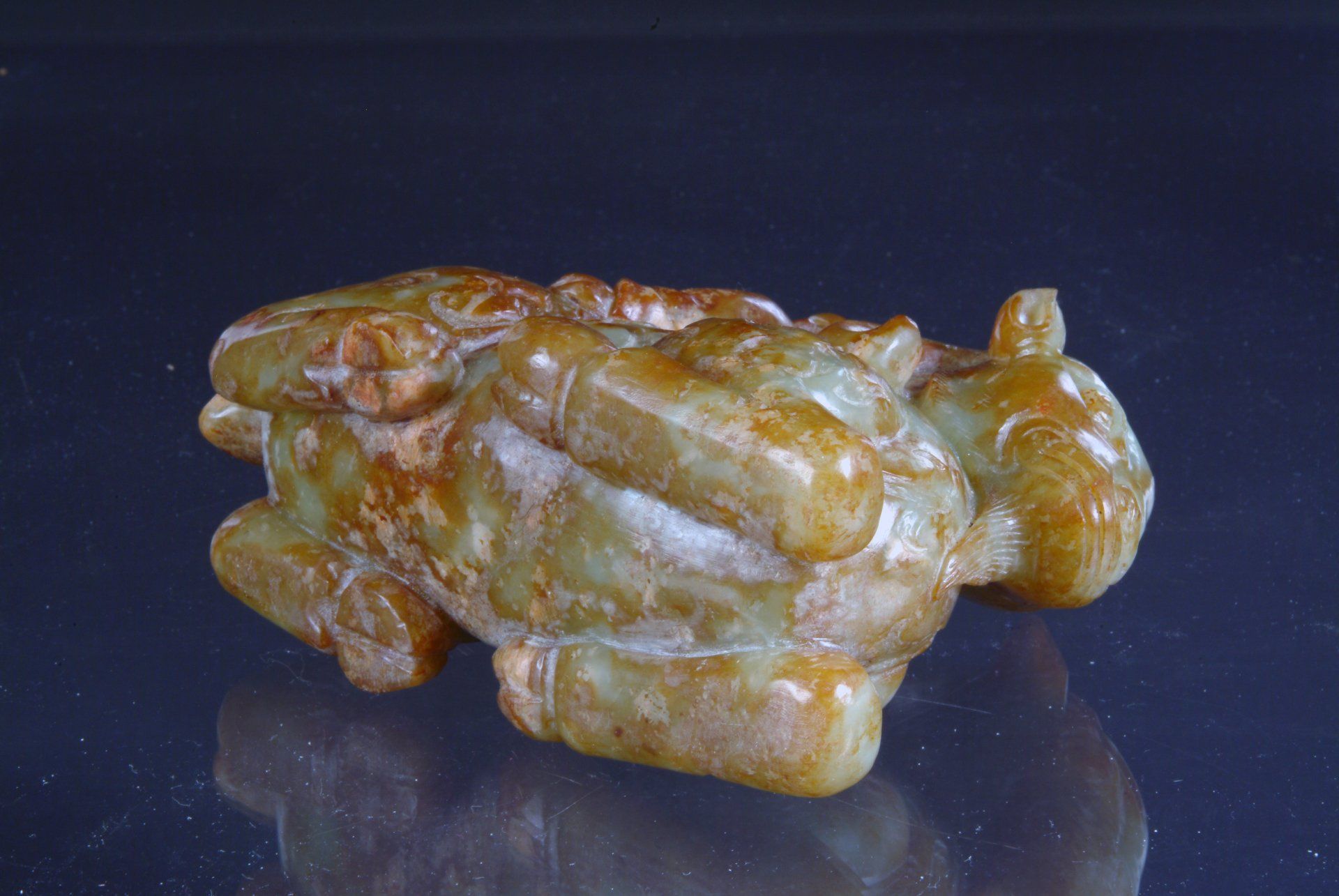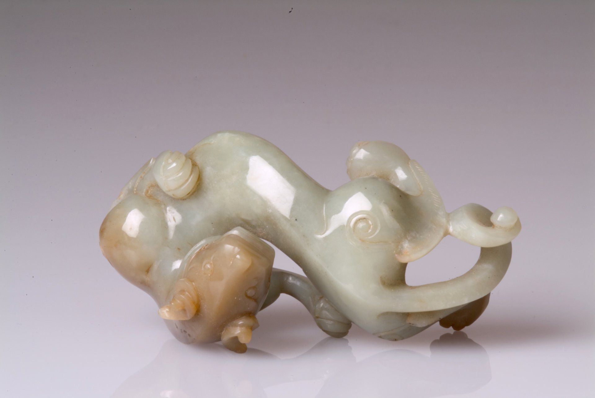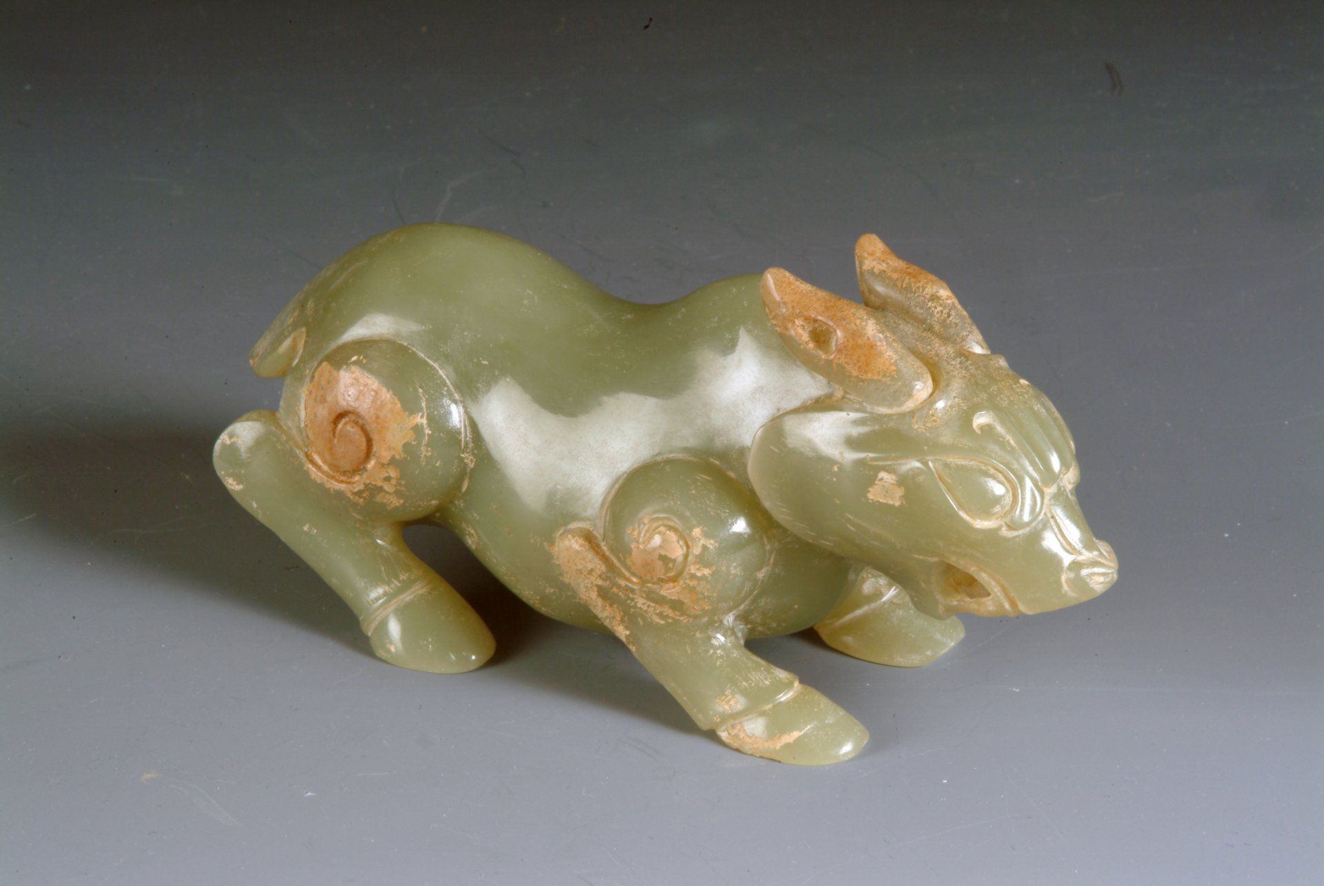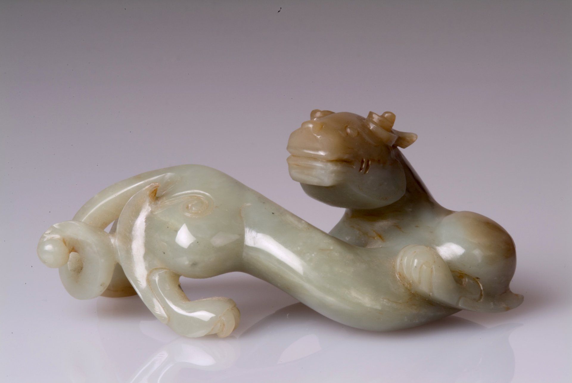 פסל חיה מיתולוגי מעוות מאבן ירקן אפרפרת-ירוקה מתקופת שש השושלות