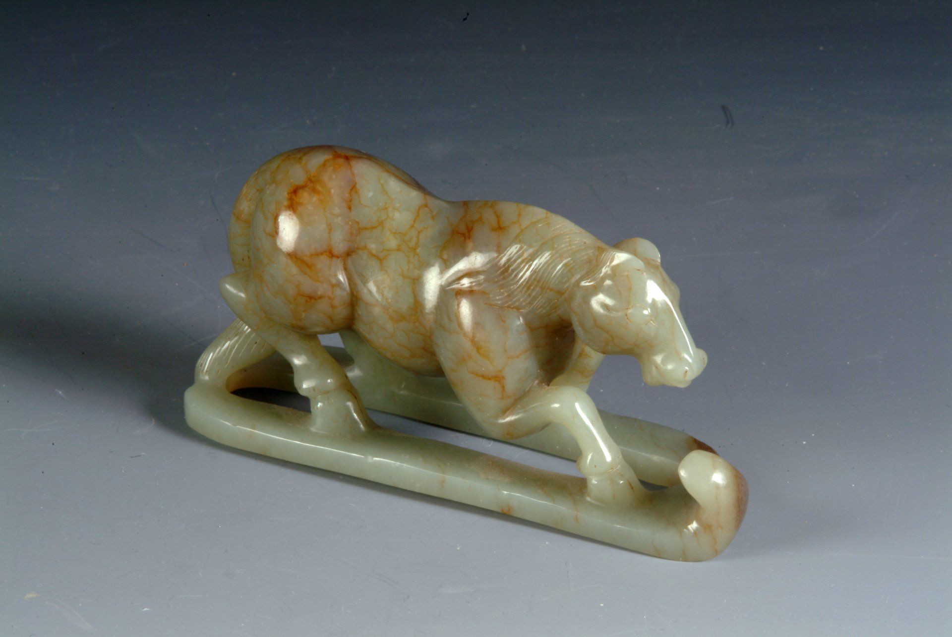 יצירת אמנות סינית עתיקה זו היא פסל סוס מגולף בקפידה, שמקורו בתקופת שש השושלות. היצירה עשויה מאבן ירקן אפרפרה חיוורת בעלת גוונים ירקרקים עדינים. צורתה מאוזנת היטב, ומפגינה רמת אומנות גבוהה. חומר הירקן מאופיין במרקמו העדין ובשקיפותו, המועשרים בנהרות חומים מורכבים ובורידים, יחד עם סגנון גילוף המשקף את חשיבותו ההיסטורית. אורך הפסל הוא כ-4 1/8 אינץ'.