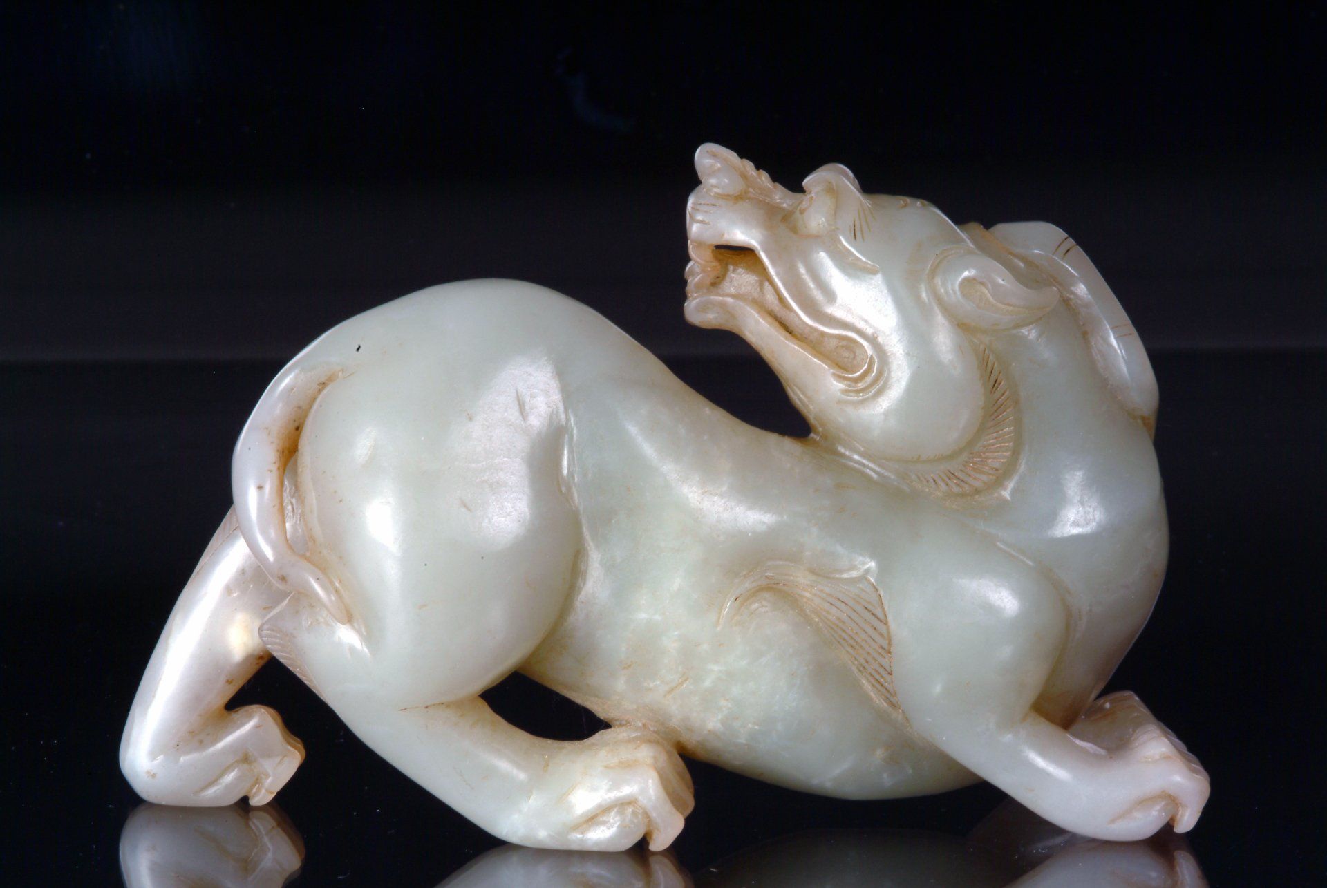Patung giok putih keabu-abuan Dinasti Ming yang sangat indah ini menggambarkan seekor hewan mitos, memamerkan area-area khas dengan inklusi keputihan, yang, bersama dengan gaya ukirannya, mengautentikasi asal-usul historisnya. Patung ini berukuran