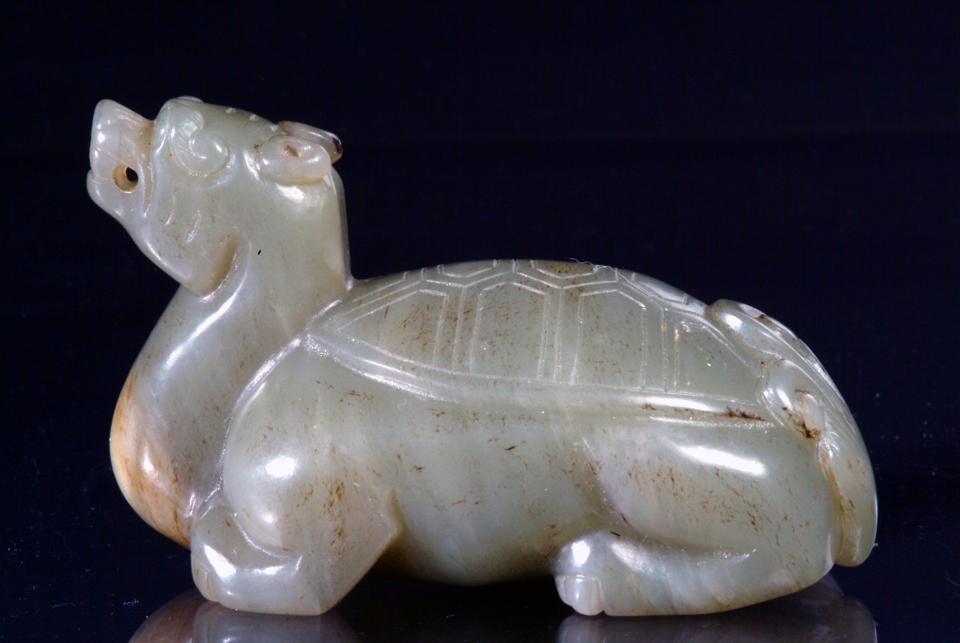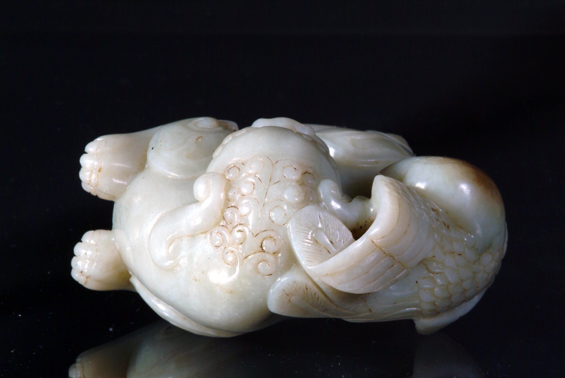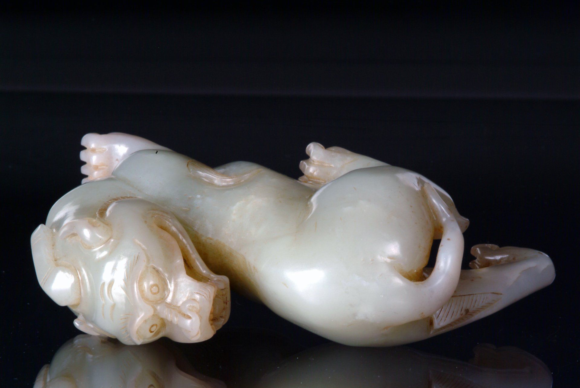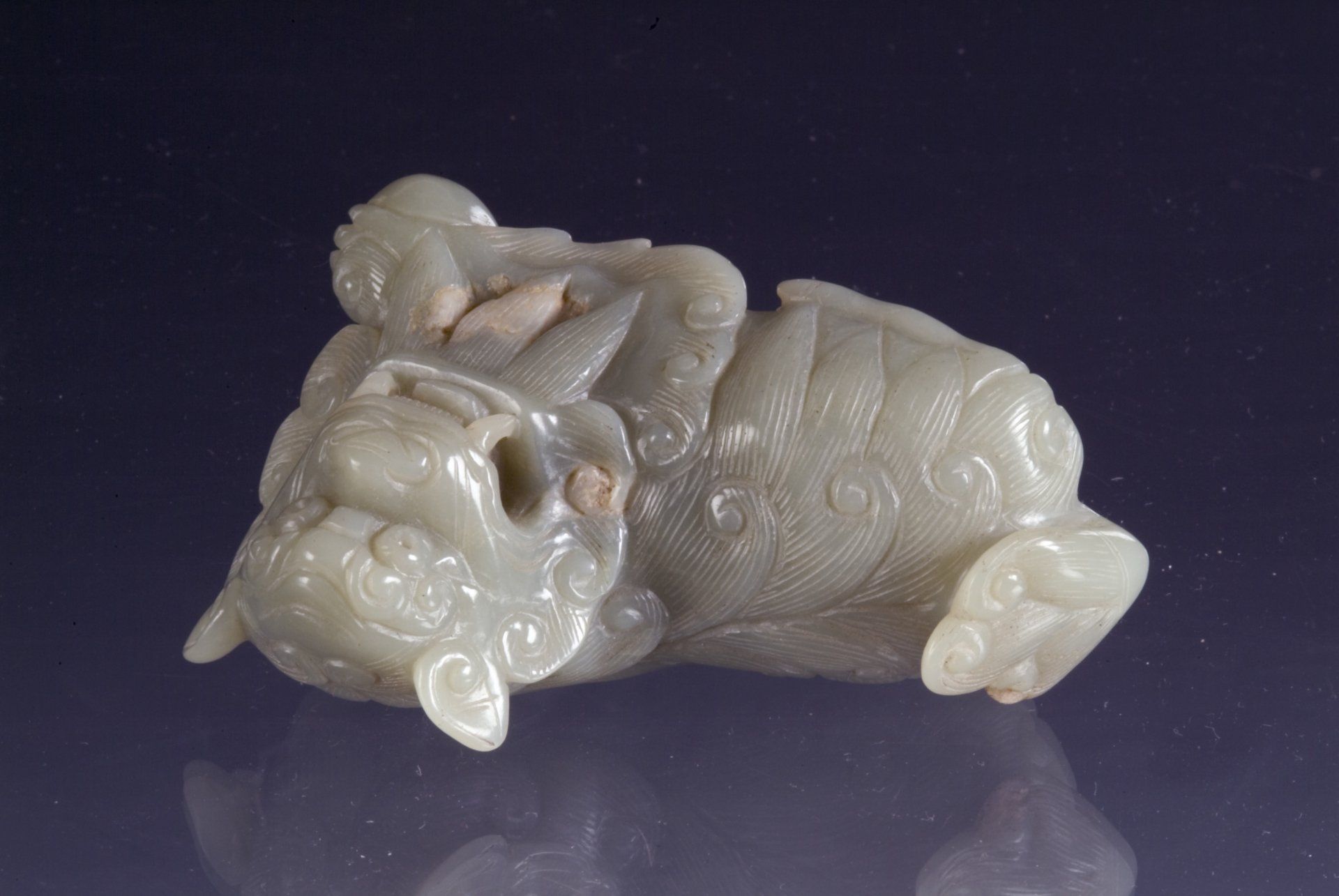 Patung giok putih keabu-abuan berukir halus ini, yang merepresentasikan hewan mitologis yang ditemani buku-buku, berasal dari Dinasti Ming. Patung ini memiliki inklusi kecokelatan yang luas, menonjolkan usia dan keasliannya. Dimensinya sekitar 3,5 inci.