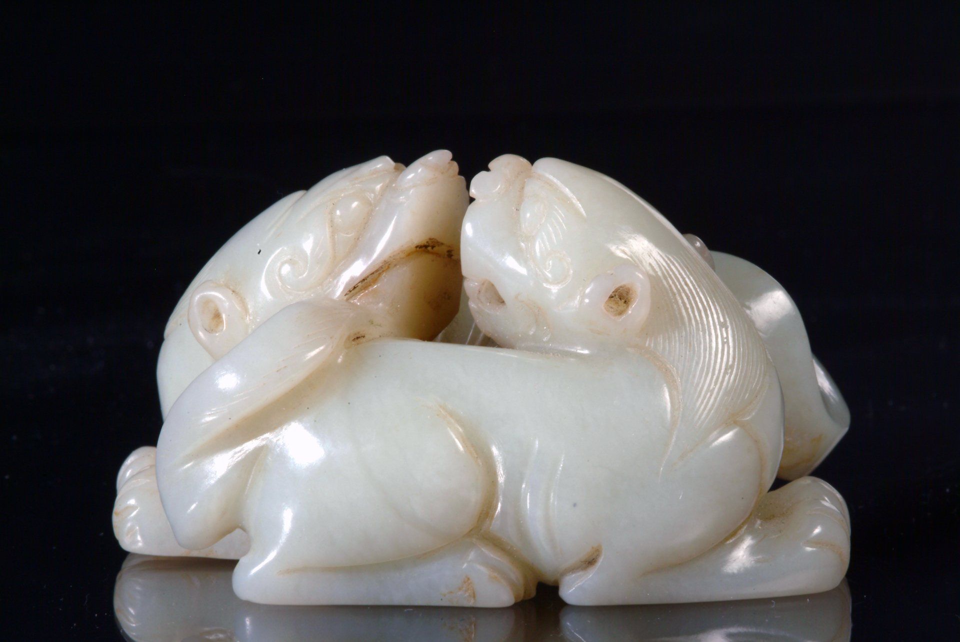 Patung dari Dinasti Ming yang dipahat dengan indah ini menampilkan representasi giok putih keabu-abuan pucat berupa dua Singa Foo yang sedang memegang semburan teratai. Patung ini menampilkan area-area khas dengan inklusi kecokelatan, dan gaya ukirannya menegaskan makna historisnya. Panjang patung ini sekitar 7,5 cm.