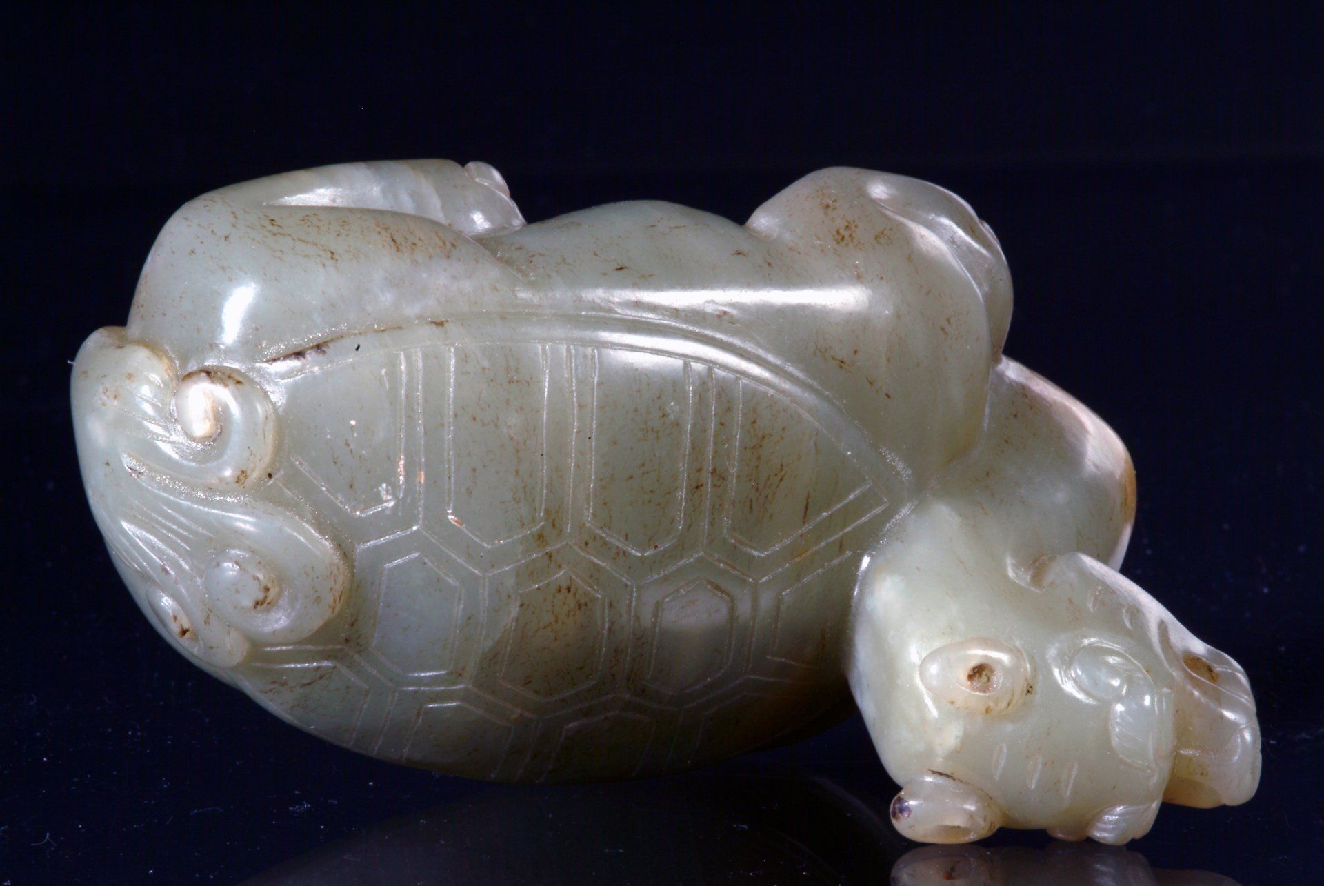 Patung kura-kura berkepala naga yang diukir dengan sangat apik ini, berasal dari Dinasti Ming, merupakan contoh keahlian dalam pengerjaan batu giok hijau keabu-abuan. Patung ini menampilkan inklusi putih dan merah karat, yang menunjukkan usia dan keasliannya, semakin diperkuat oleh gaya ukirannya yang khas. Patung ini berukuran sekitar 3,5 inci, menjadikannya tambahan yang luar biasa untuk koleksi apa pun.