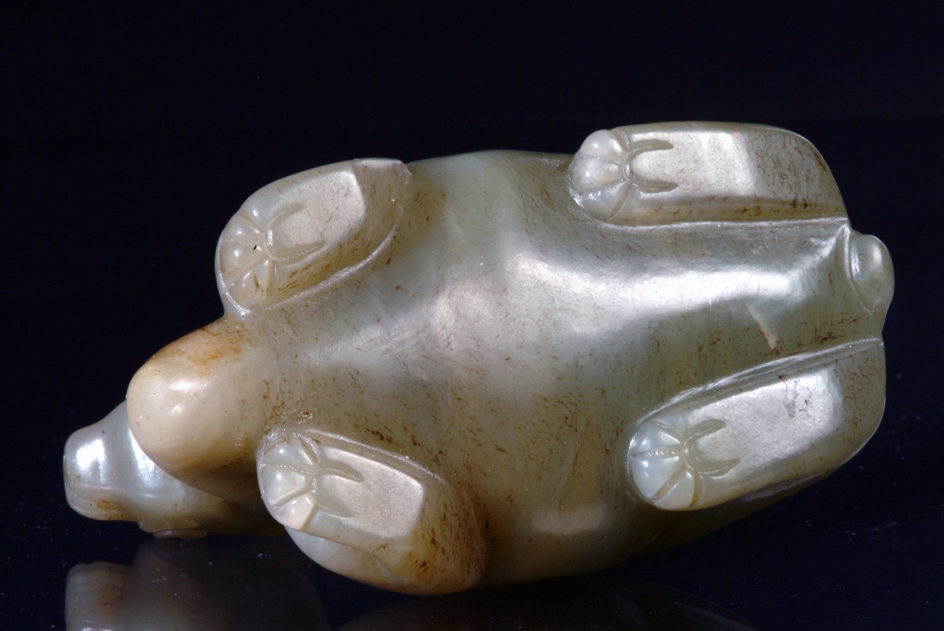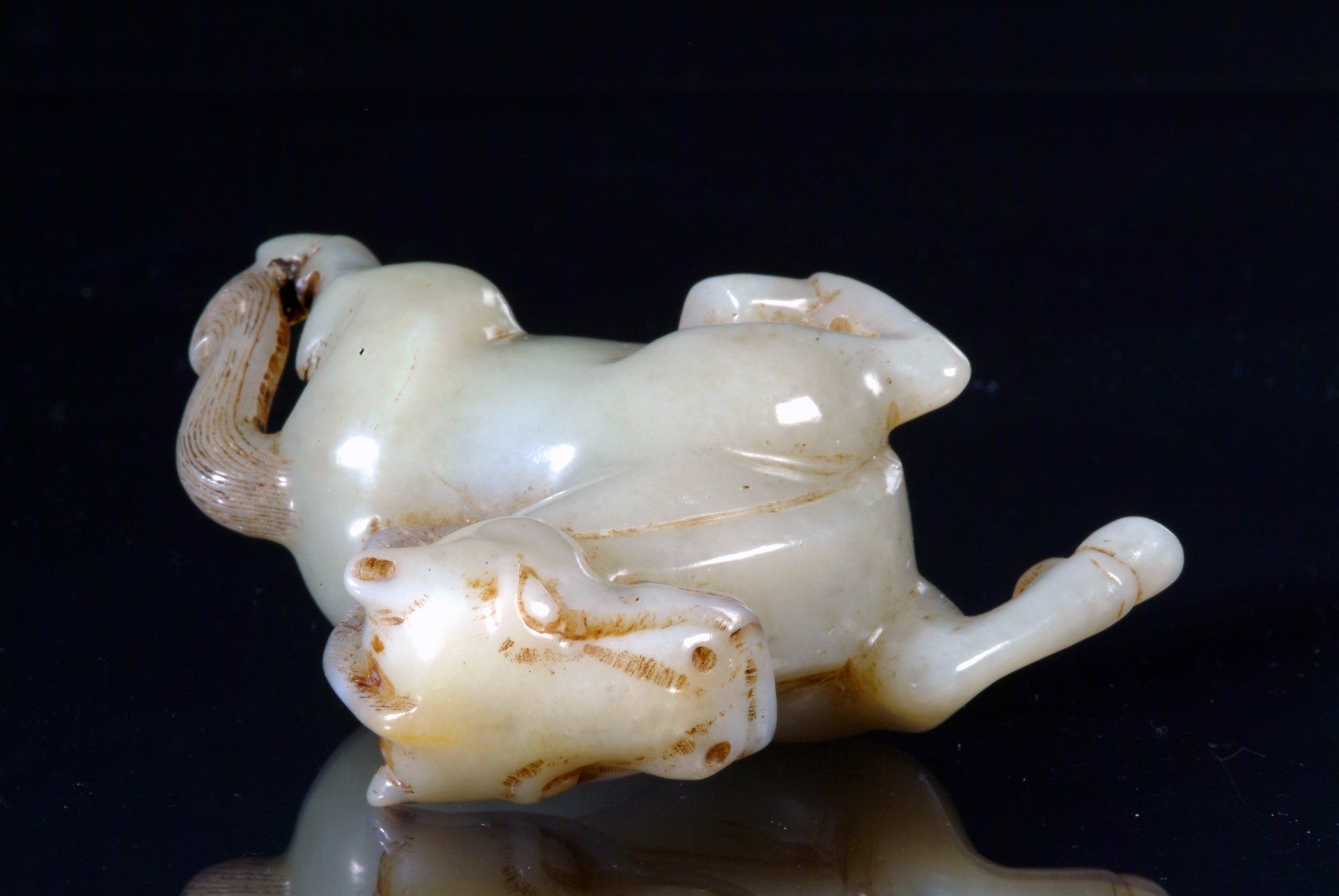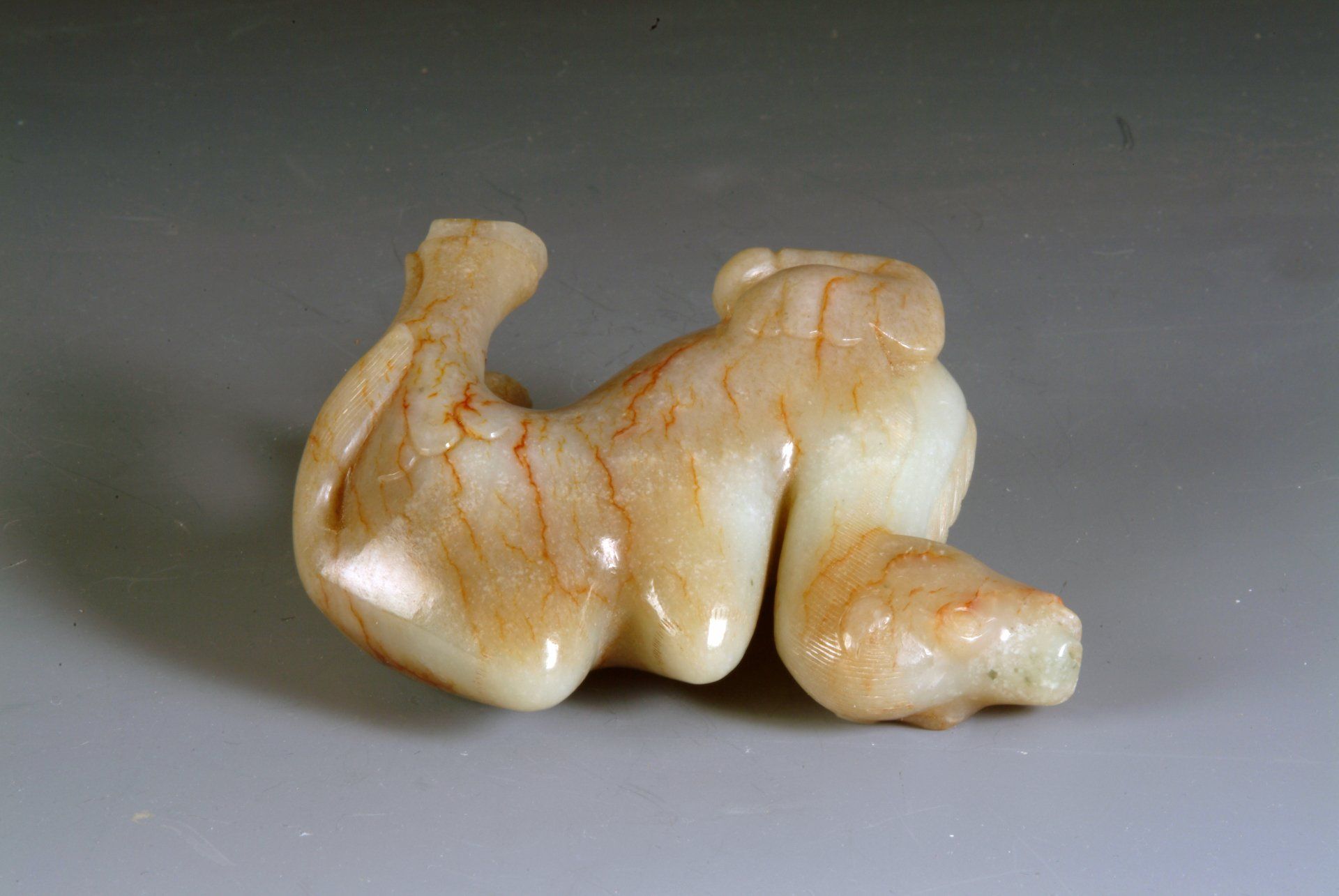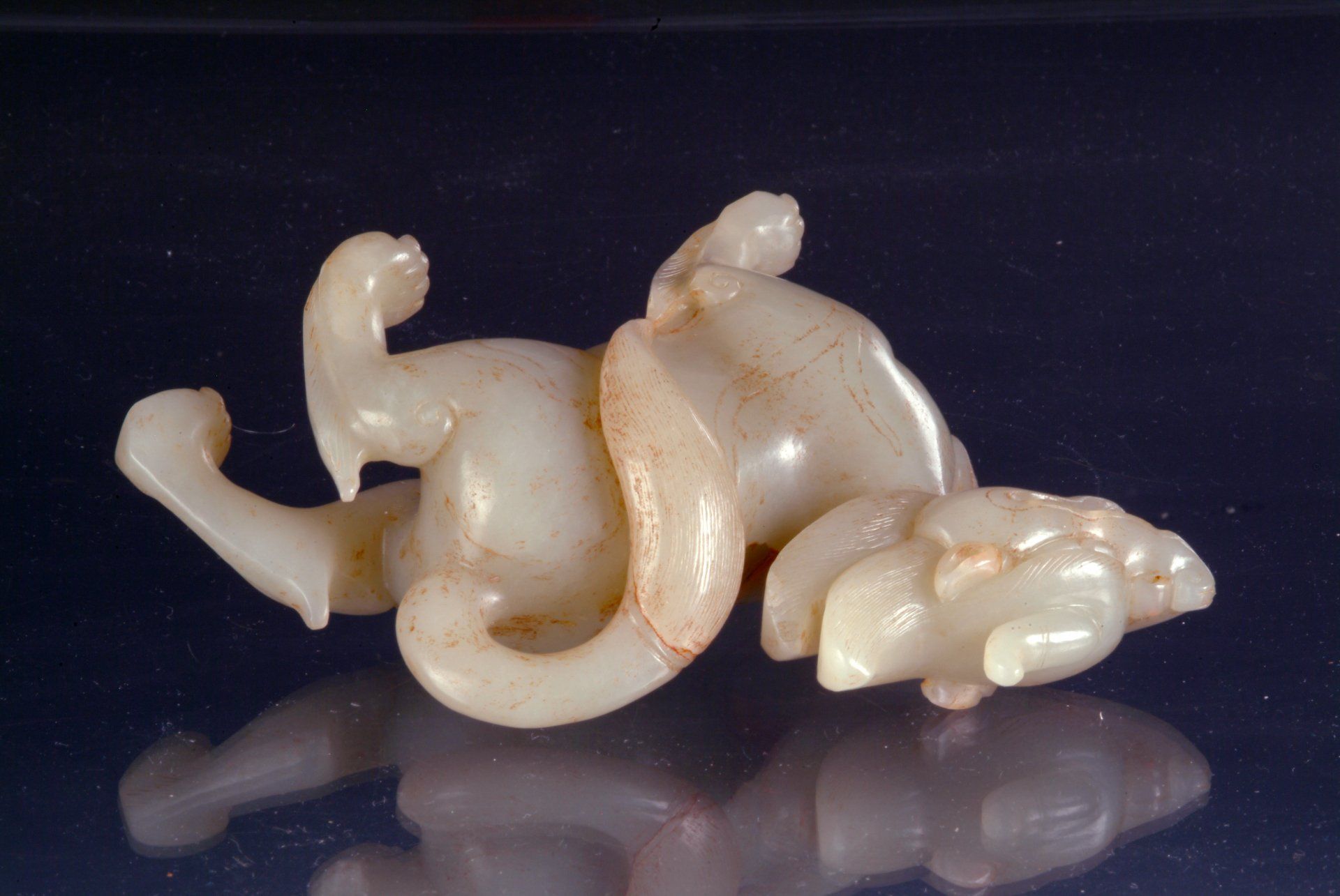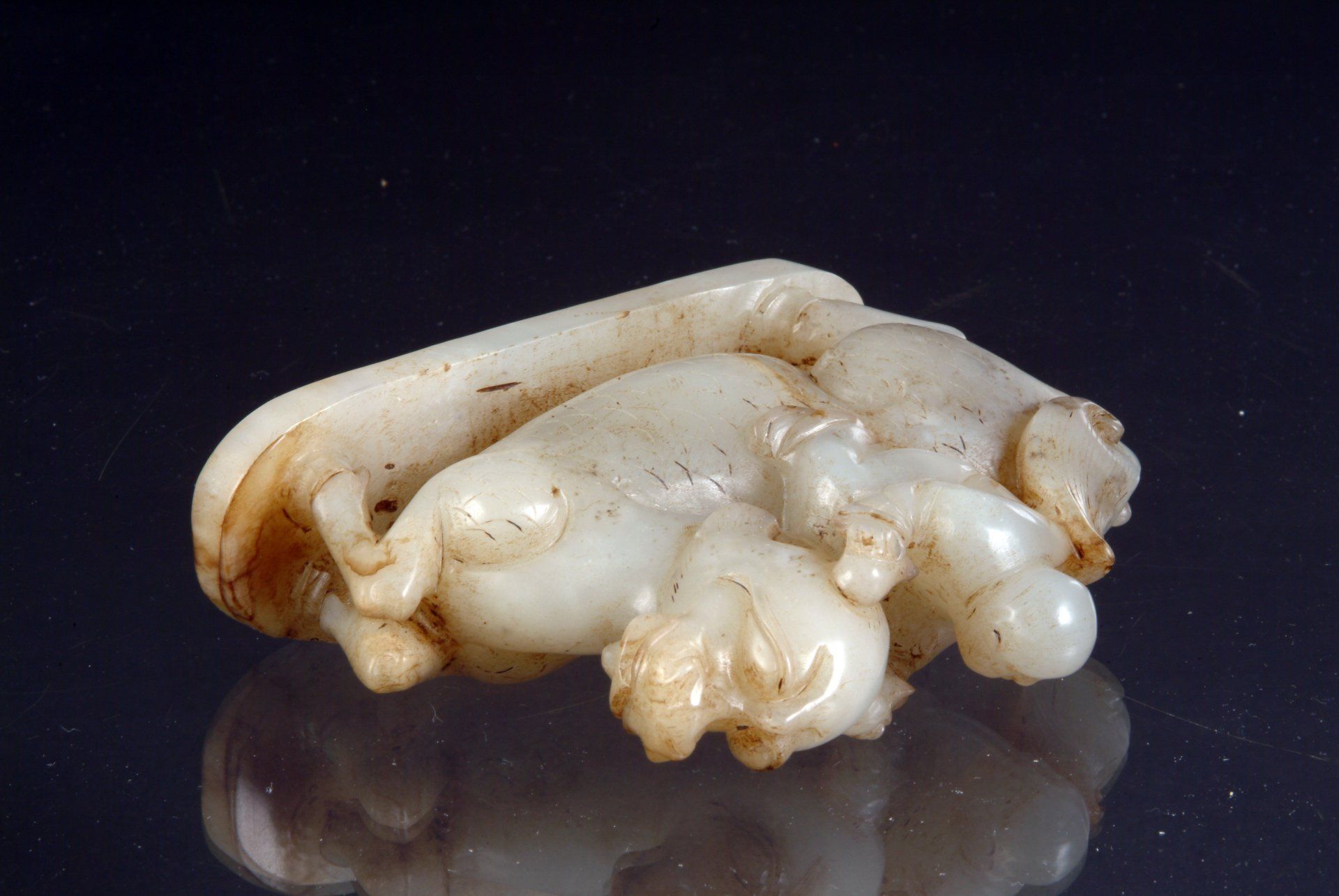 Patung giok putih berukir rumit dari Dinasti Ming ini menggambarkan seekor kucing yang sedang bersama anak-anaknya. Patung ini menampilkan area-area berbintik kecokelatan dan gaya ukiran yang menunjukkan makna historisnya. Panjang patung ini sekitar 5,5 cm.