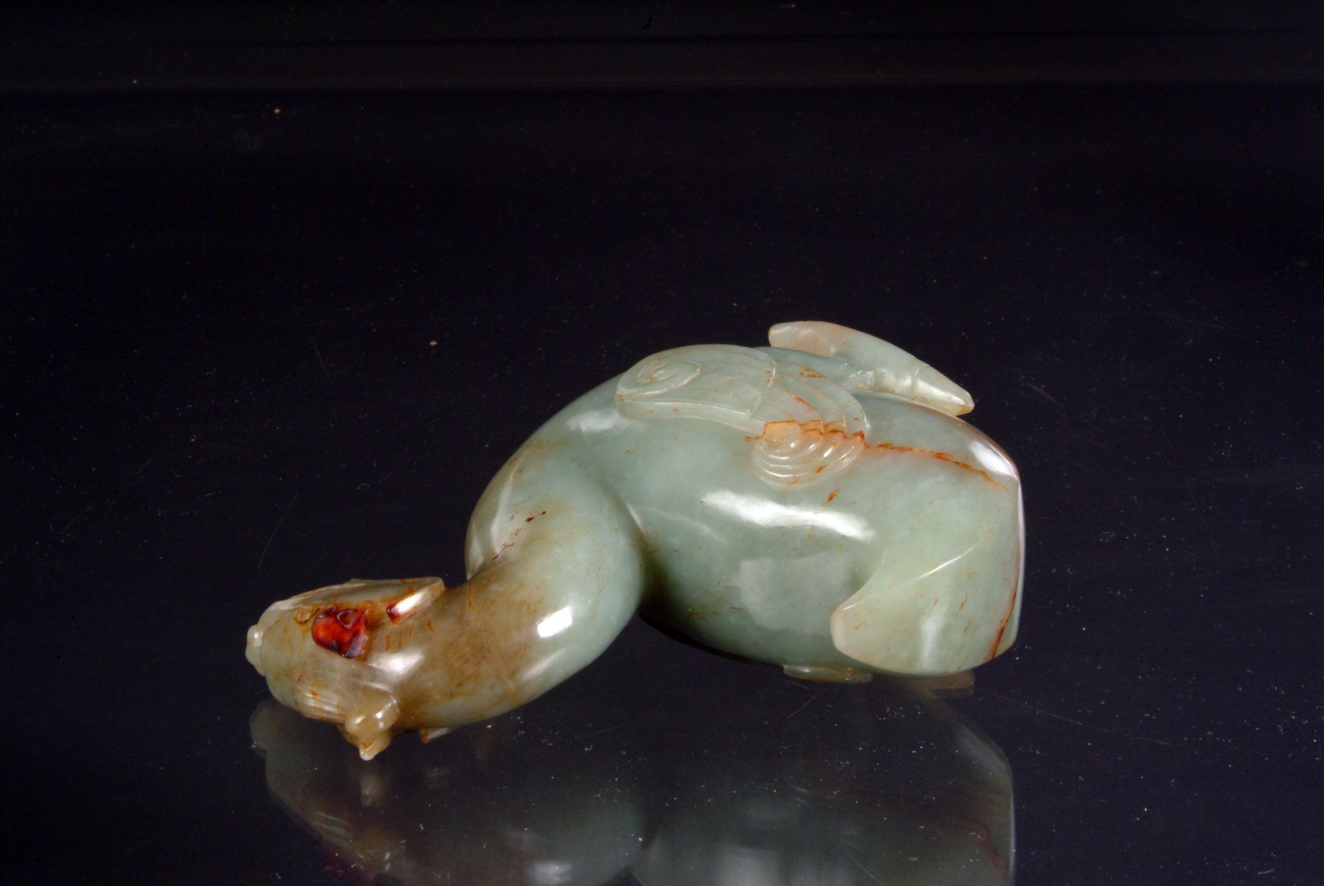 Patung giok seladon berukir halus ini, menggambarkan makhluk mitos bertanduk dari Dinasti Ming, menampilkan inklusi cokelat tua yang khas, serta gaya ukiran yang menegaskan asal-usul historisnya. Panjang patung sekitar 13 cm.