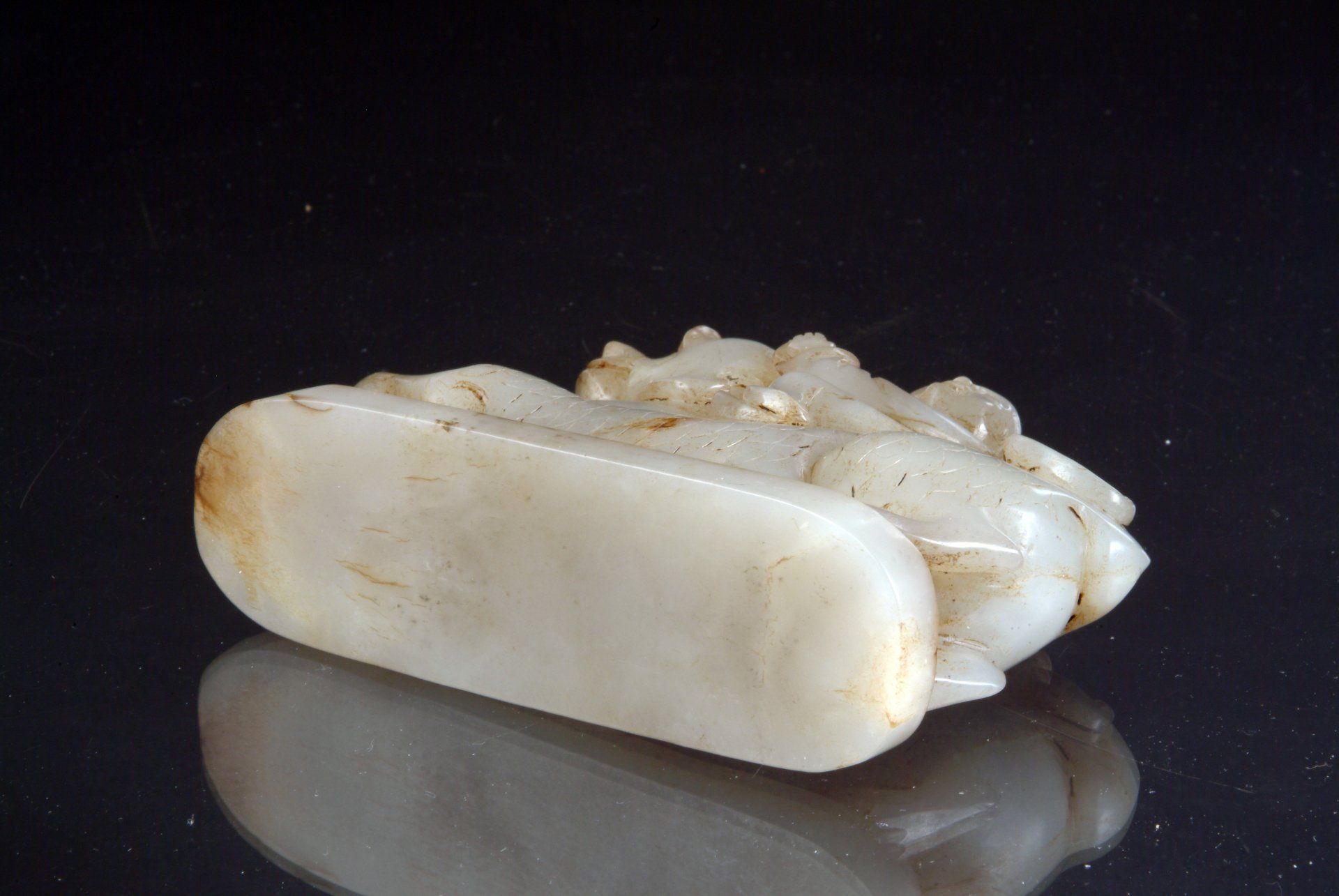Patung kadal putih keabu-abuan dari Dinasti Ming yang dibuat dengan sangat indah ini, menampilkan bayi dan ular, menampilkan kekeruhan dan inklusi warna merah karat yang khas, serta gaya ukiran yang menunjukkan keaslian historisnya. Diameter patung ini sekitar 7,5 cm.