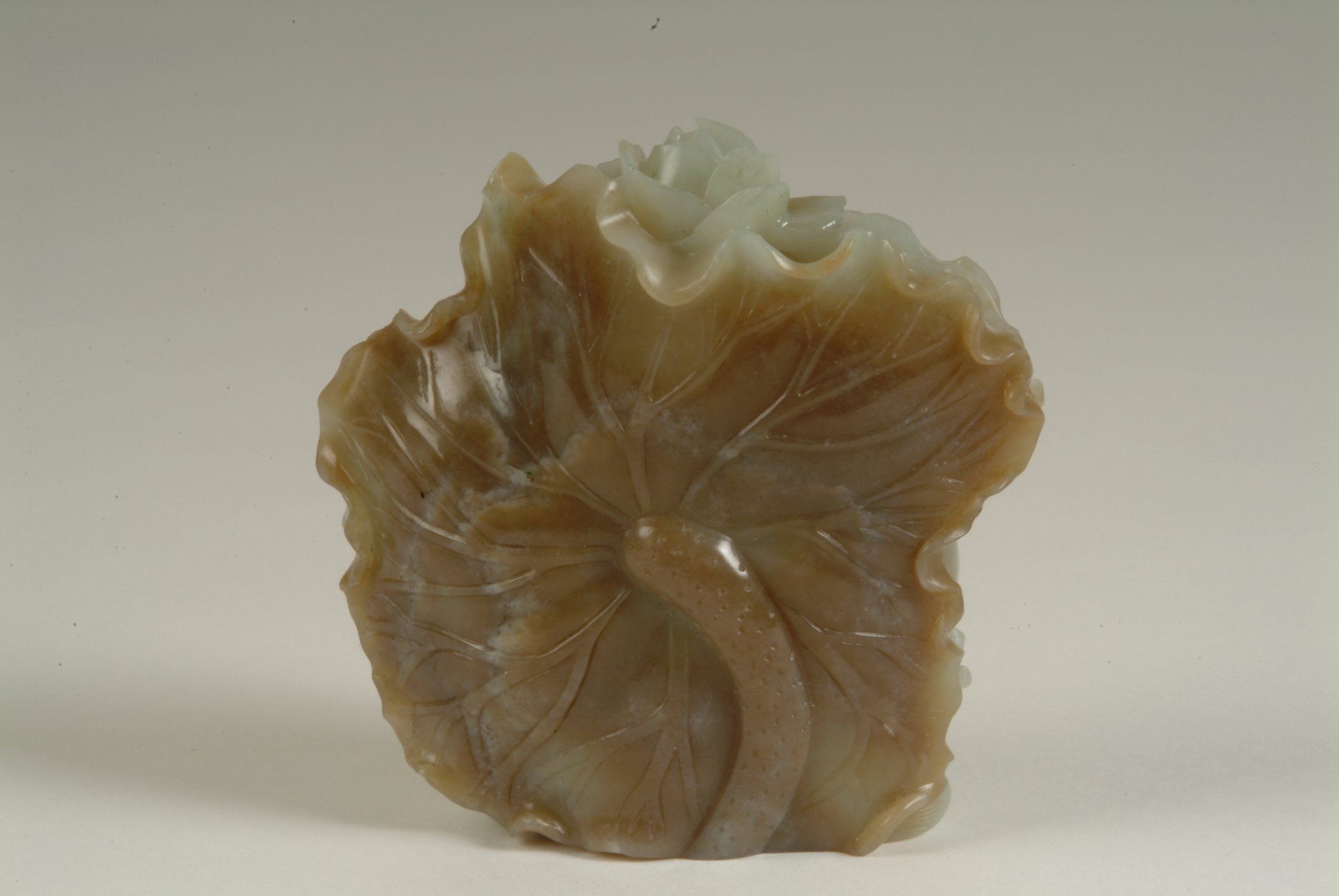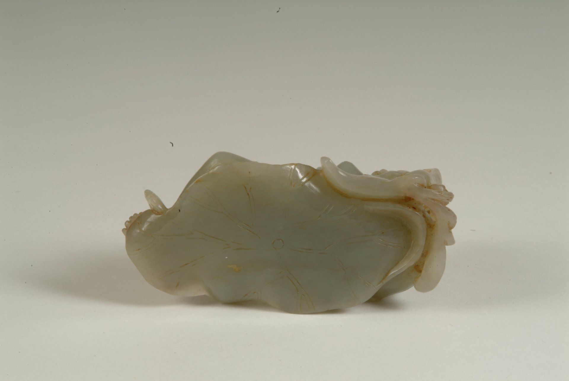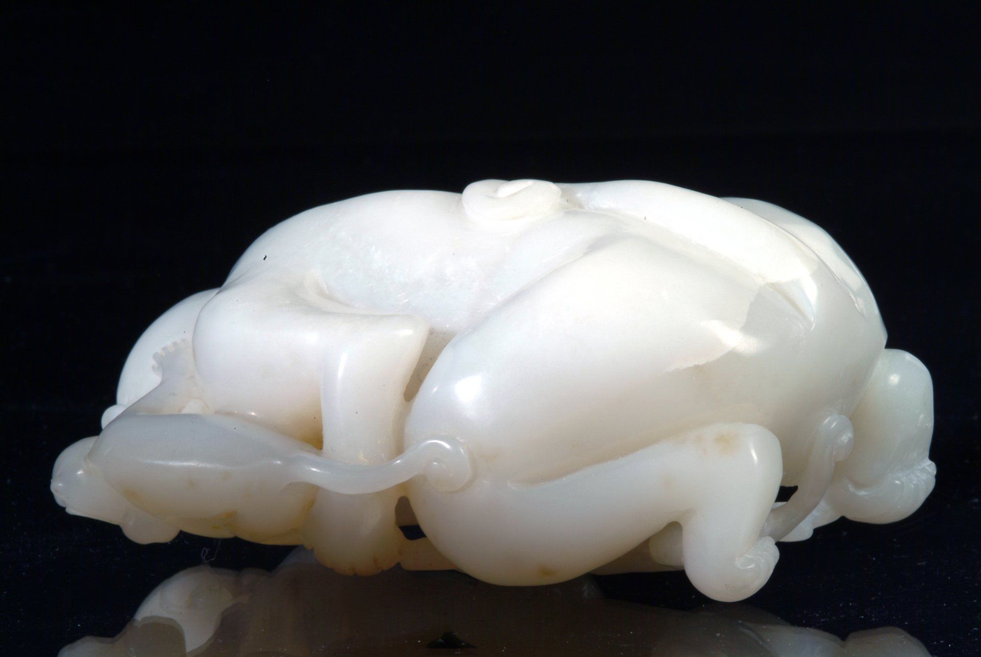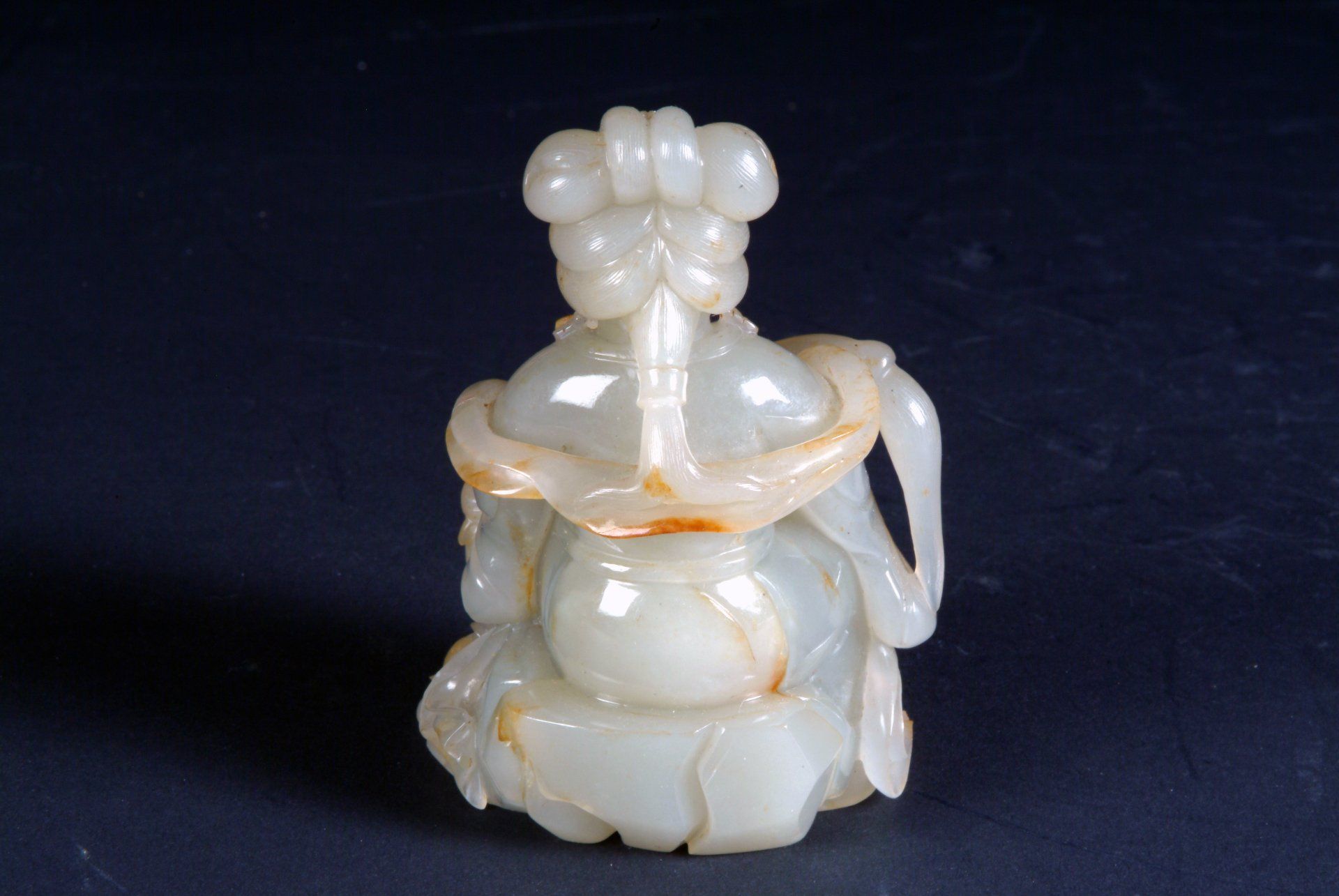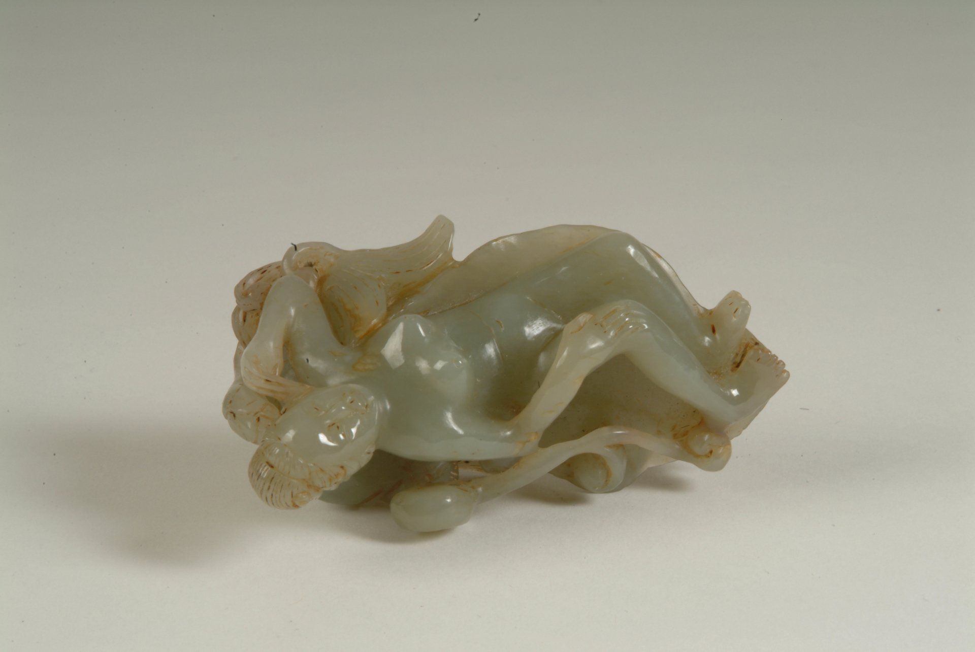 Patung ini, yang berasal dari Dinasti Qing, menampilkan representasi seorang perempuan telanjang yang berbaring di atas daun bersama seekor ikan, terbuat dari batu giok putih keabu-abuan. Patung ini menampilkan inklusi minor dan teknik ukiran yang membuktikan keaslian historisnya. Dimensi patung ini sekitar 7,5 cm.