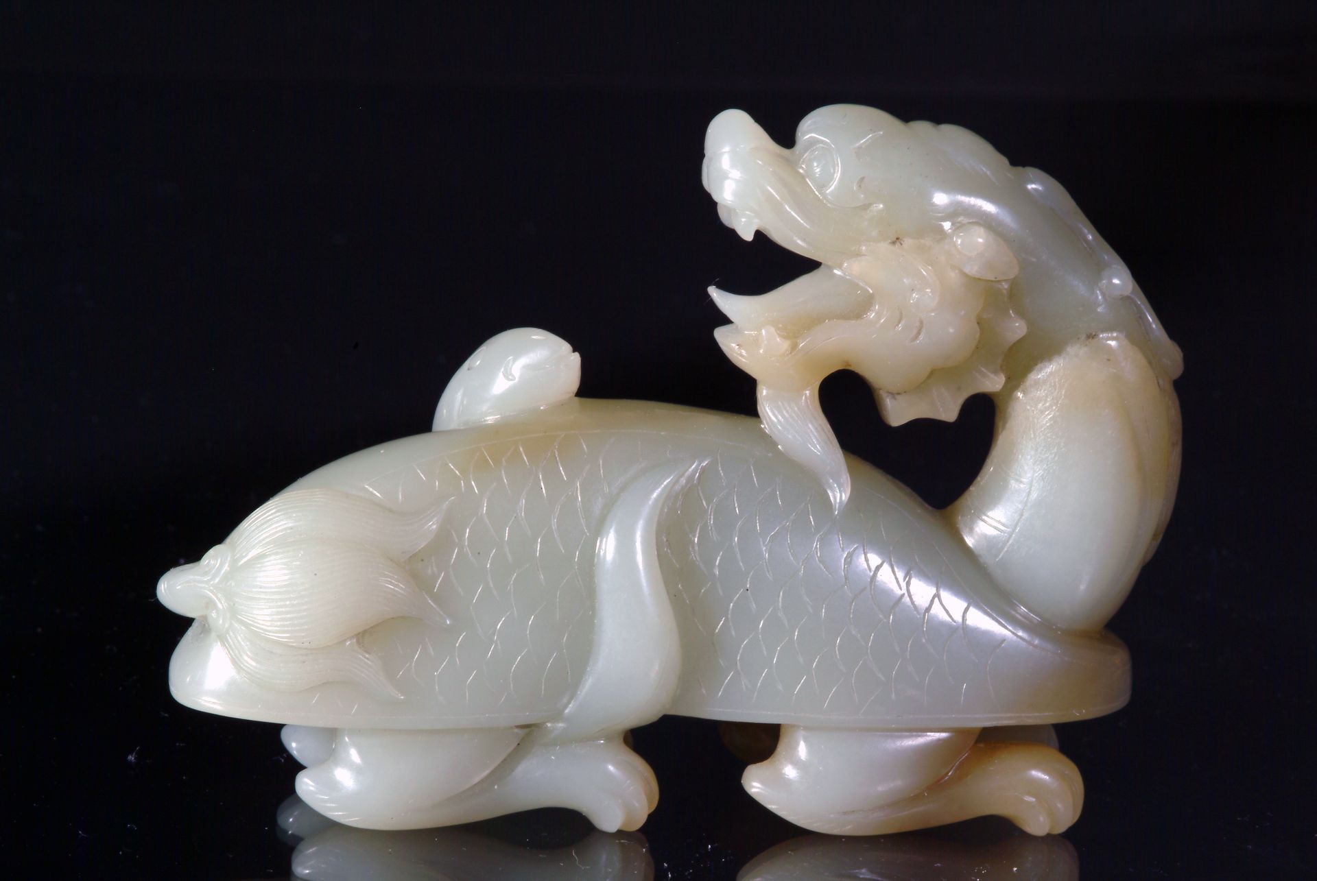 Patung giok putih keabu-abuan dari Dinasti Qing yang dibuat dengan sangat teliti ini menggambarkan seekor ikan mistis yang ditemani seorang anak laki-laki. Patung ini menampilkan area yang sedikit berkabut, dan gaya ukirannya yang khas membuktikan signifikansi historisnya. Panjang patung ini sekitar 3,75 inci.