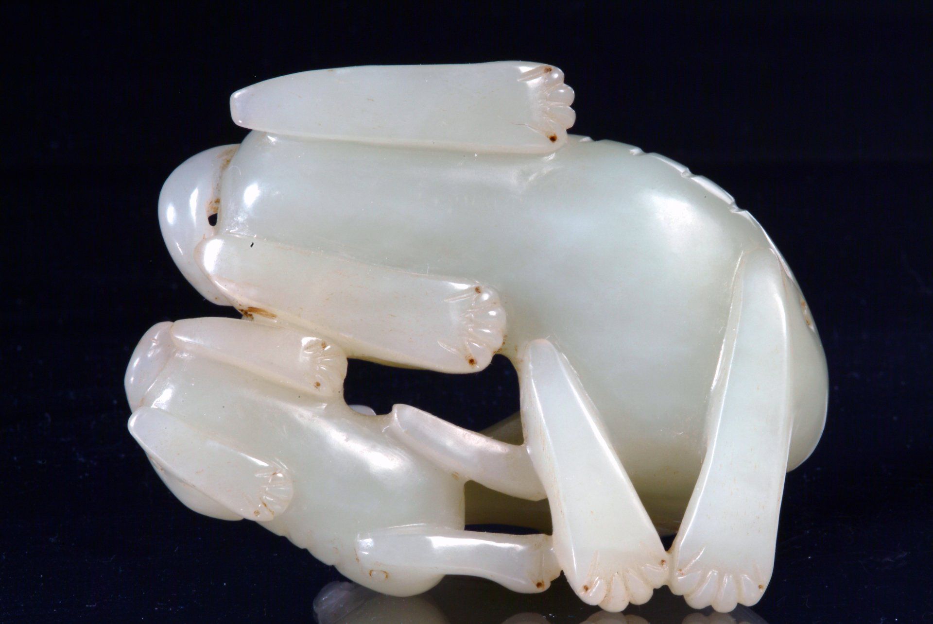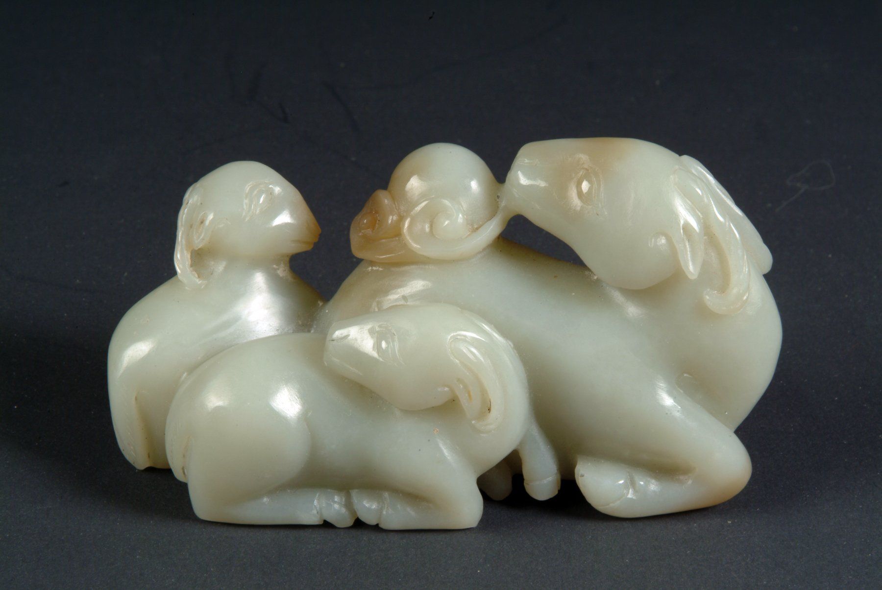 Patung indah ini menggambarkan seekor anjing pemburu dan anak anjing yang diukir dengan sangat halus, terbuat dari batu giok putih transparan dari Dinasti Qing. Patung ini memiliki sedikit inklusi, yang menjadi bukti keaslian dan usianya. Ukiran ini berukuran panjang sekitar 3 1/8 inci.