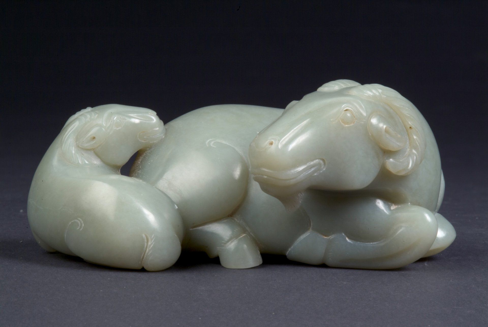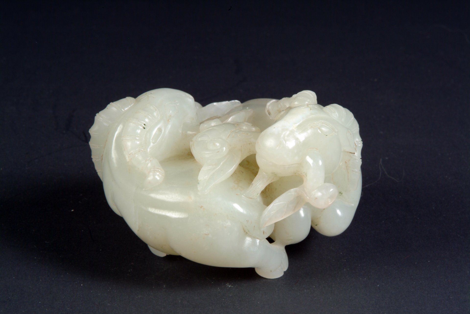 Patung giok abu-abu kehijauan dari Dinasti Qing yang dibuat dengan sangat indah ini menggambarkan seekor kuda yang ditemani seekor monyet. Terkenal karena adanya sentuhan warna cokelat pada monyet tersebut, seni dan teknik ukiran yang digunakan dengan tegas menegaskan asal usulnya. Dimensi keseluruhannya sekitar 3 3/4 inci.