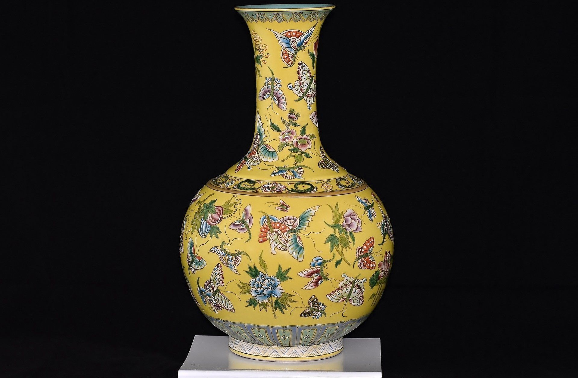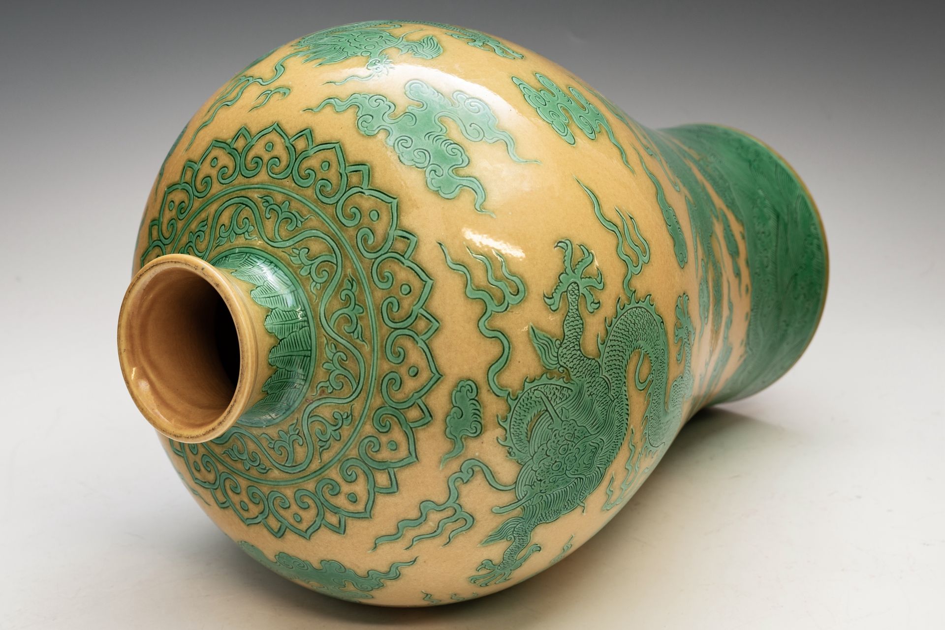 Vas oval nan elok dari Dinasti Qing ini memiliki leher panjang dan khas dengan dasar berwarna kuning cerah yang dihiasi enamel hijau berukir bergambar seekor naga yang sedang mengejar mutiara menyala di tengah awan yang mengepul. Bukti pengelupasan pada biskuit menegaskan keantikannya. Vas ini ditandai dengan segel Qianlong di bawah glasir pada alasnya, selaras dengan motif dekoratif utamanya, sehingga menjadikannya sebagai karya seni otentik dari periode tersebut. Vas ini berdiri kokoh.