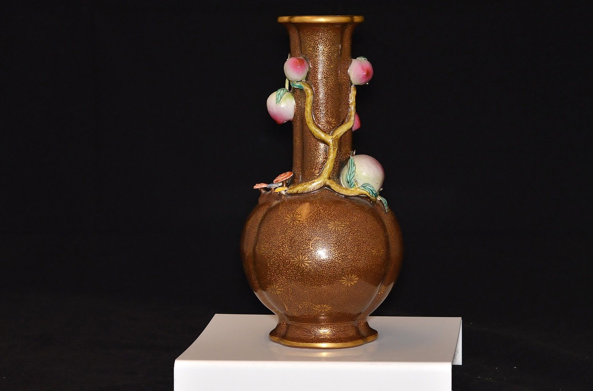 Vas Qianlong Dinasti Qing yang indah ini dibedakan oleh ciri khasnya yang unik dan keaslian zamannya. Vas ini menampilkan glasir cokelat yang kaya, dihiasi dengan cermat dengan sulur-sulur emas dan krisan yang dilukis dengan indah. Selain itu, vas ini menampilkan cabang-cabang, buah persik, daun, dan jamur yang dibentuk dengan rumit dan anggun membungkus permukaannya. Bagian dasarnya diukir dengan tanda segel Qianlong, sementara cincin kakinya menunjukkan tanda-tanda pengelupasan pada biskuit, yang menunjukkan usianya. Vas ini berdiri di