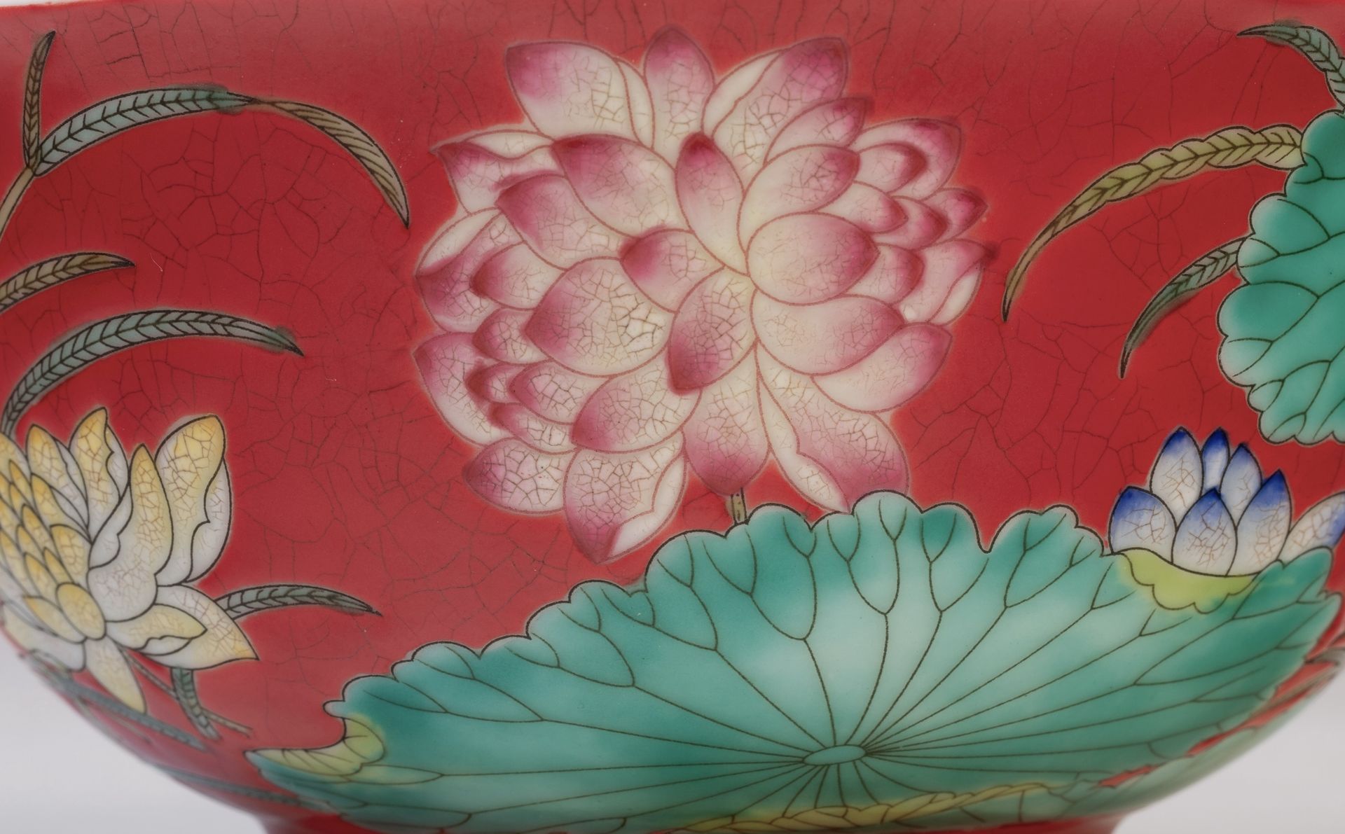 Mangkuk Teratai Zaman Kangxi dengan Dasar Merah Delima dan Enamel Falangcai, Menampilkan Tanda Yuzhi Empat Karakter Biru Terbungkus dalam Kotak Ganda, Dinasti Qing Kekaisaran