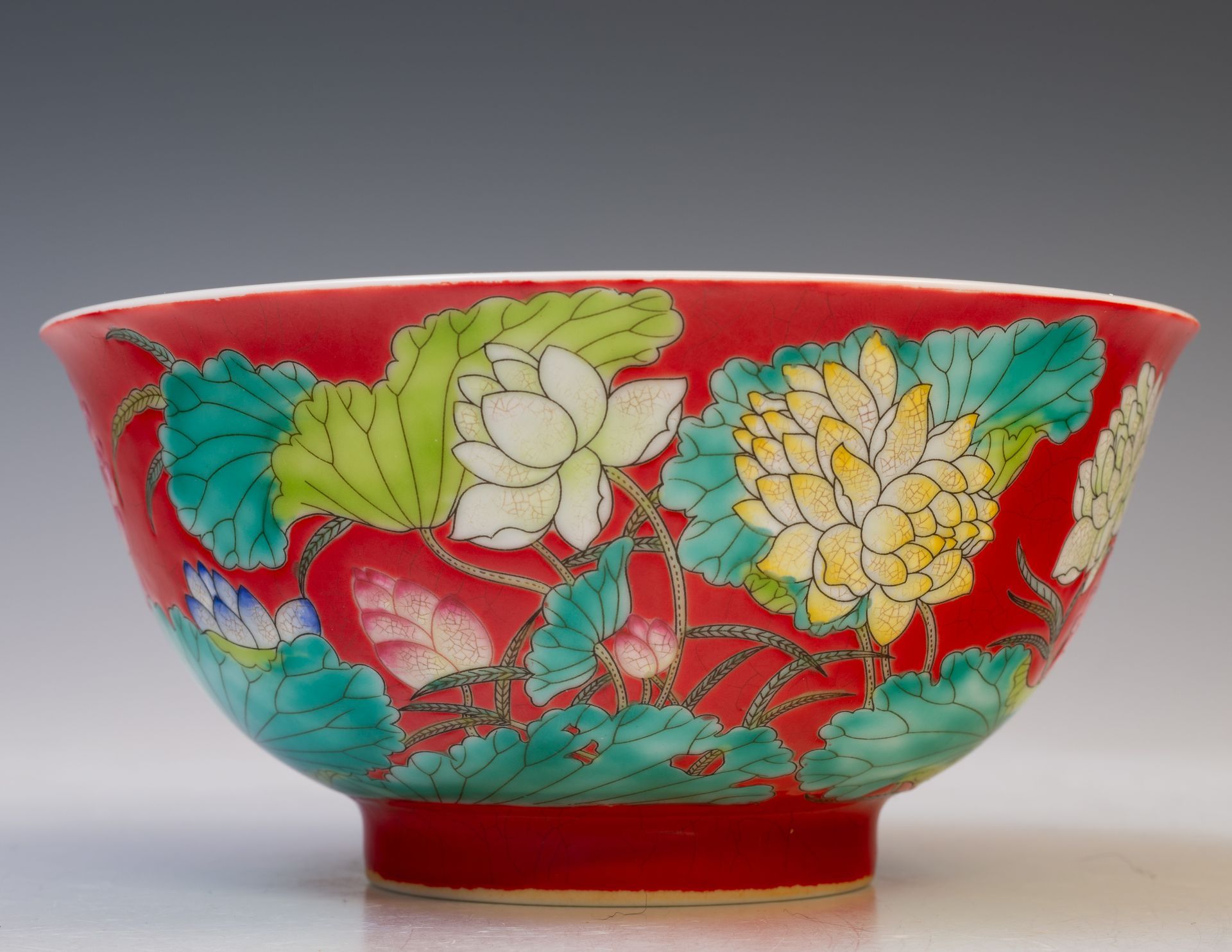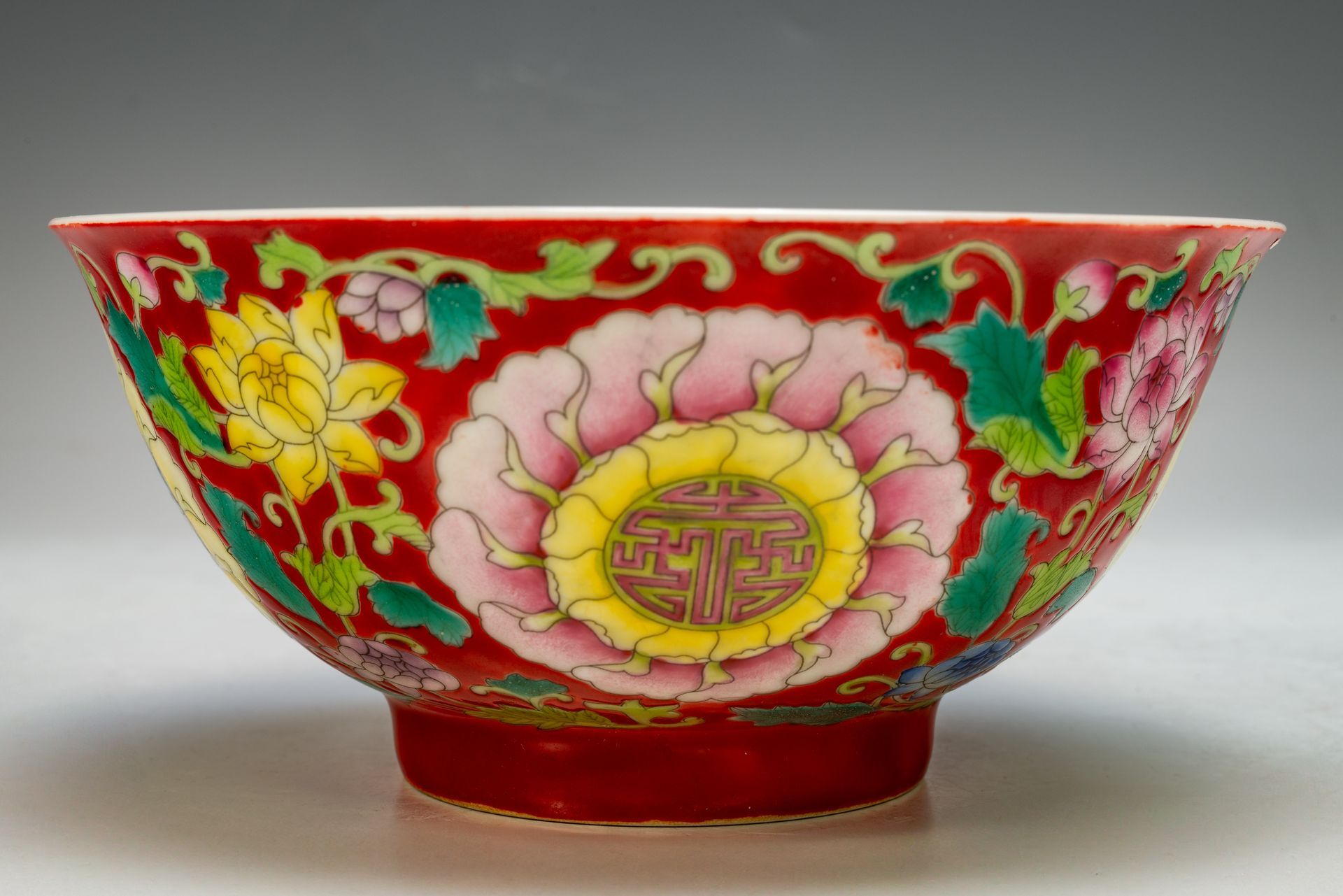 Mangkuk Teratai Kangxi Dinasti Qing Kekaisaran dengan Dasar Merah Delima dan Enamel Falangcai, Menampilkan Tanda Yuzhi Empat Karakter Enamel Ungu & Periode dalam Kotak Ganda