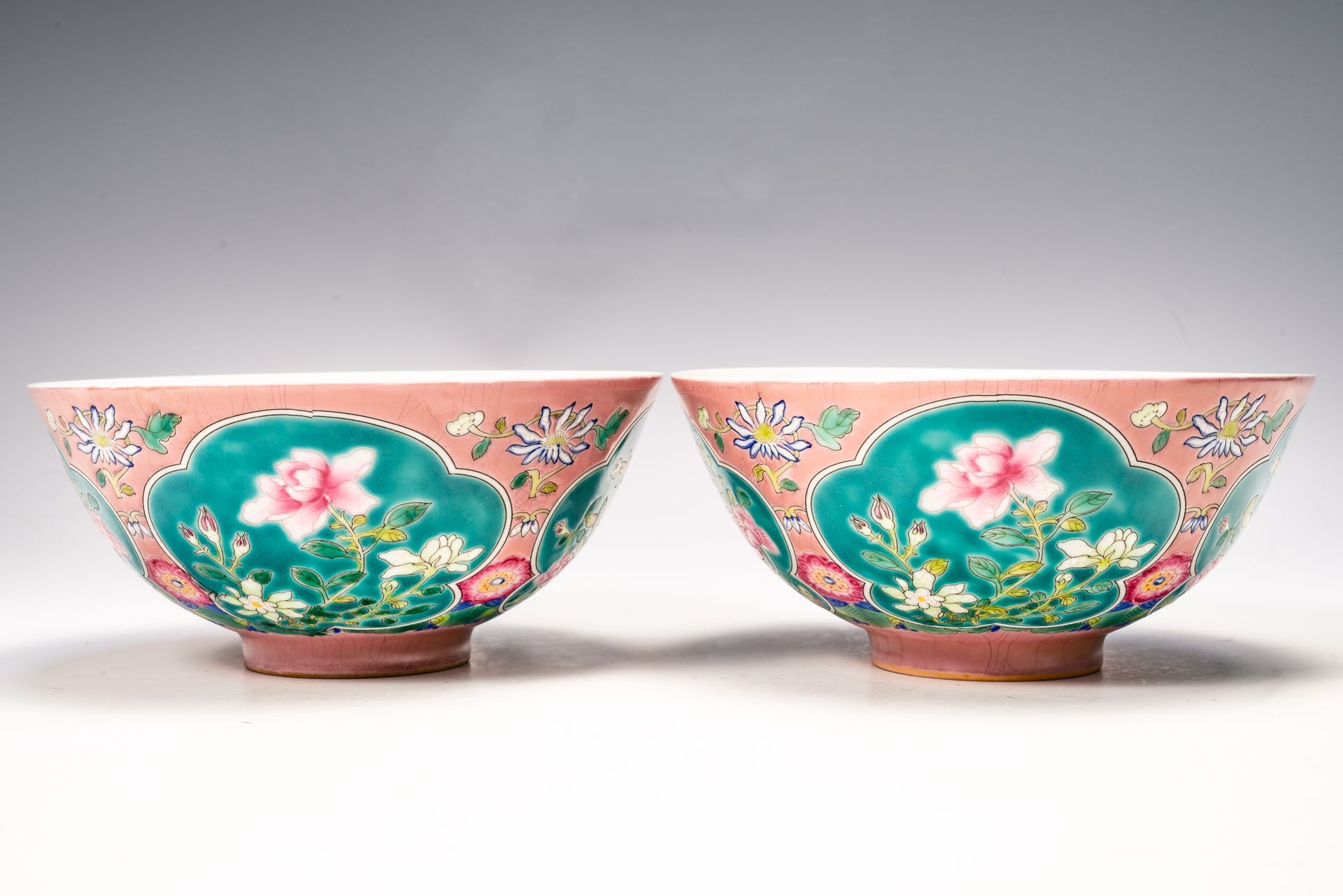 Sepasang Mangkuk Dinasti Qing dari Periode Qianlong dengan Tanda Enam Karakter dan Prasasti Puitis di Bagian Dasarnya, Dibuat dengan Enamel Falangcai